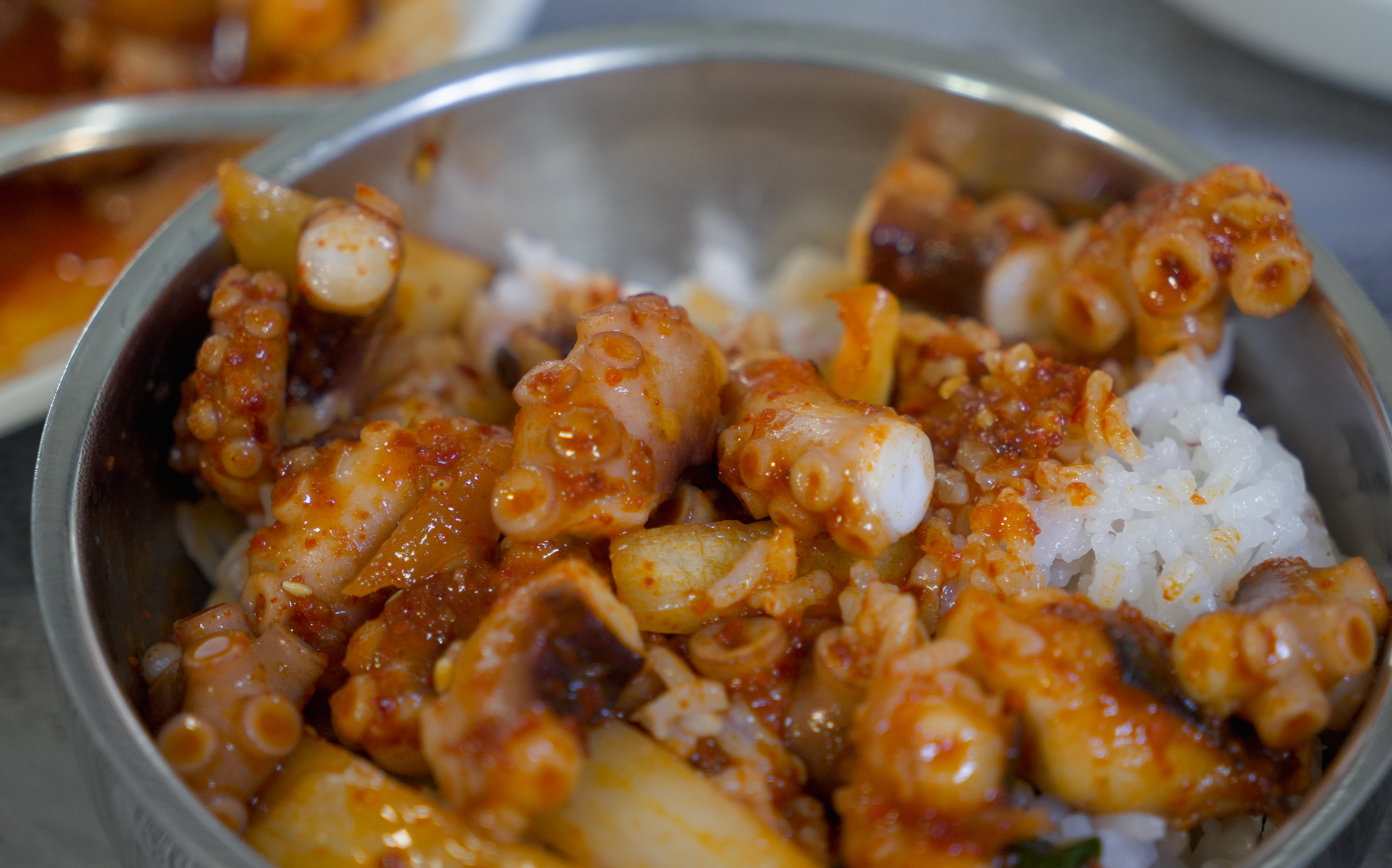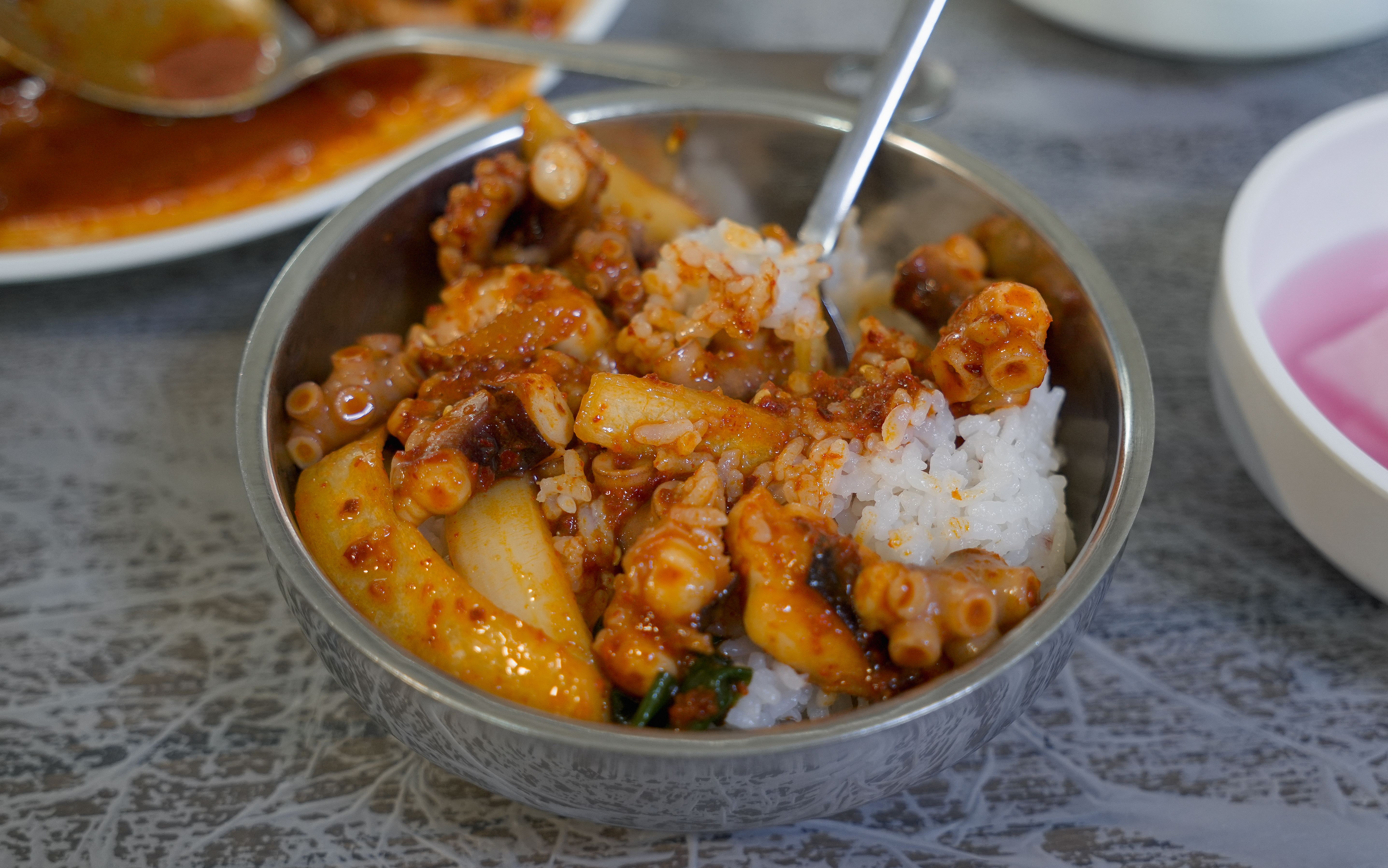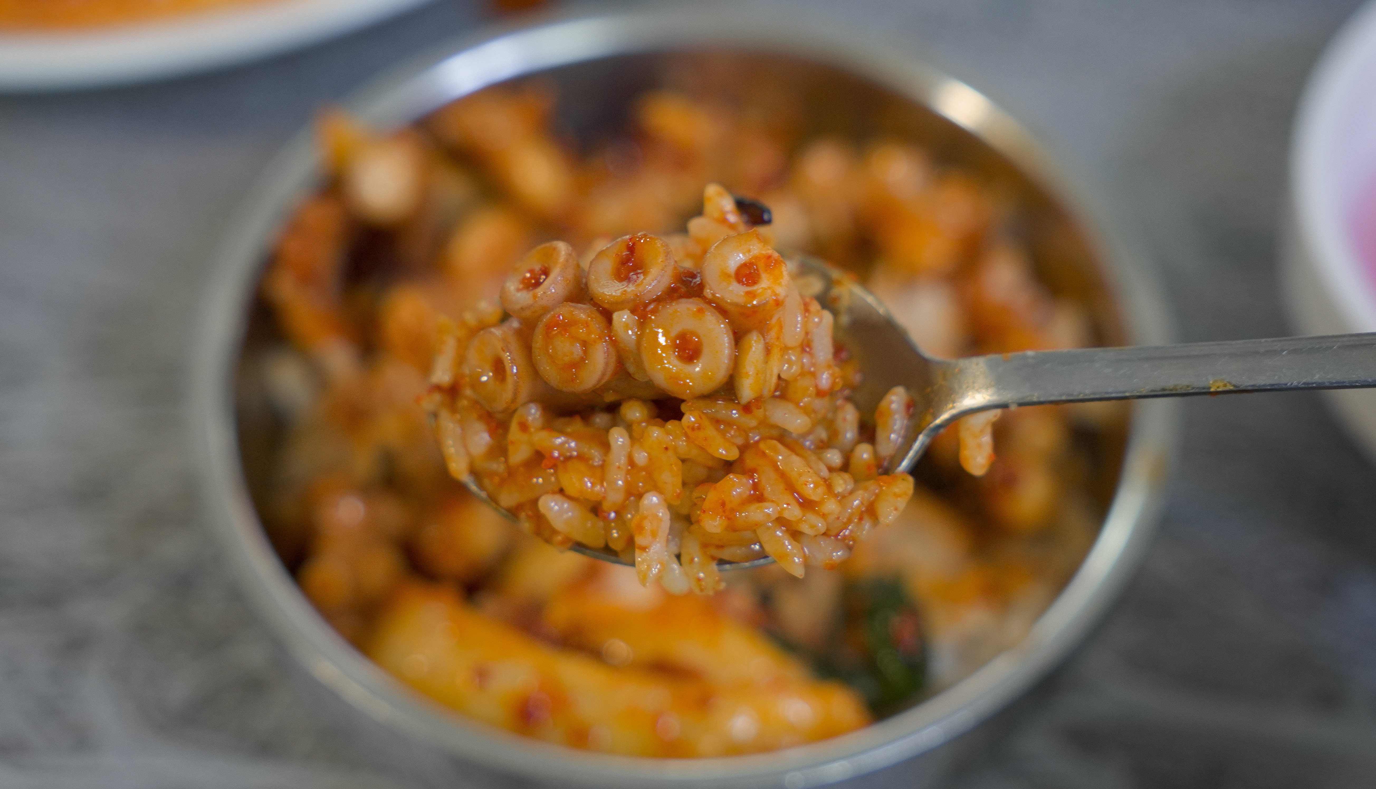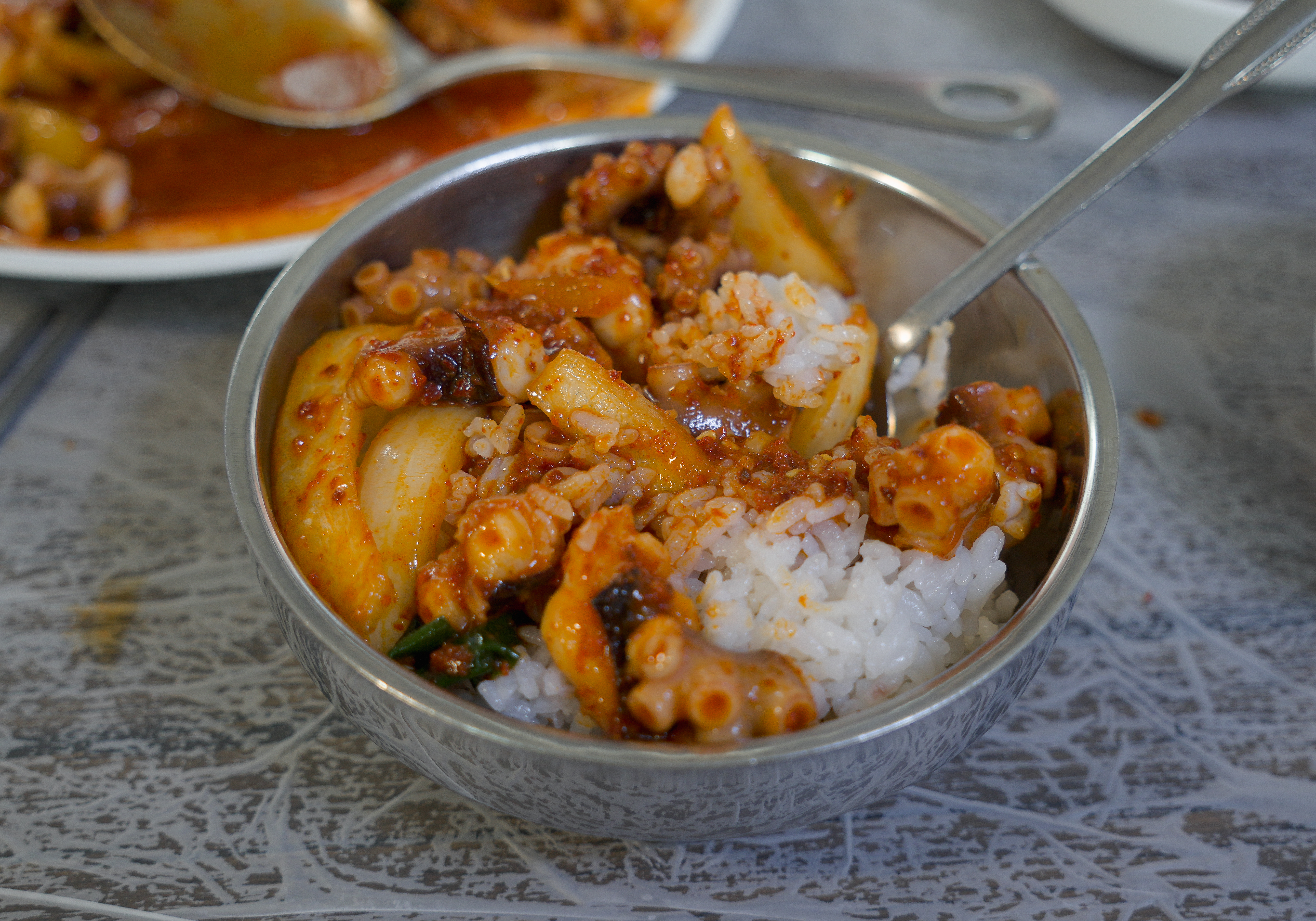 낙지볶음과 같이 곁들여 먹는 밥이 돌솥밥이라 더 찰기있고 맛있었습니다. 낙지볶음비빔밥(?)도 맛있었지만, 김에 같이 곁들여서 싸서 먹으면 해초의 향이 더해져 더 좋았습니다.
