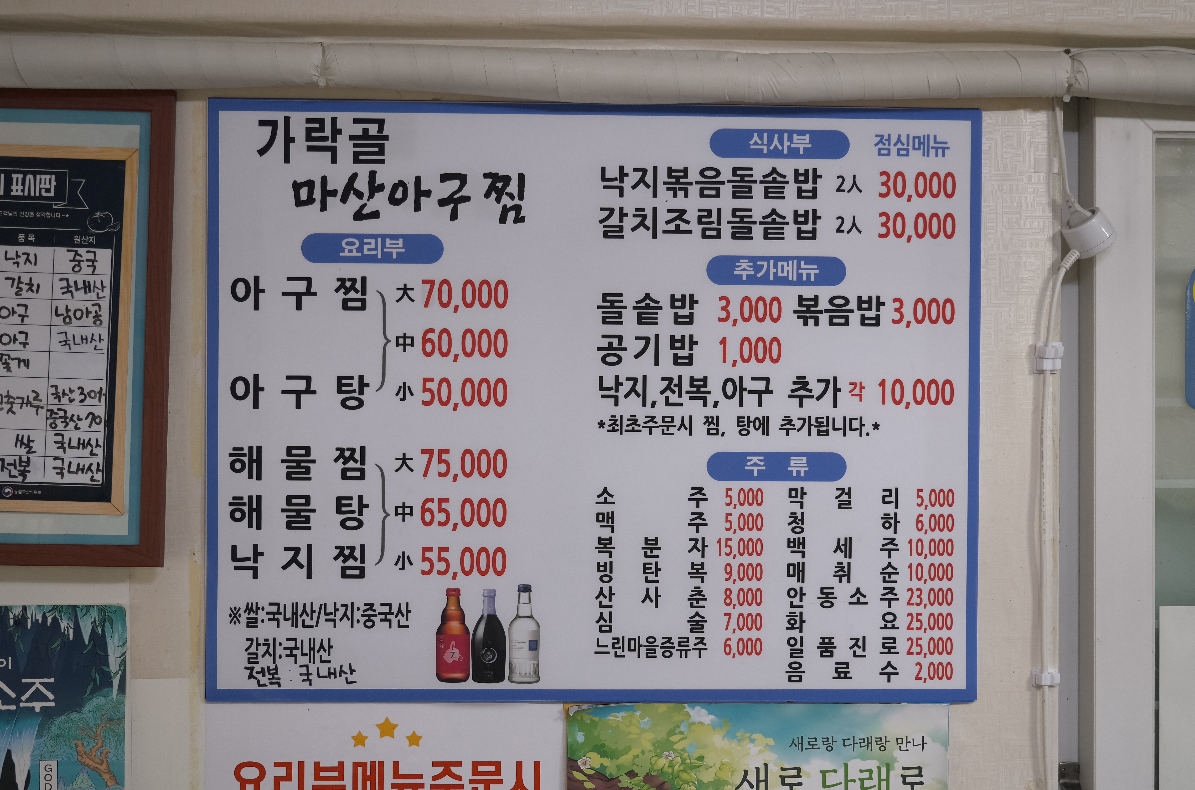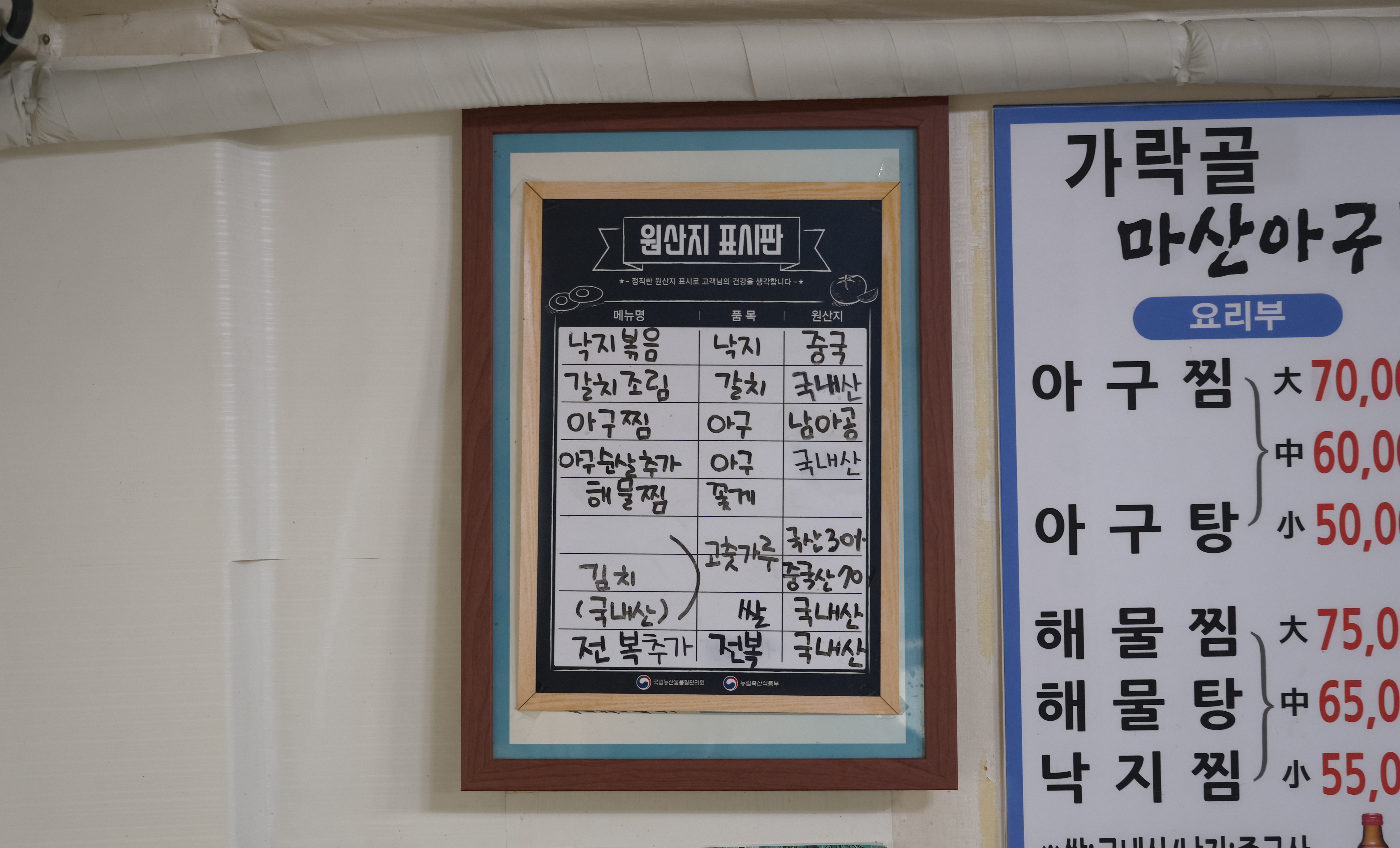 가락동 가락골 마산아구찜의 메뉴는 아구찜, 아구탕, 해물찜, 해물탕, 낙지찜, 낙지볶음돌솥밥, 갈치조림돌솥밥 등이 있었습니다. 원산지 표시를 살펴보면 낙지는 중국산이었고, 갈치는 국내산, 아귀는 남아공, 아귀순살추가는 국내산이라고 합니다.