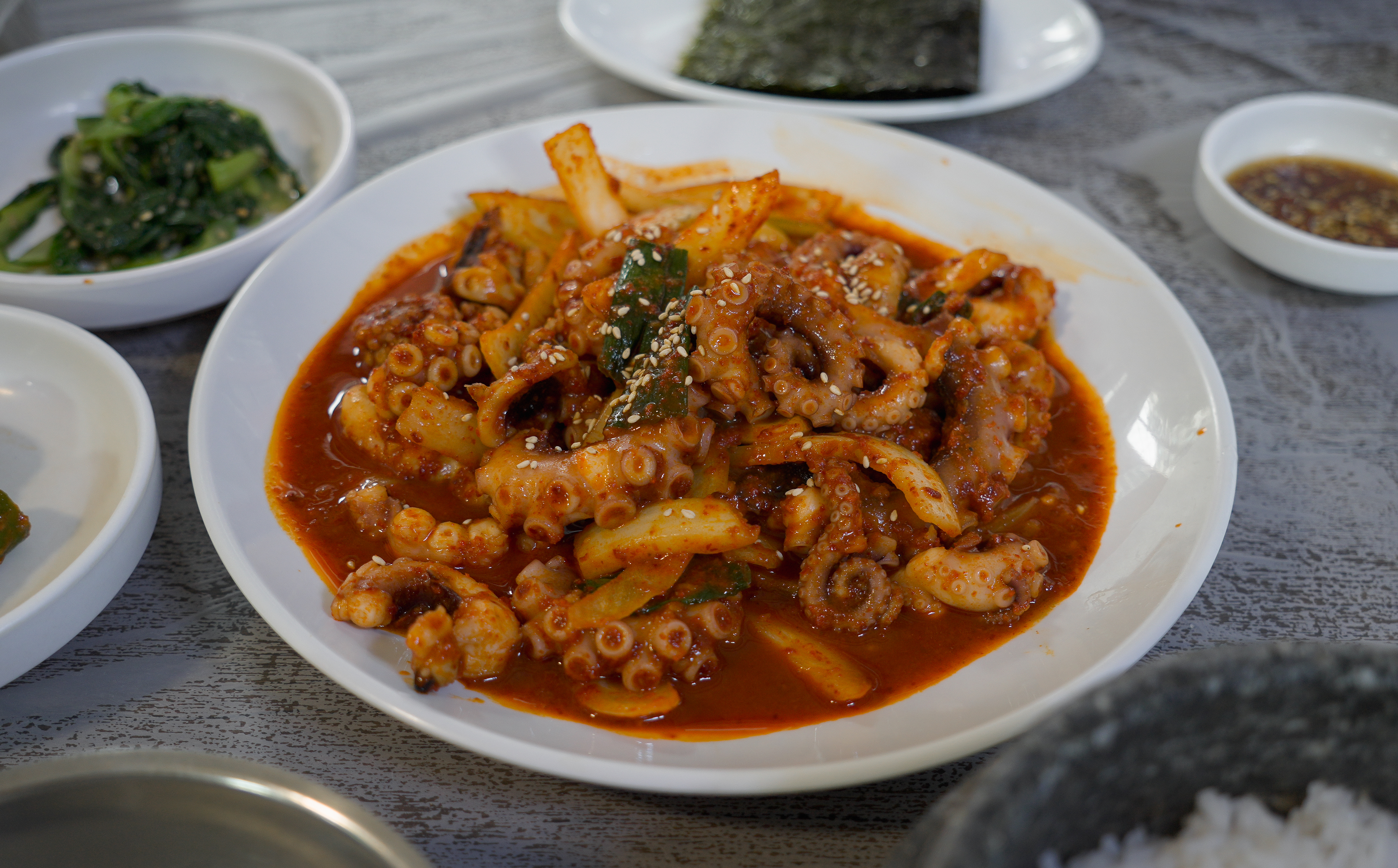 낙지볶음은 소스가 너무 맵지는 않고 적당히 매콤했는데요, 텁텁한 고추장 맛의 양념이라기 보단 깔끔한 느낌이 있었습니다. 특히 대파와 양파가 아삭하게 잘 볶아져 씹히는 식감도 좋았고 채소에서 나오는 채즙과 단맛이 섞여 더 맛있게 느껴졌습니다. 특히 낙지볶음 속 낙지는 굵고 탱글한 식감이 있어서 먹기에 참 좋았습니다.