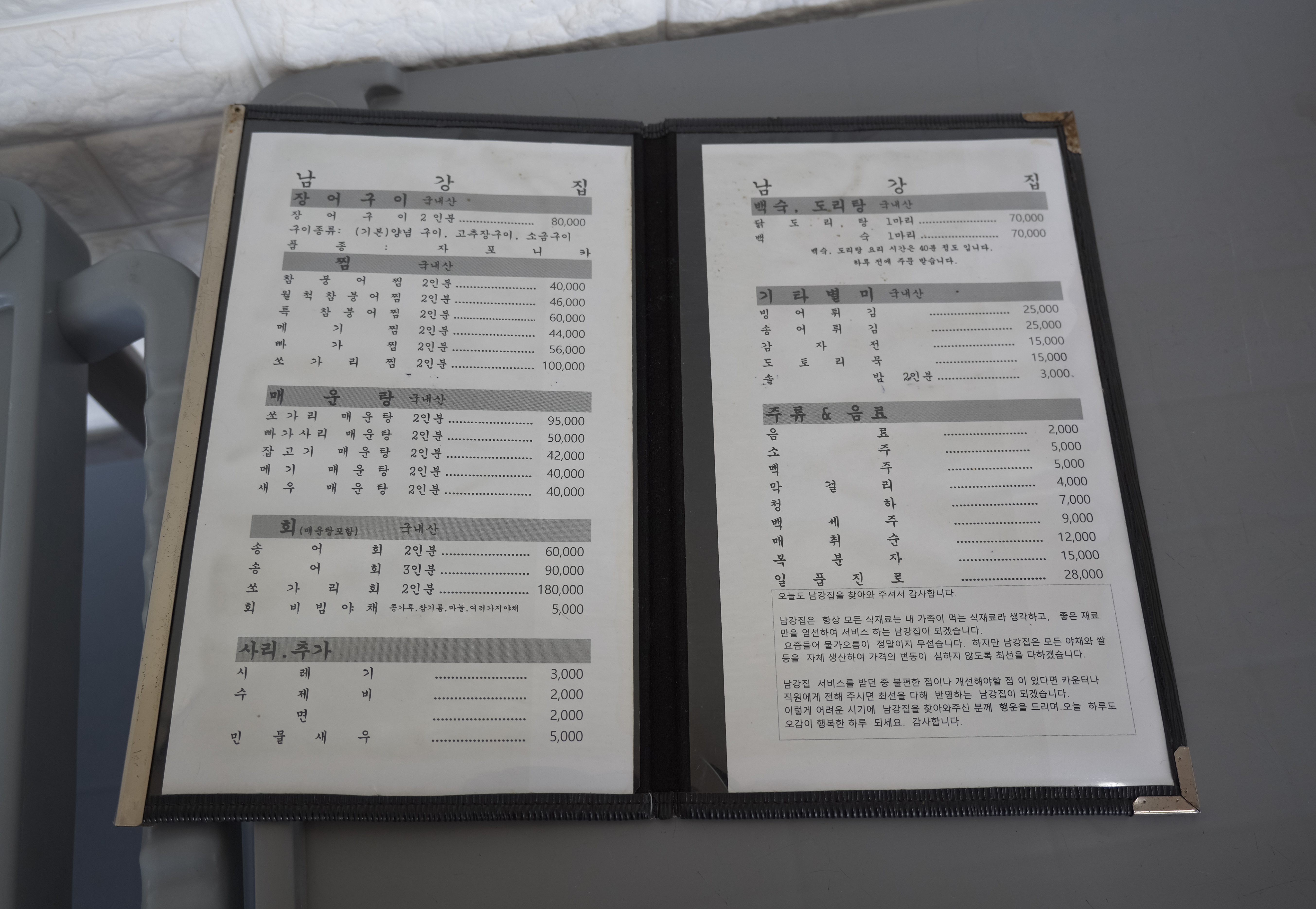 팔당 남강집의 메뉴는 위와 같습니다. 큰 카테고리로 보면 장어구이, 찜, 매운탕, 회, 백숙, 기타별미, 사리추가가 있었습니다. 저희는 매운탕 항목에 있는 메기 매운탕 3인분과 기타별미 항목의 솥밥 2인분을 주문해서 먹었습니다.