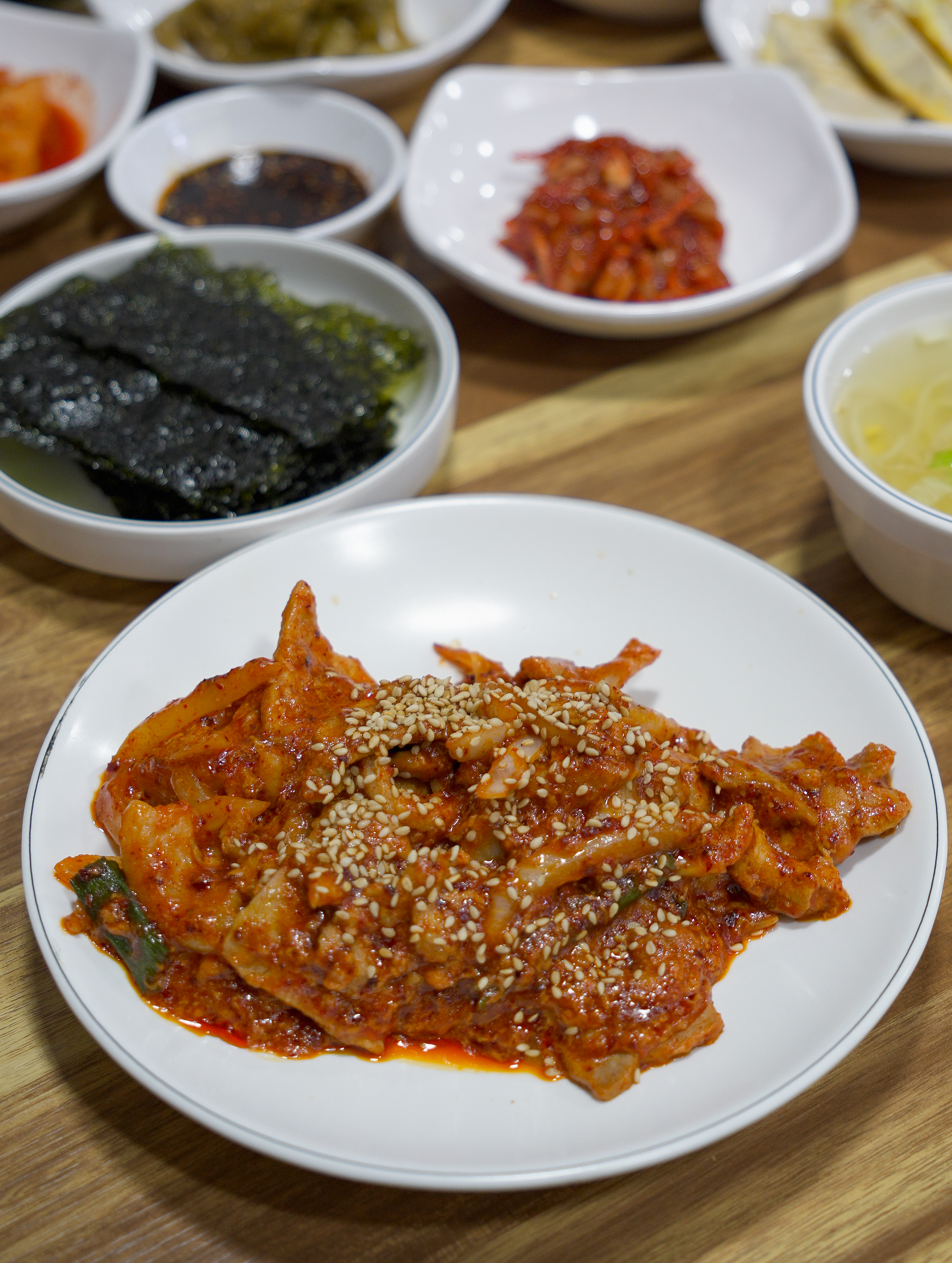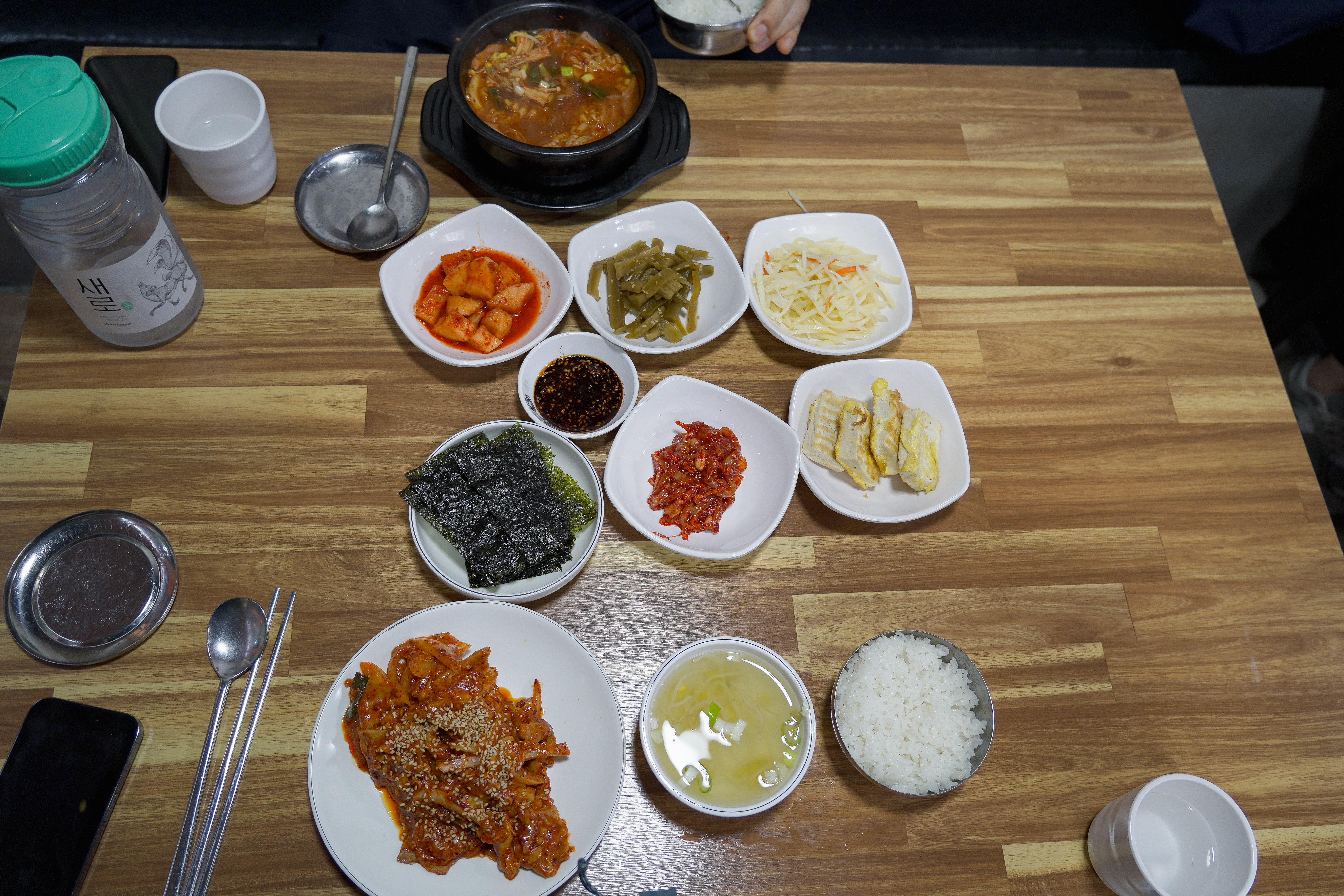 맛고을식당의 주문한 메뉴 부대찌개와 제육볶음이 나왔습니다. 저번에 방문했을때 반찬과 개수는 비슷했는데 다른 반찬들로 교체되었더라고요. 이곳은 매일같이 반찬을 해서 집밥과 같은 다양한 반찬들을 맛볼 수 있다는 것이 참 매력입니다.