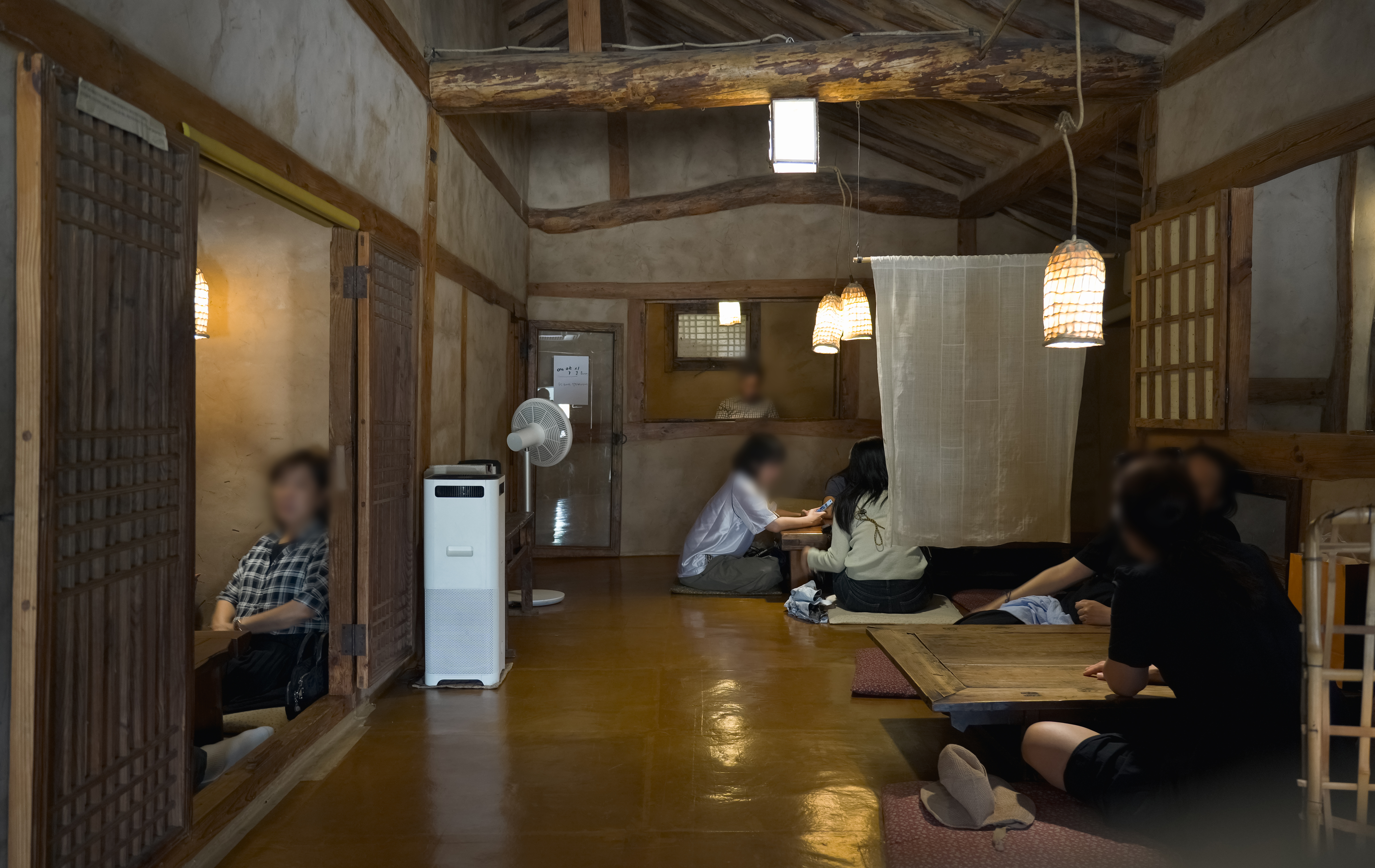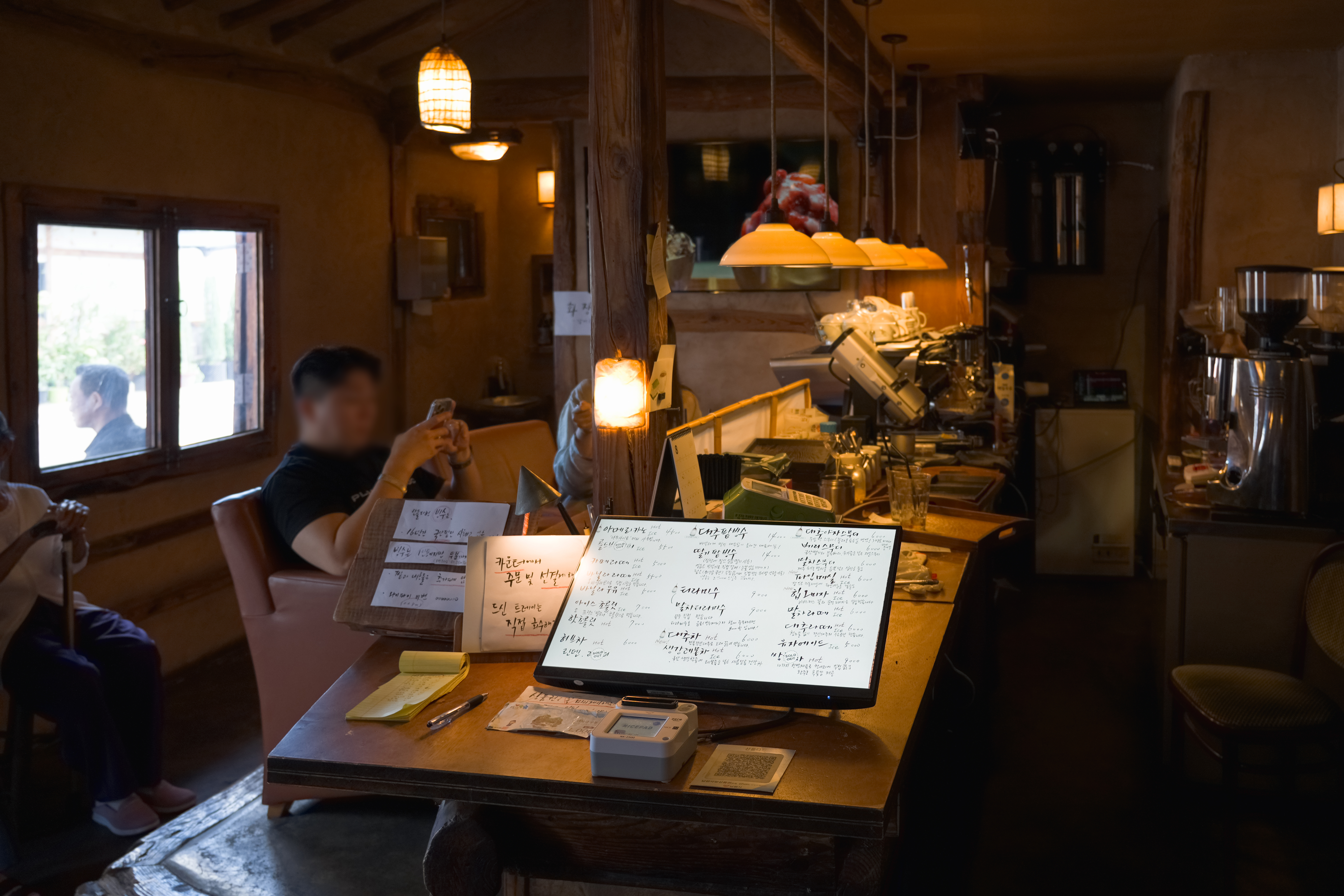 사실, 산들다헌 카페는 독특한 분위기로 유명한 카페였는데요. 황토벽에 기둥과 창틀이 나무로 되어있어 따뜻하고 아늑한 느낌이 있었습니다. 바닥에 앉아서 먹는 테이블도 있었고, 저희가 이용한 것과 같은 입식 테이블도 있었습니다.
