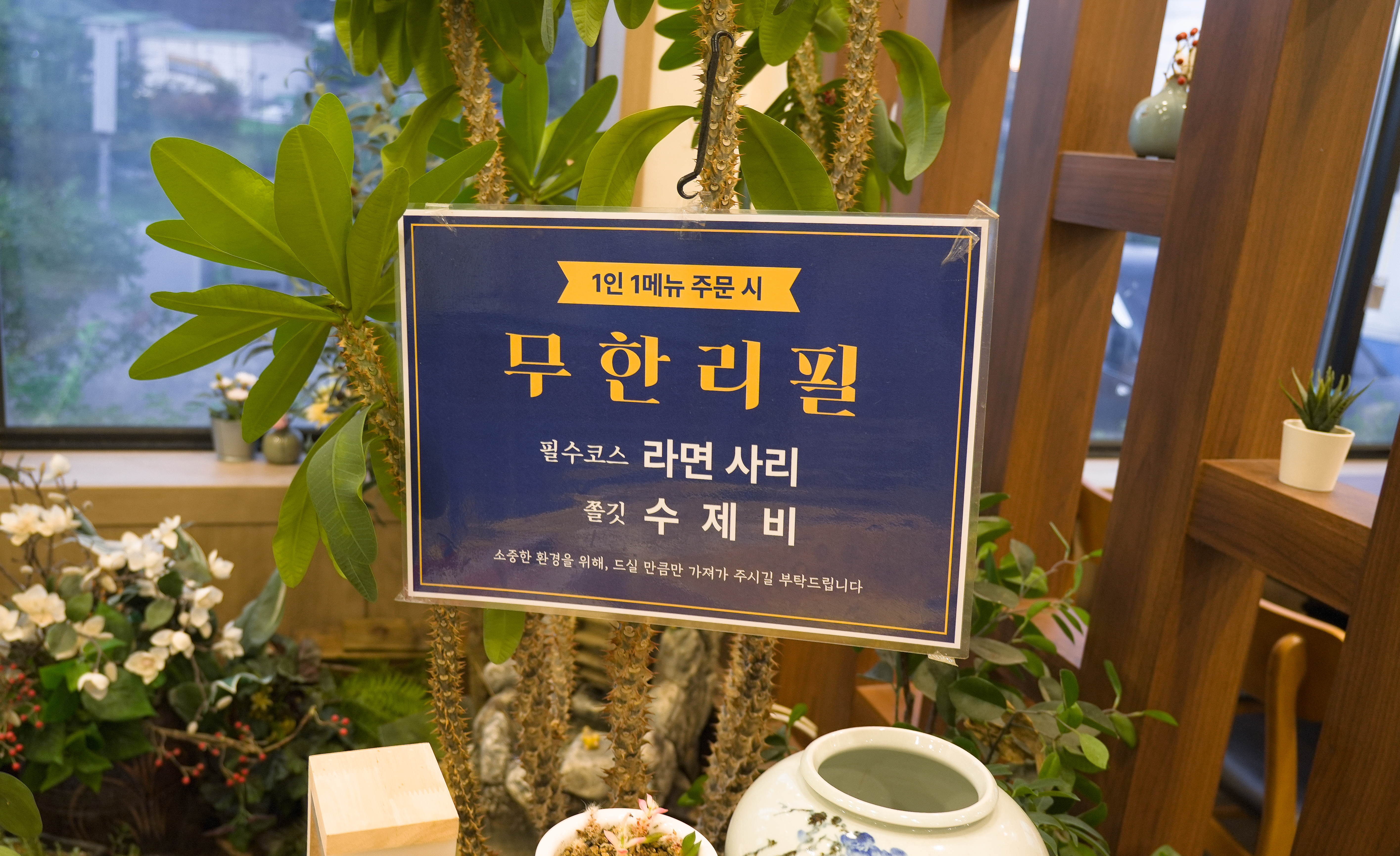추어담은 무한리필로 수제비와 라면사리를 직접 가져다 먹을 수 있었고, 라면사리는 영업종료 시간이 임박해서 그런 건지 없더라고요. 그래도 수제비 사리를 직접 먹을 수 있어서 수제비 사리를 가져왔습니다.