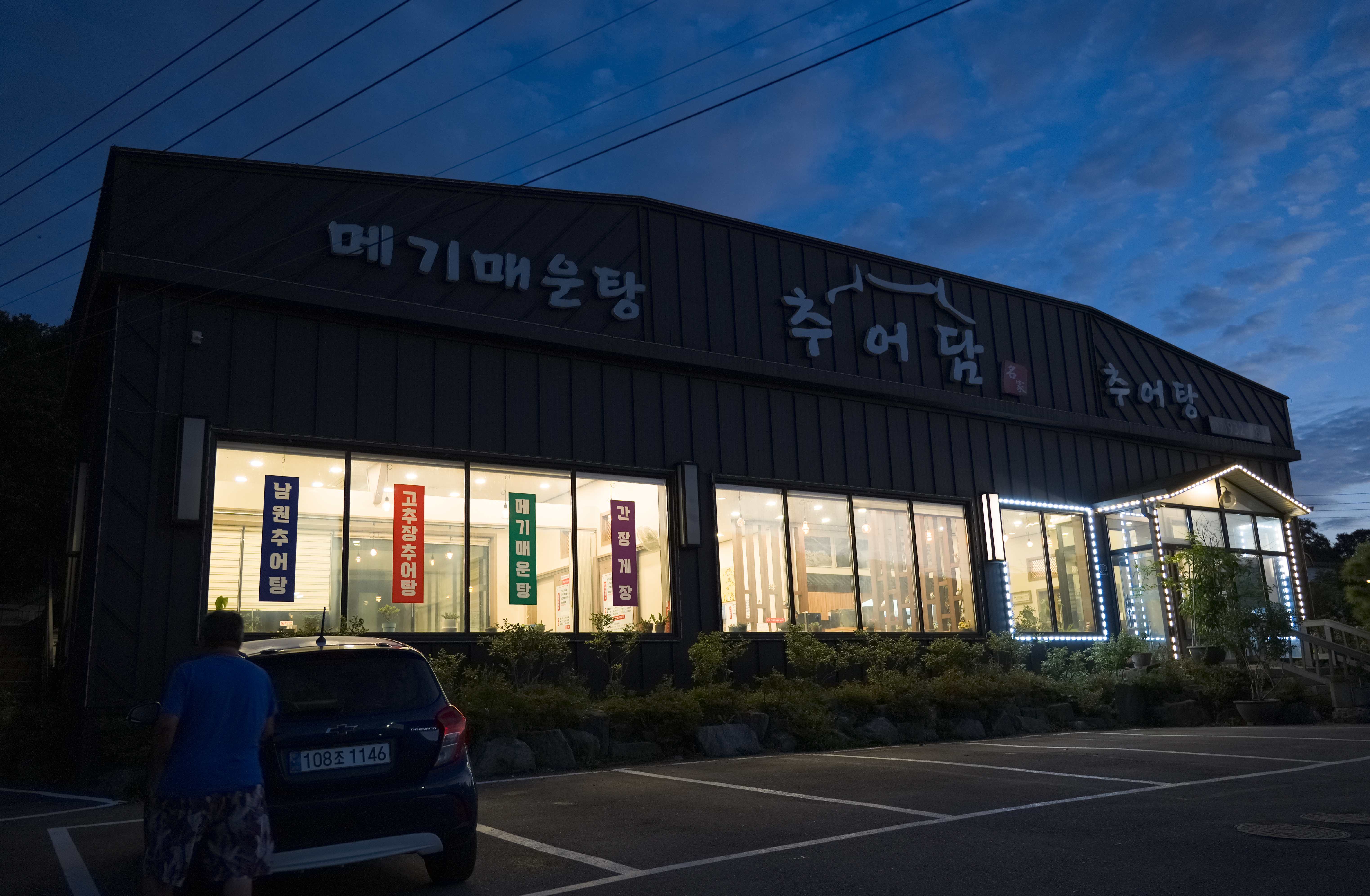 강화도 추어담은 인천 강화군 선원면 선행리 6-1, 1층에 위치해 있었습니다. 이곳은 매주 수요일 정기휴무였으며, 저녁 8시까지 영업하는 가게였습니다. 식사 마치고 나와서 가게 전면 사진을 찍으려 했더니 간판 불을 이미 다 꺼 놔서 어둡게 나왔습니다.