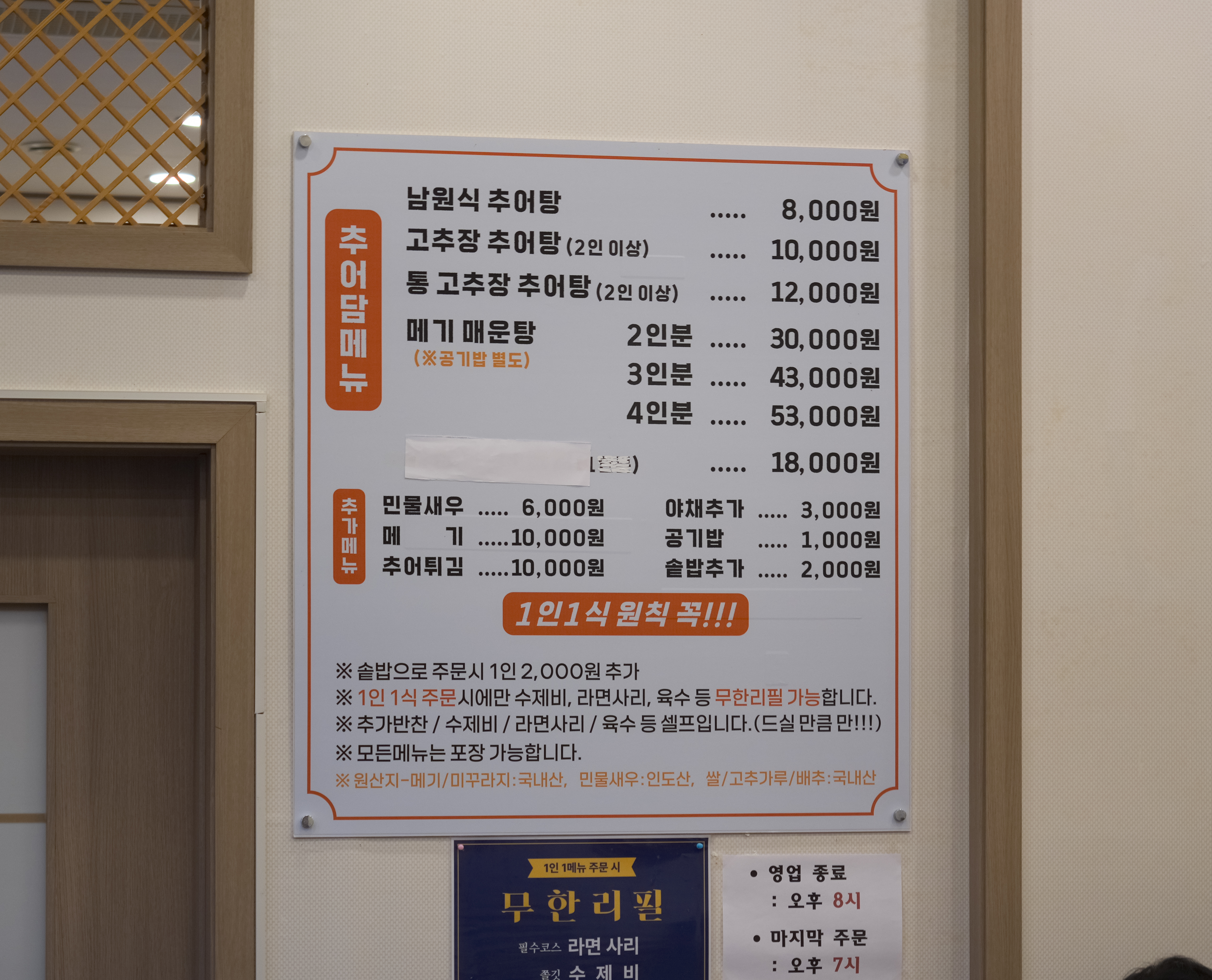 추어담의 메뉴는 남원식추어탕, 고추장추어탕, 통고추장추어탕, 메기매운탕, 민물새우, 메기, 추어튀김, 야채추가, 솥밥추가 등이 있었습니다. 강화 추어담의 영업종료는 20:00 였고, 마지막 주문은 19:00 였습니다.