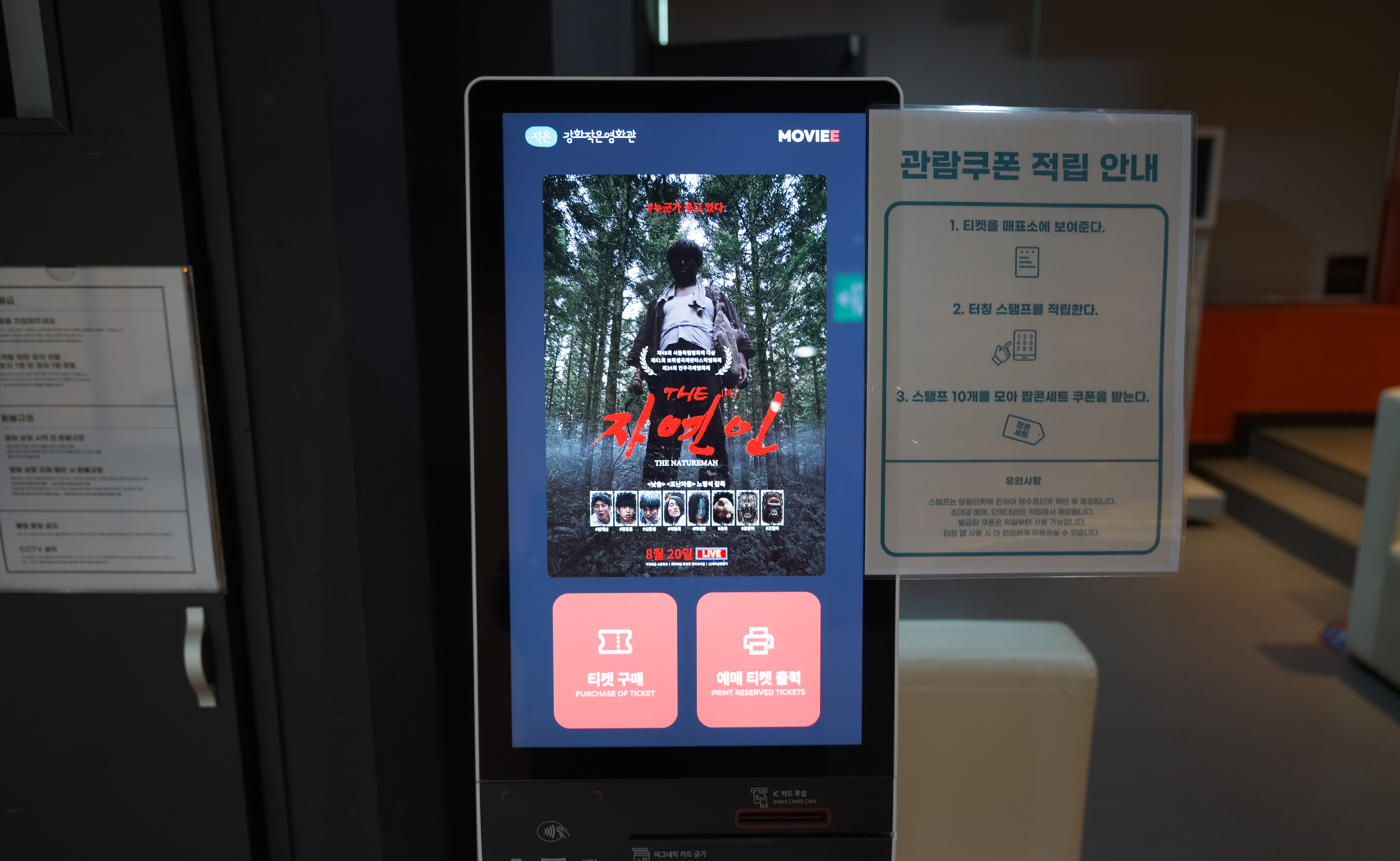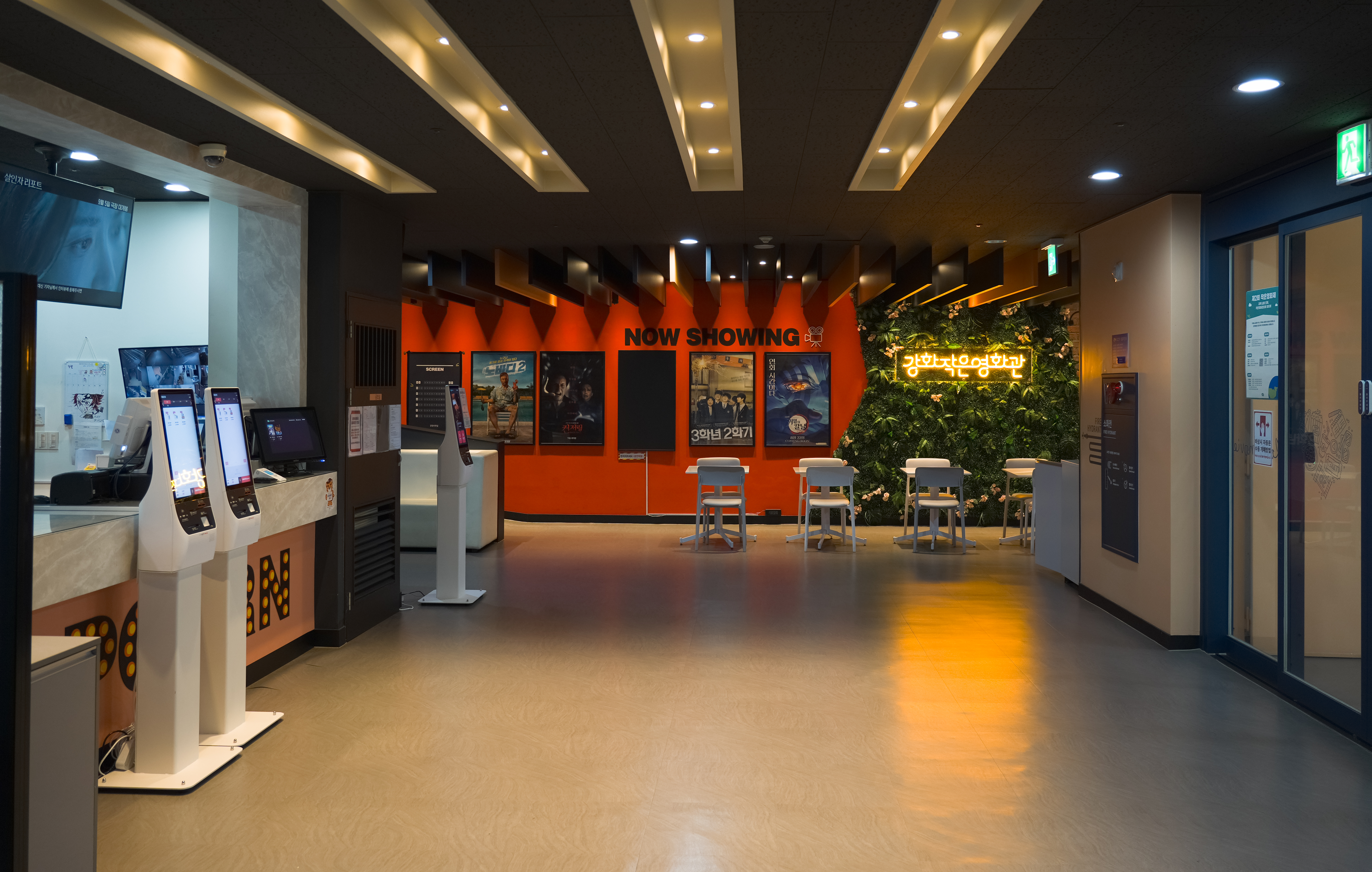 강화문예회관 2층 강화작은영화관은 10:00-22:00까지 운영하고 있었고, 영화 예매는 영화관 내 키오스크나 인터넷 예매가 가능했습니다. 매점도 잘 갖추고 있어서, 팝콘이나 핫도그, 나쵸같은 간식거리를 구입할 수도 있었습니다.