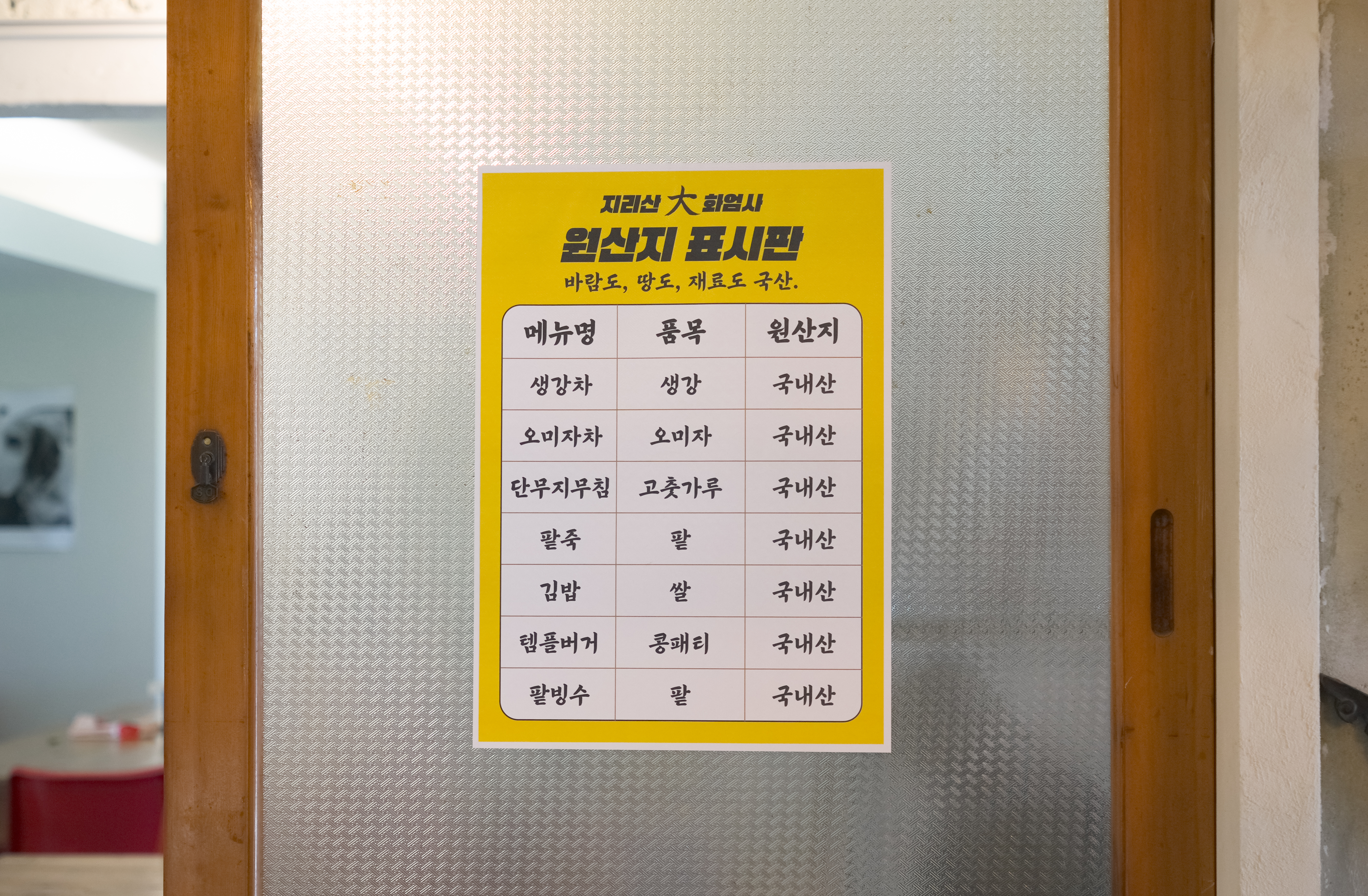화엄사 템플버거의 메뉴를 살펴보겠습니다. 템플버거, 젤라또, 게이샤아이스아메리카노, 게이샤아이스커피, 쌍화차, 오미자차, 생강차, 비빔팥빙수, 팥죽 등이 있었습니다. 원산지 표시를 보면 템플버거는 콩패티가 들어간다는 것을 확인할 수 있었습니다. 그밖에 김밥? 과 단무지무침? 도 있는 것을 보면 김밥이 메뉴에 있었나 봅니다.