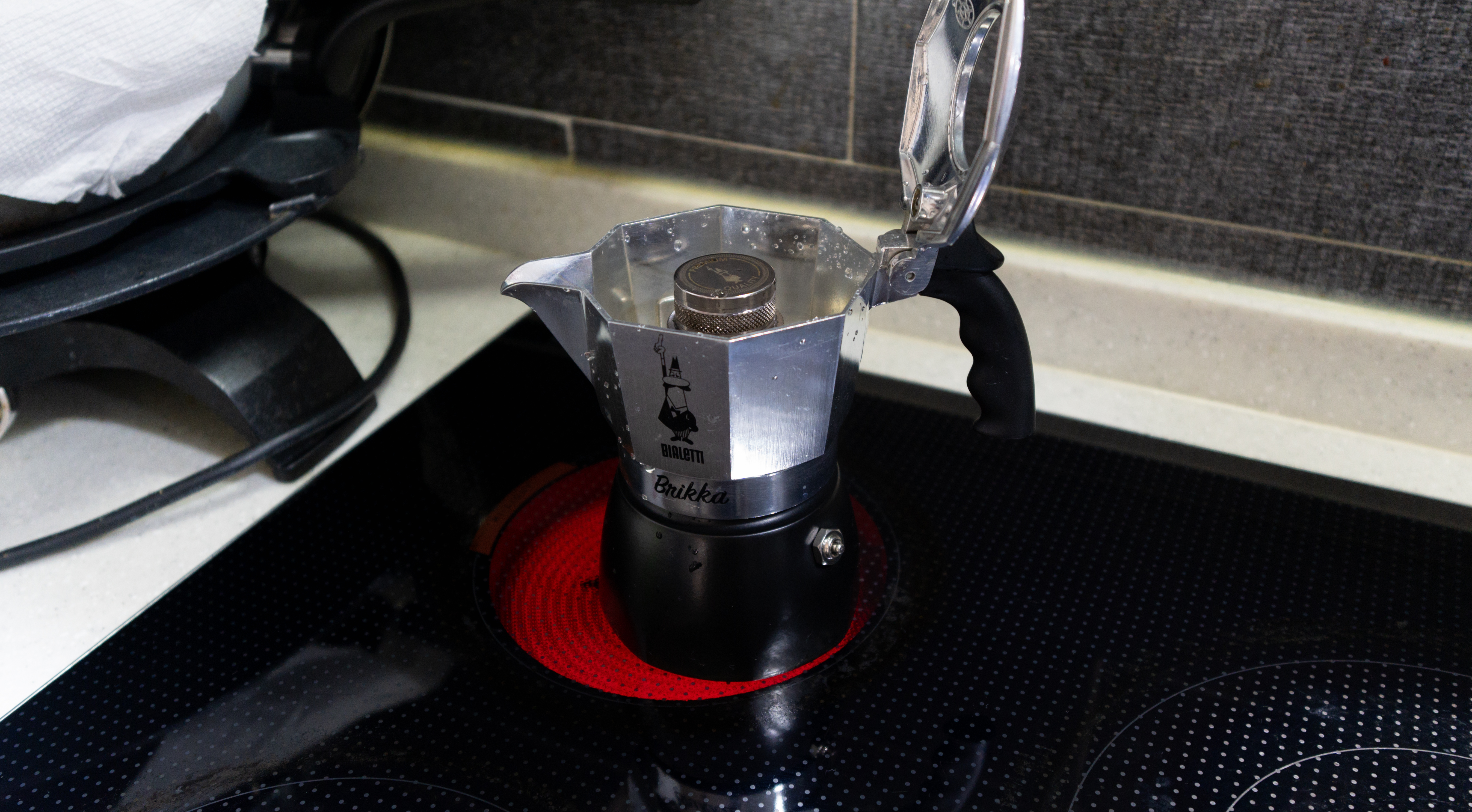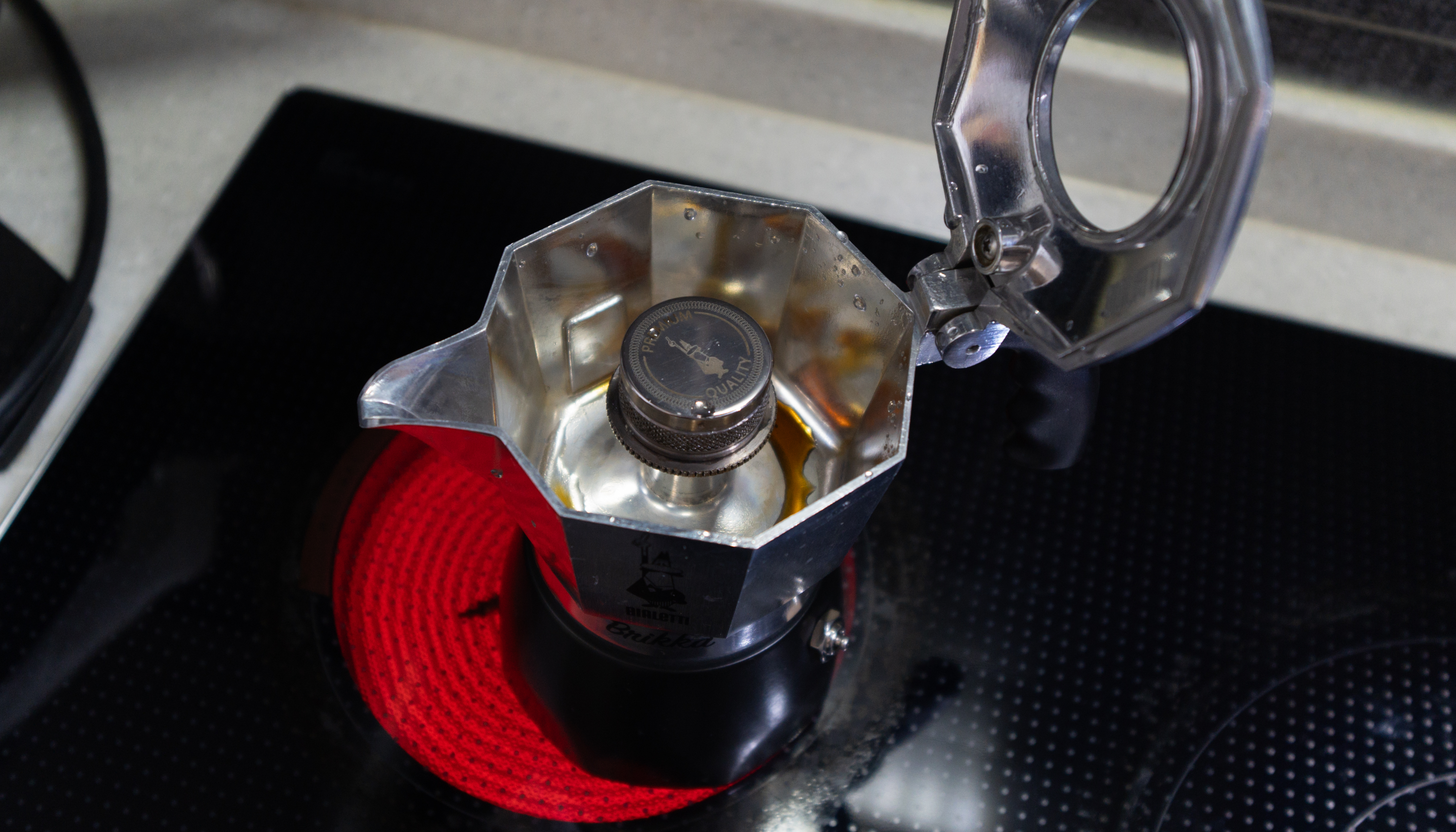 이제 아래서부터 물탱크, 커피 바스켓, 주전자 순으로 조립해 주고 불에 올립니다. 저는 제일 작은 화구에 최대로 불을 올려놓고 에스프레소를 추출하고 있습니다. 주전자의 손잡이는 열원에 녹을 수 있으므로 가급적 열원 밖으로 나오게 해 주면 좋습니다.