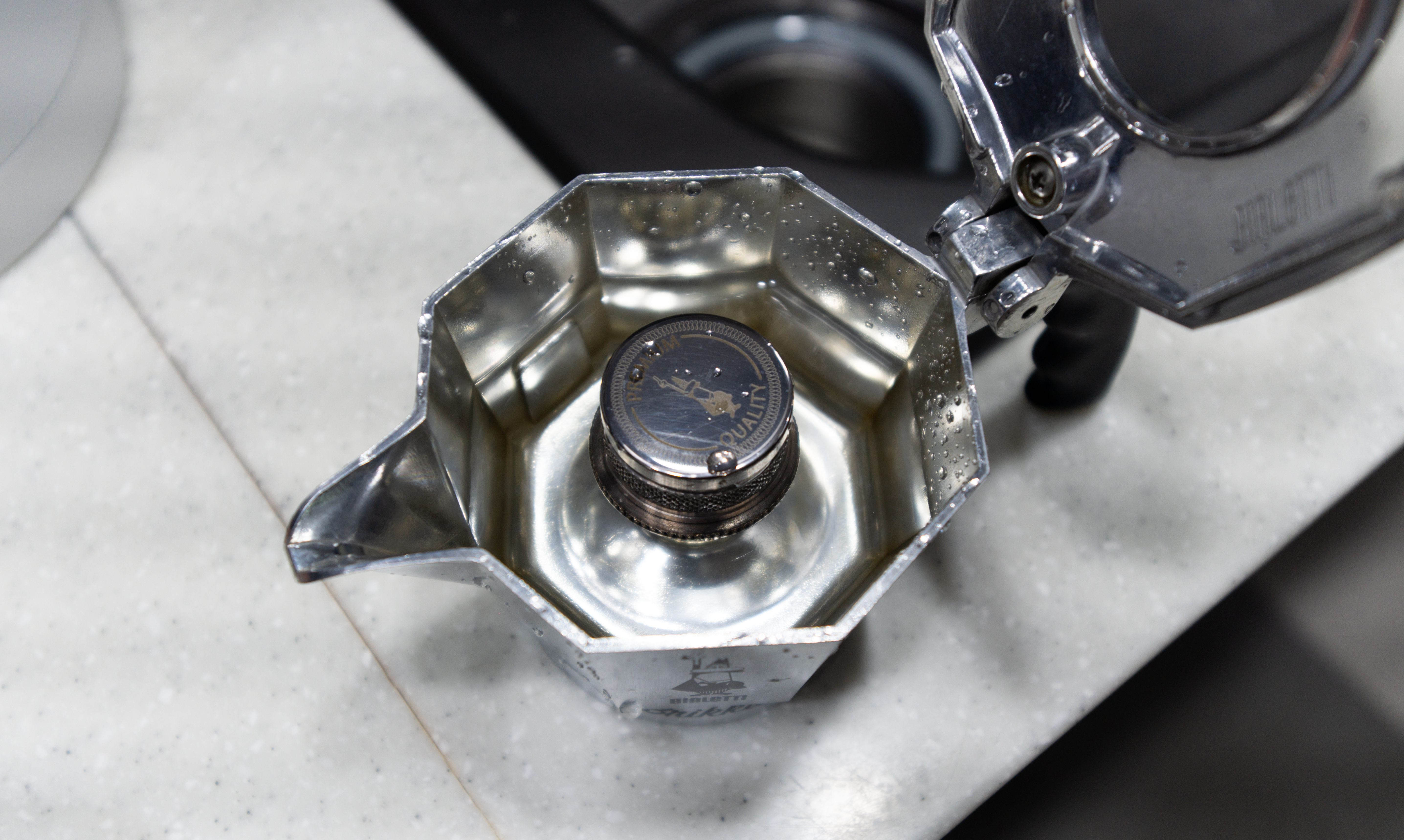 주전자에 담긴 적당량의 물을 물탱크에 담아줍니다. 이탈리아인인 지인에게 직접 듣기로는 물탱크 내에 있는 압력을 조절하는 밸브 밑까지 물을 채우면 된다고 하긴 하는데, 저는 앞서 소개해드린 물 조절선에 맞추는 것을 더 추천드립니다.