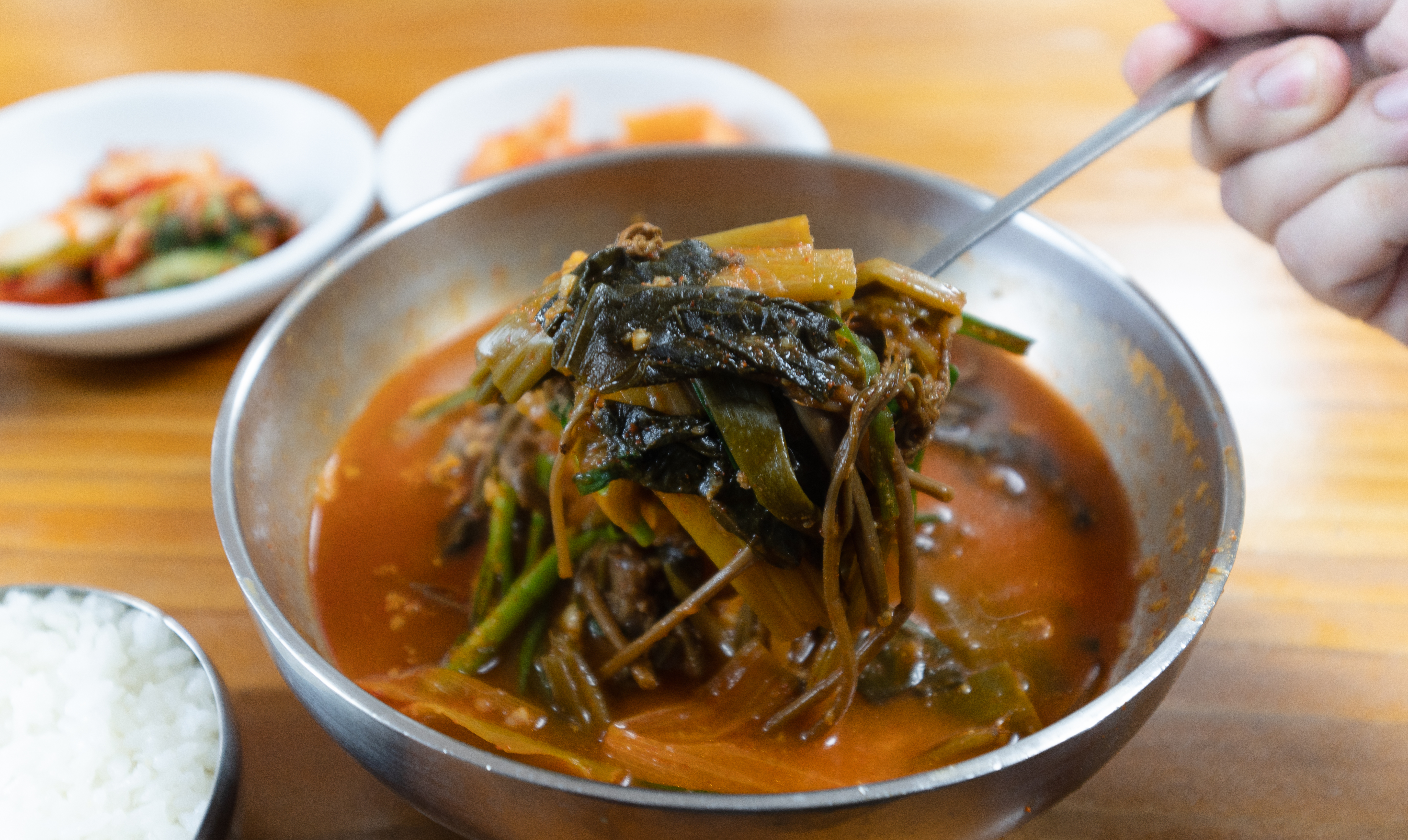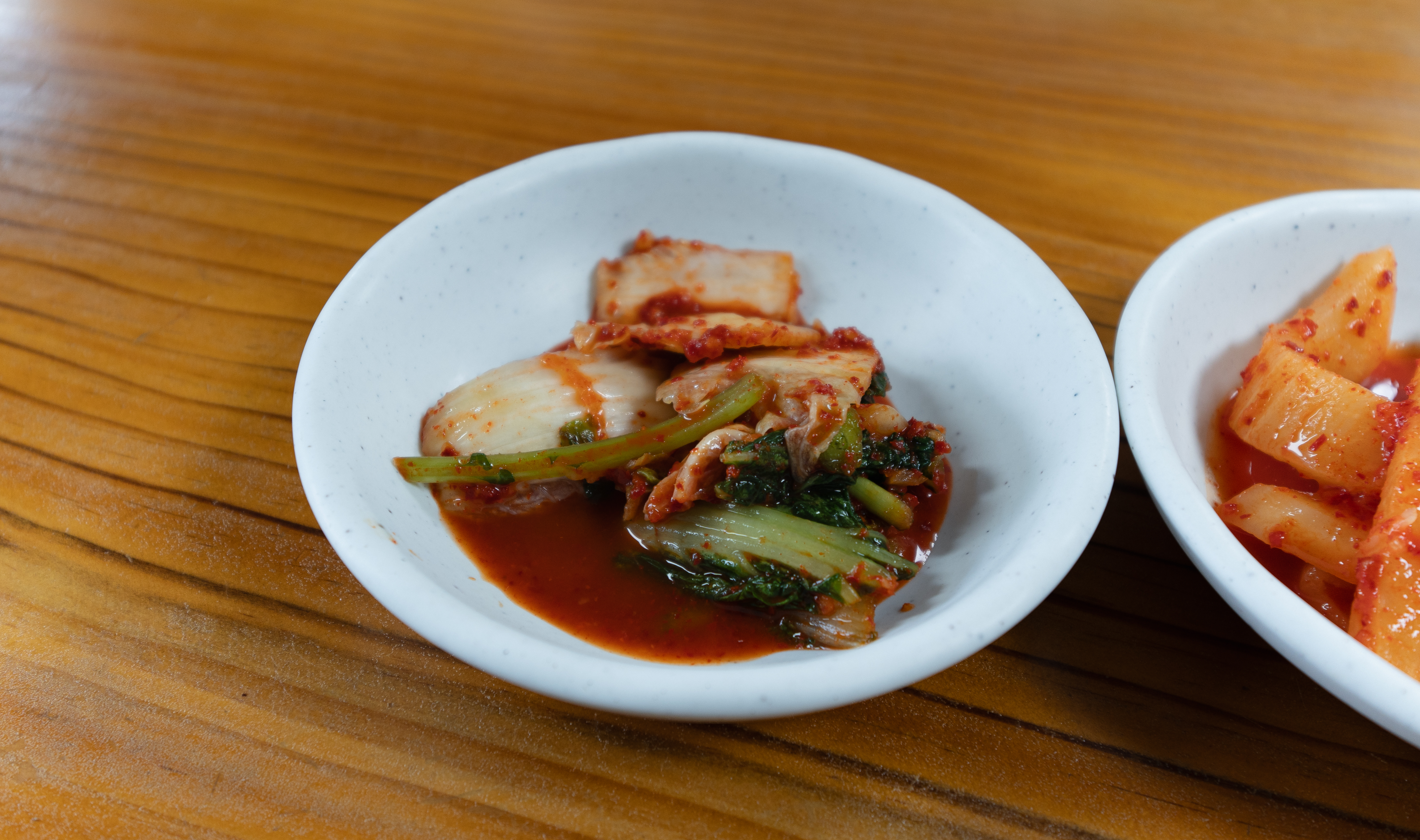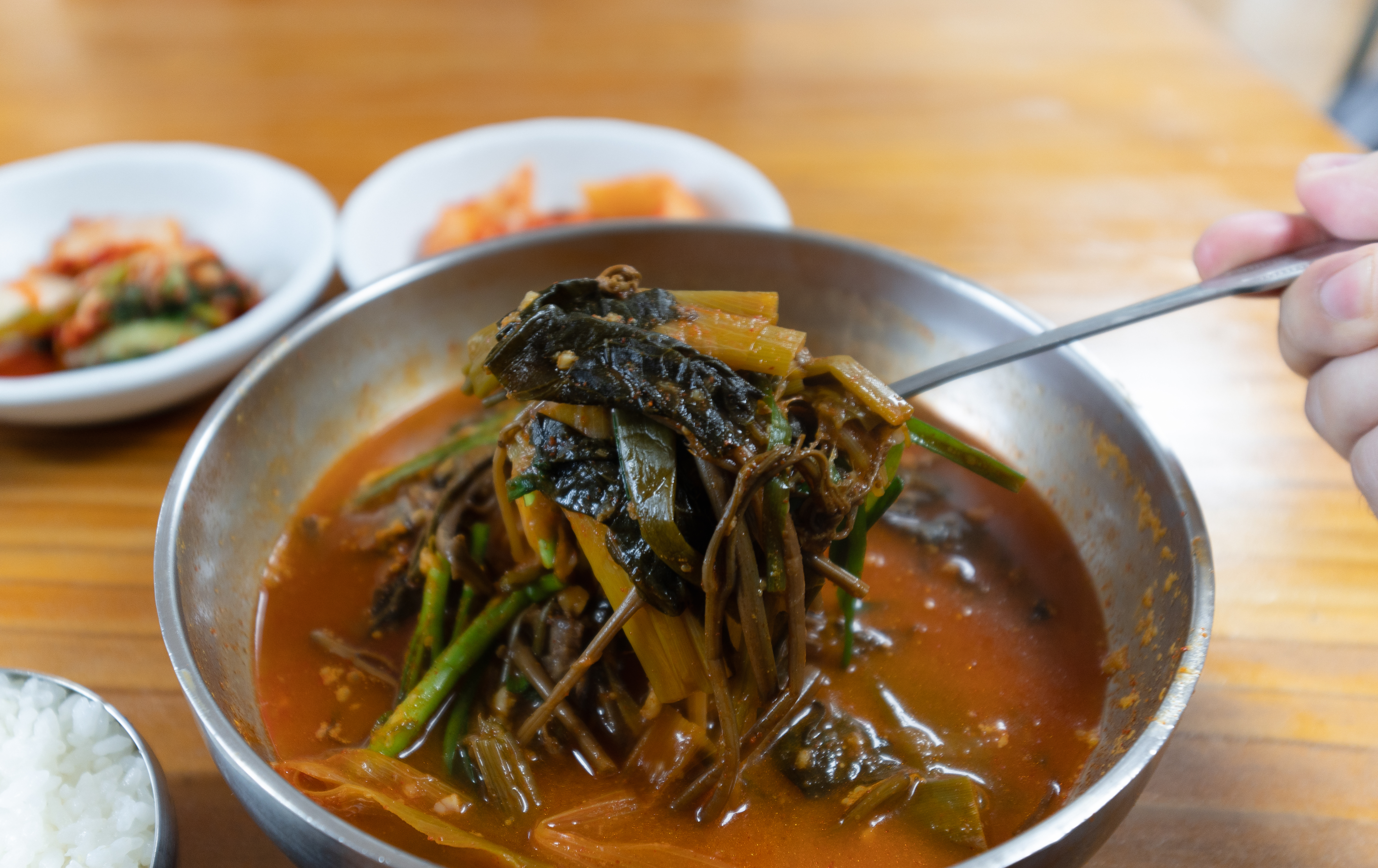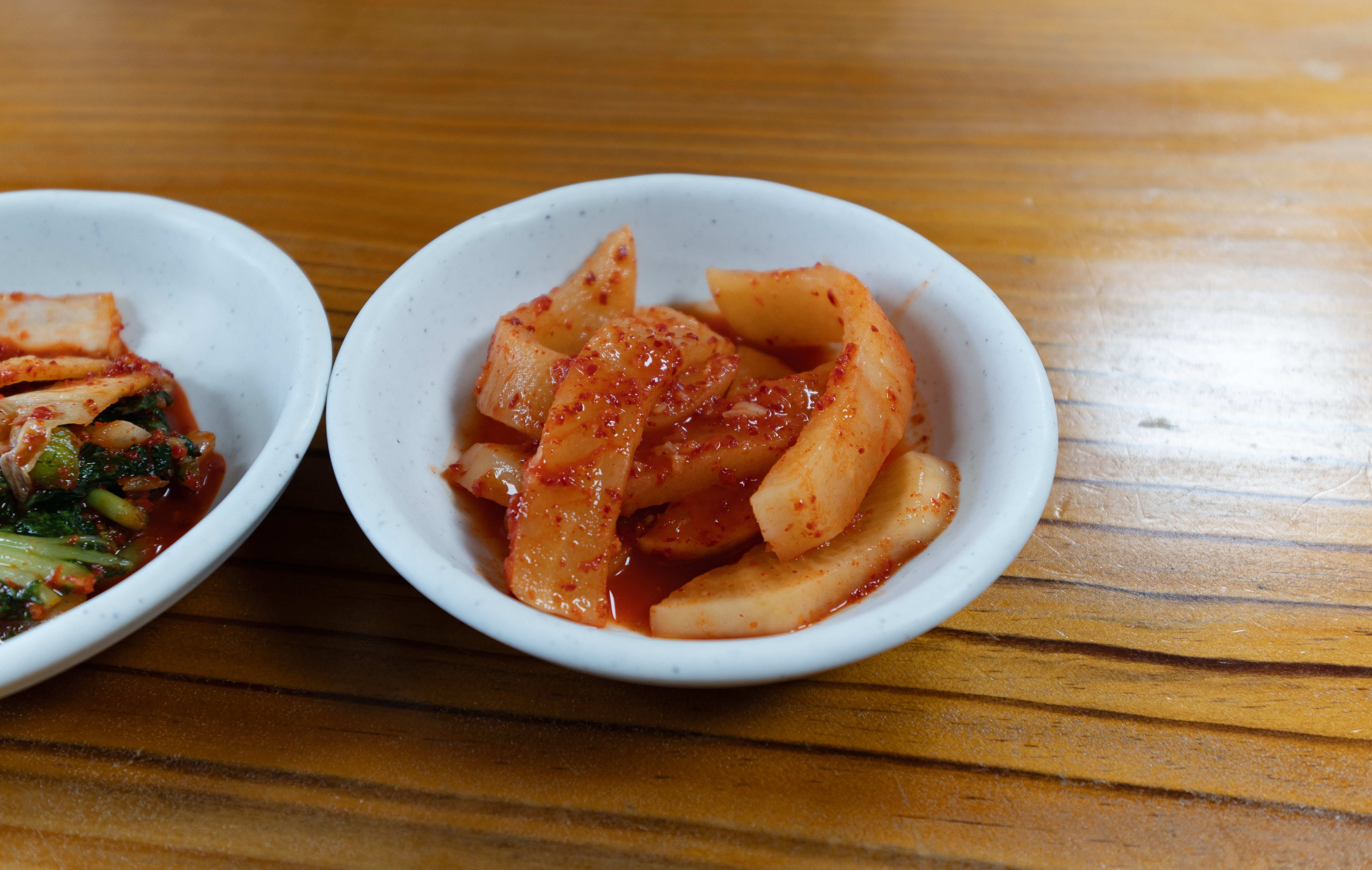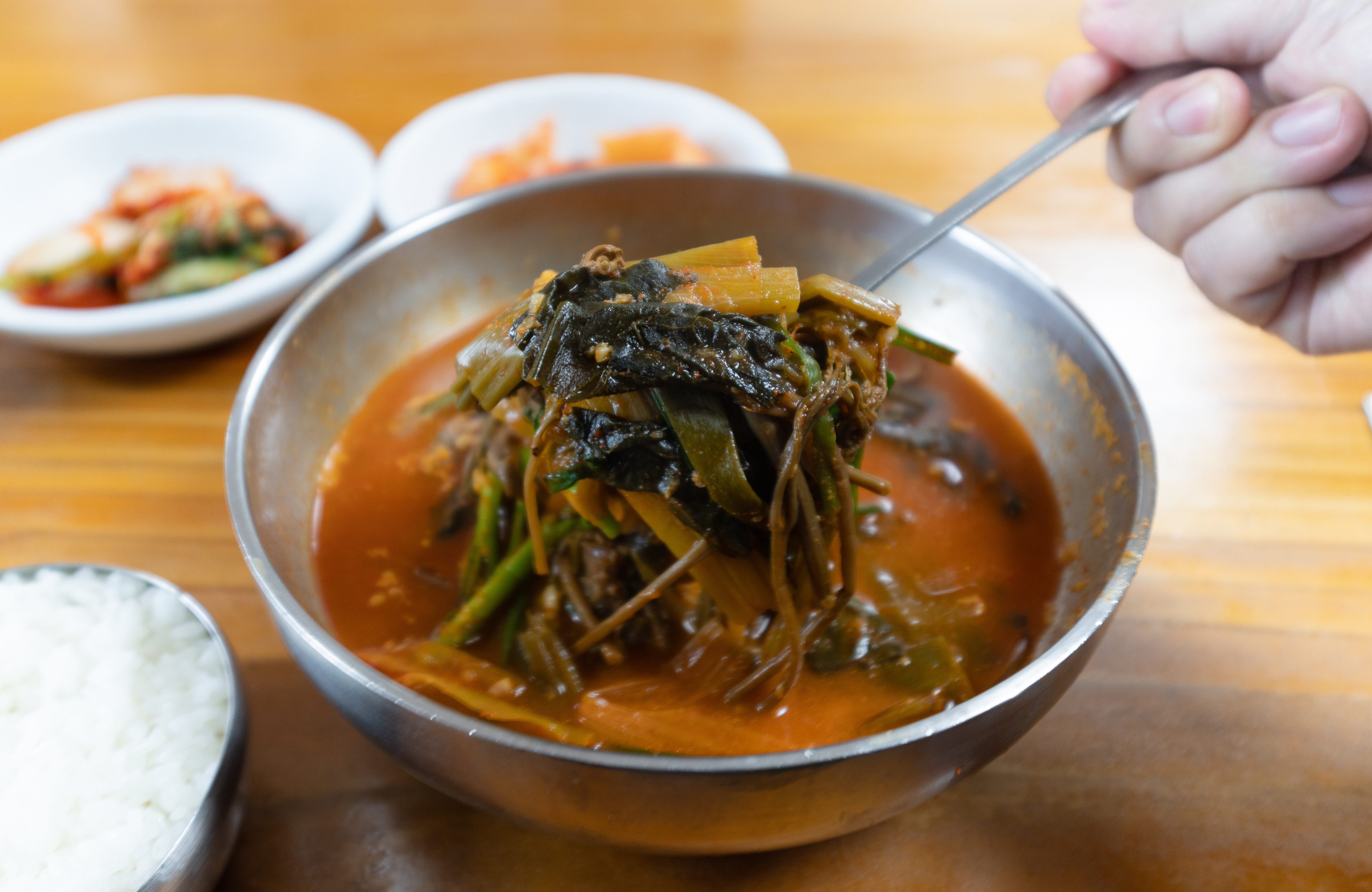 영월 대미식당의 곤드레육개장에는 반찬으로 배추김치와 먹기좋게 썰어 나오는 무김치가 함께 나왔습니다. 저는 원래 어머니가 해주시던 육개장을 좋아하기도 하고, 곤드레 나물이 들어간 육개장이라고 하니 신기하기도 하고, '고소한 나물의 향이 더해지면 더 맛있지 않을까?' 하는 이유로 육개장을 선택하게 되었습니다.