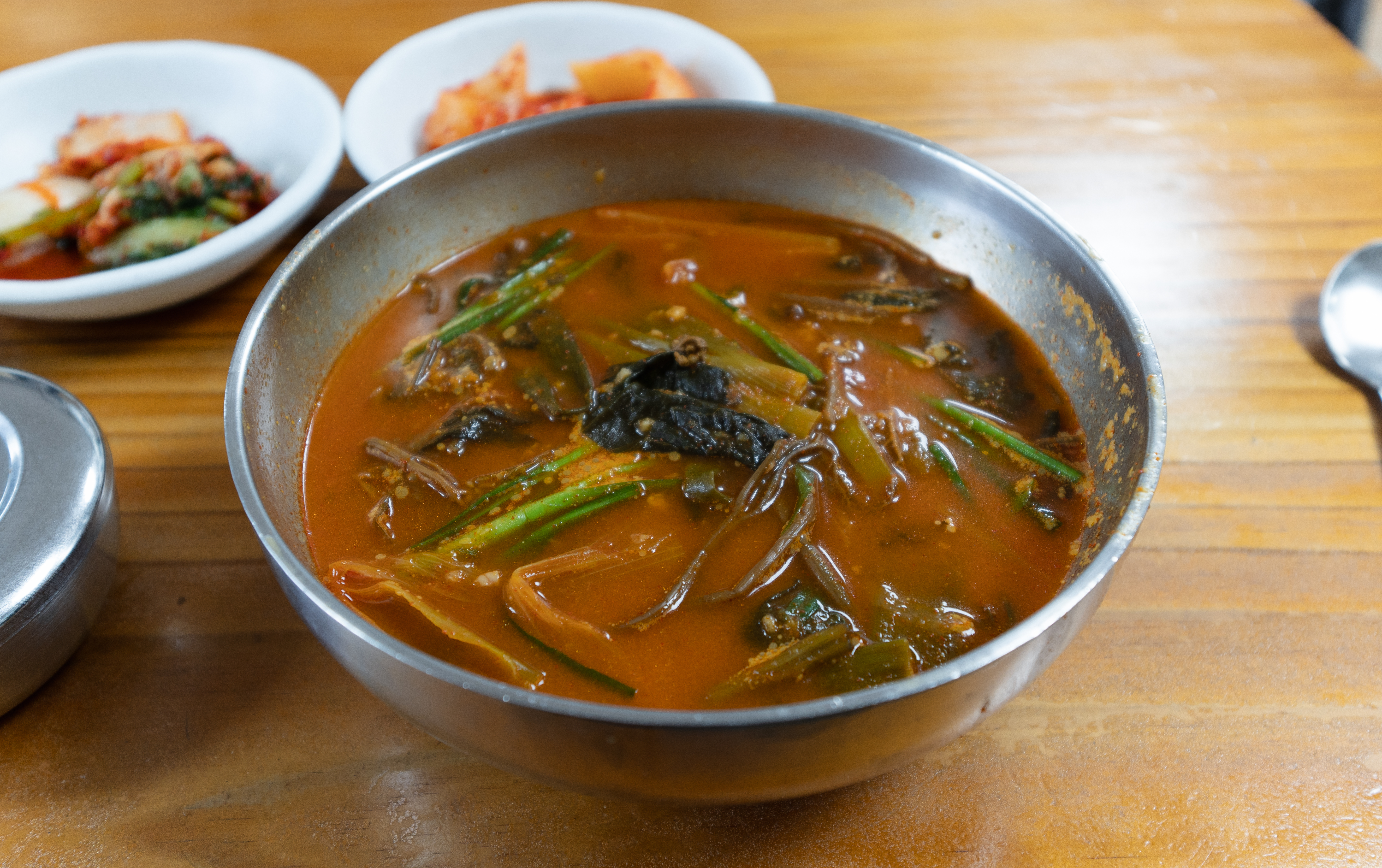 대미식당의 메뉴는 뼈다귀해장국, 선지해장국, 곤드레육개장, 뼈다귀전골이 있었습니다. 이곳은 뼈다귀해장국 맛집으로 현지인 분들이 많이 찾고 있는 가게였는데요, 저는 전날 산속에서 사진 찍다가 우연한 계기로 뼈다귀해장국을 맛볼 기회가 있어서 곤드레육개장을 선택하였습니다.