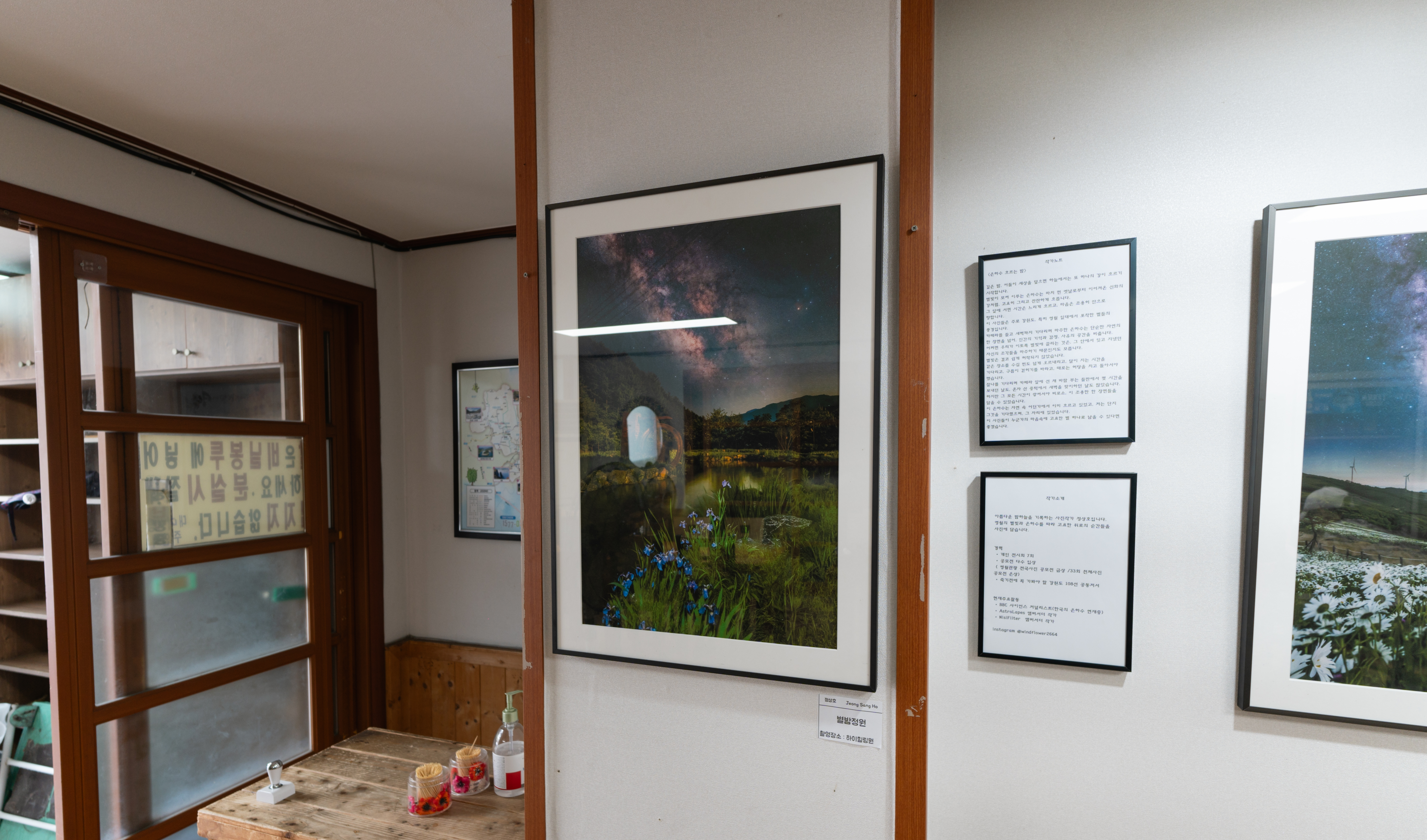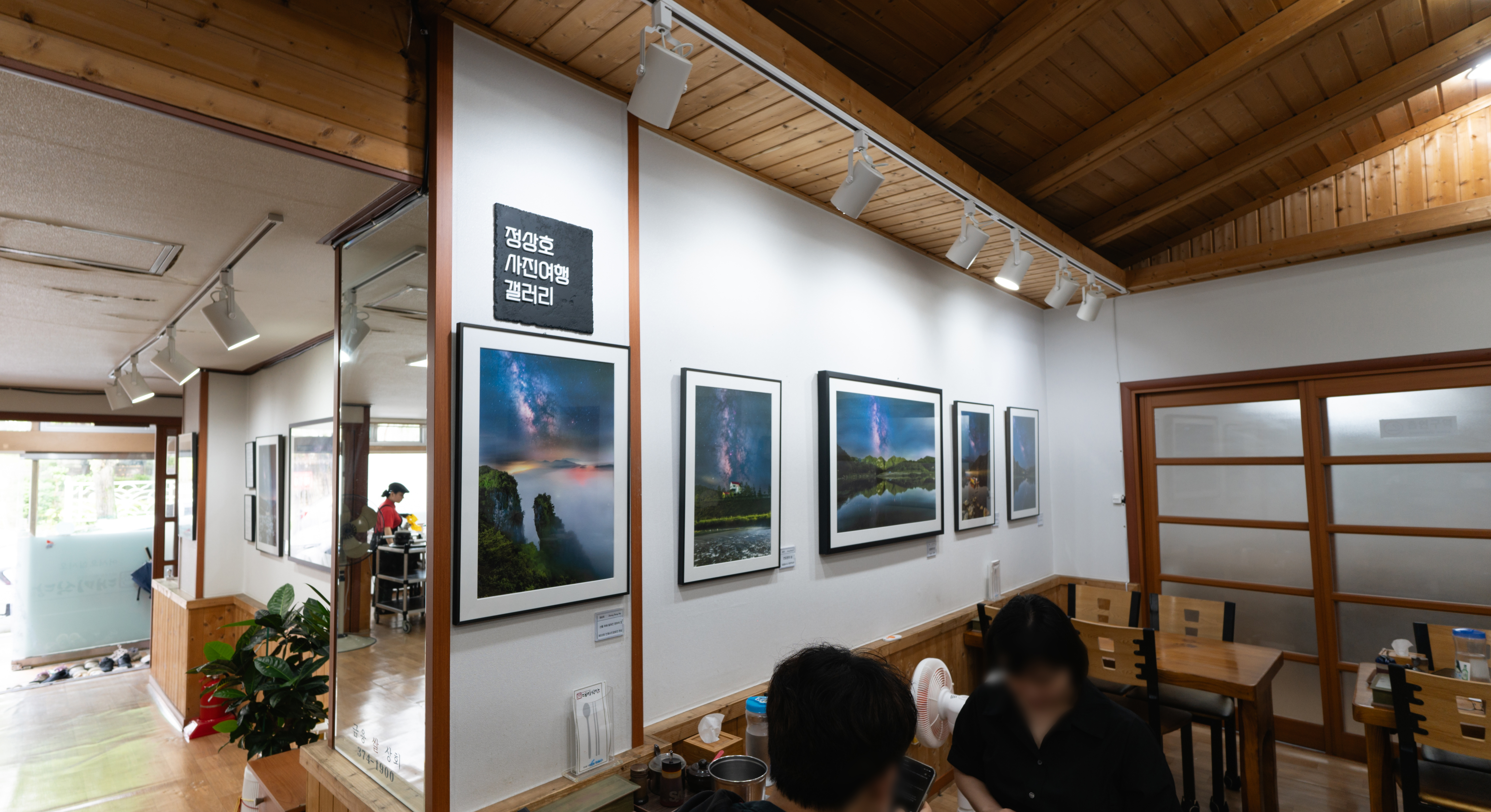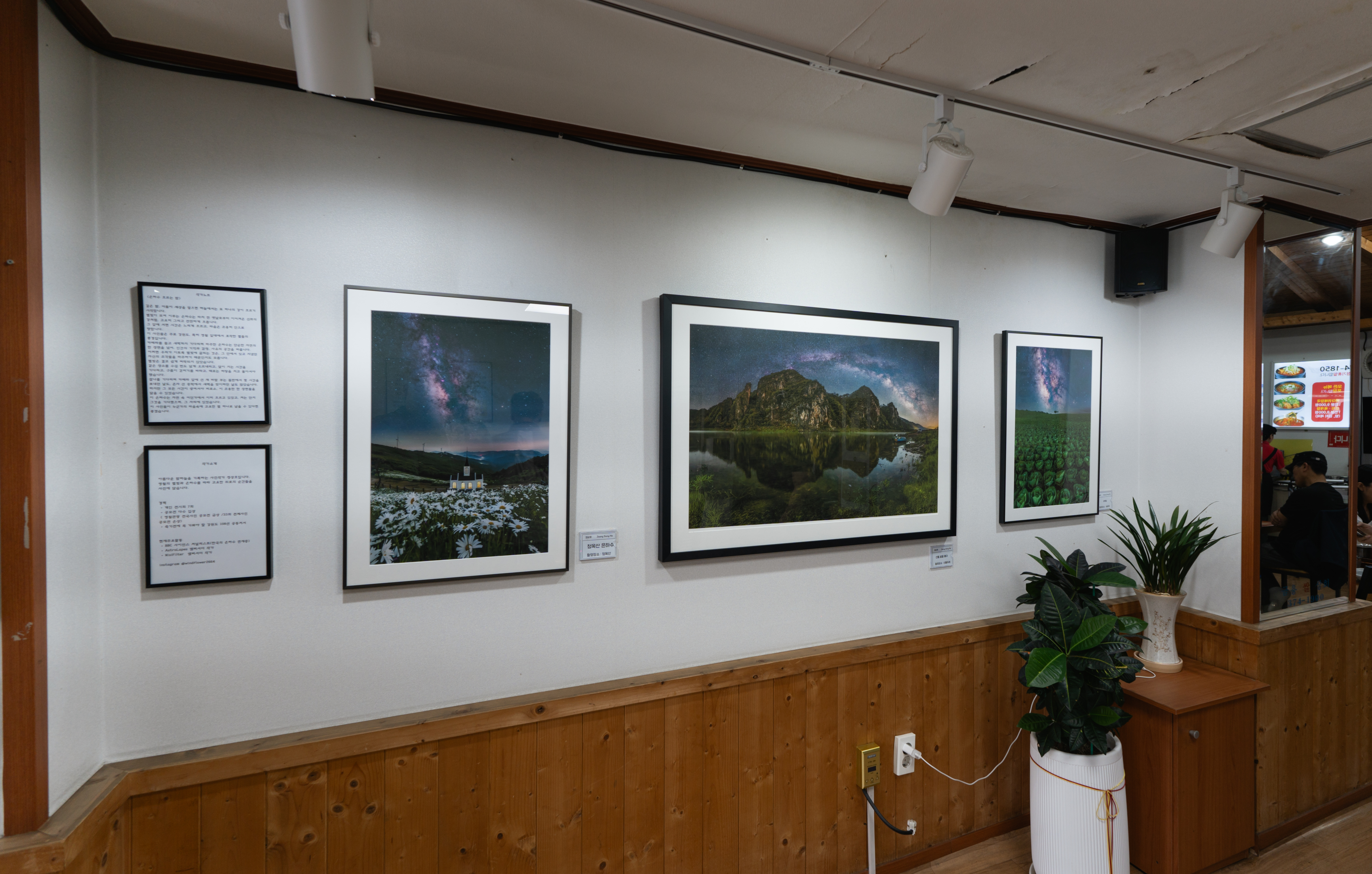 바로, 대미식당에는 정상호 사진작가님의 은하수 사진이 벽면에 전시되어 있었습니다. 정상호 작가님은 주로 강원지역에서 활동하는 은하수 사진작가로 ⎡BBC science⎦ 매거진에 '한국의 은하수' 라는 섹션으로 연재중인 프로 작가분이셨습니다. 저는 우연한 계기로 은하수 사진을 찍으려다가 만나게 되었는데, 실제로 보니 사진도 정말 잘 찍으시고, 전국 방방곡곡의 은하수 명소에서 사진을 담고 계신 분이었습니다.