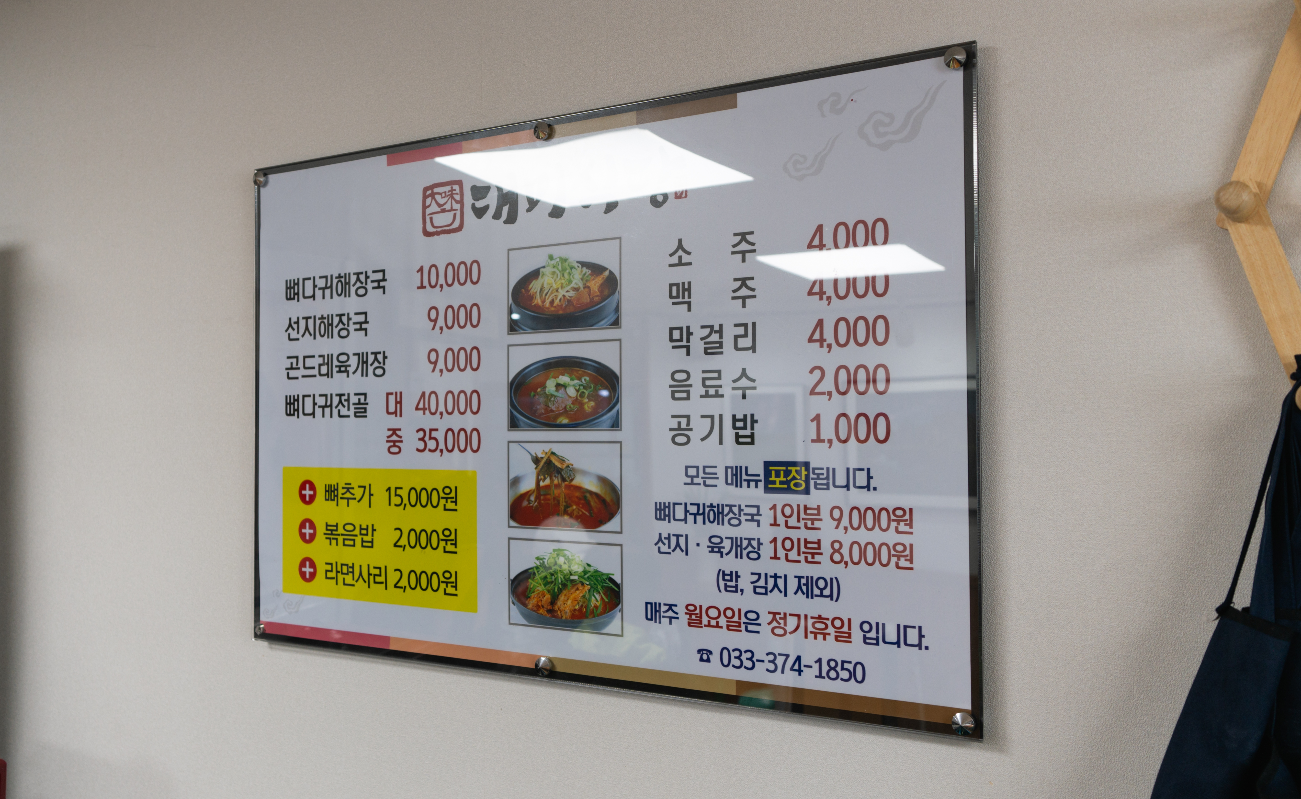 대미식당의 메뉴는 뼈다귀해장국, 선지해장국, 곤드레육개장, 뼈다귀전골이 있었습니다. 이곳은 뼈다귀해장국 맛집으로 현지인 분들이 많이 찾고 있는 가게였는데요, 저는 전날 산속에서 사진 찍다가 우연한 계기로 뼈다귀해장국을 맛볼 기회가 있어서 곤드레육개장을 선택하였습니다.