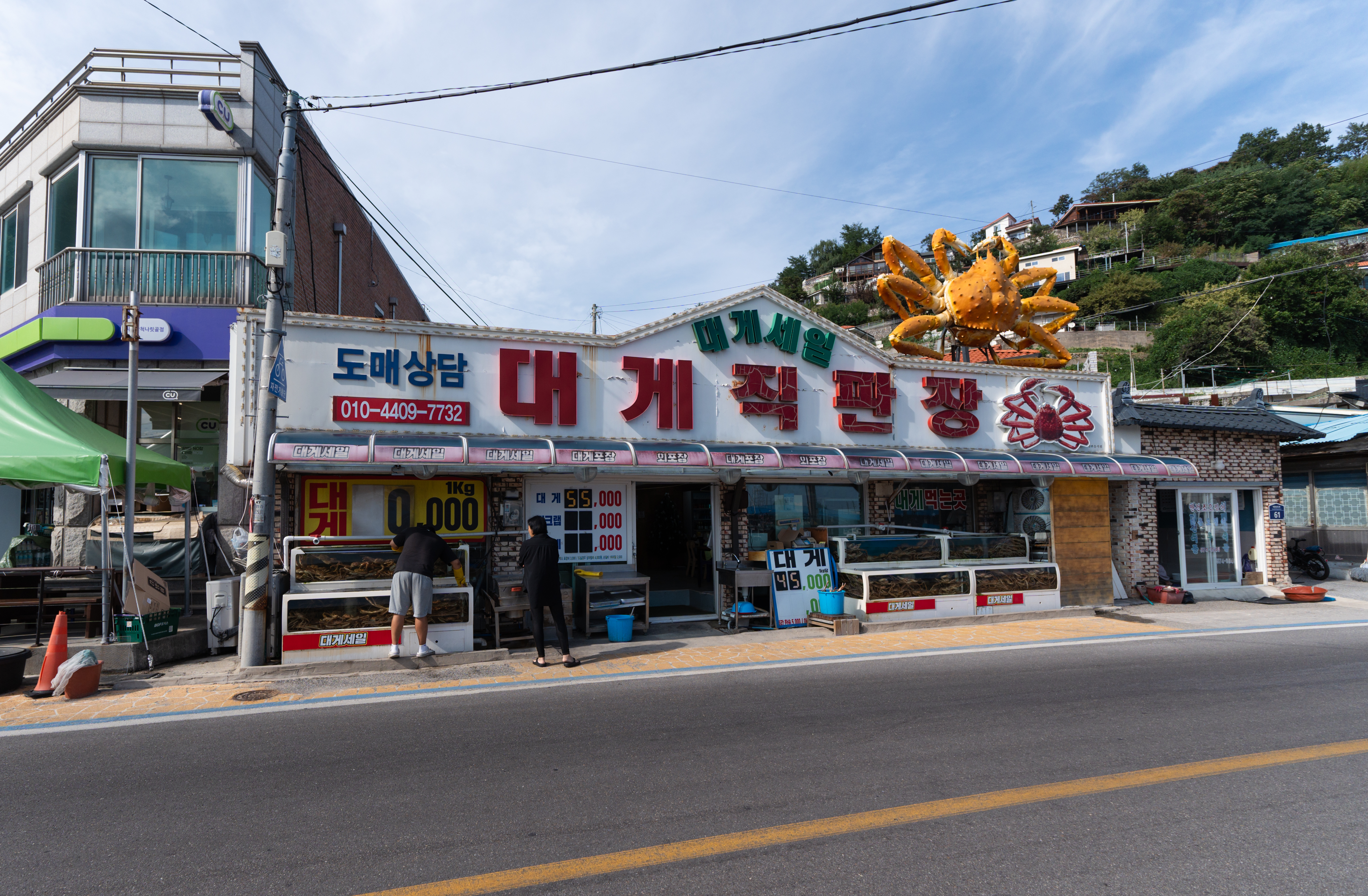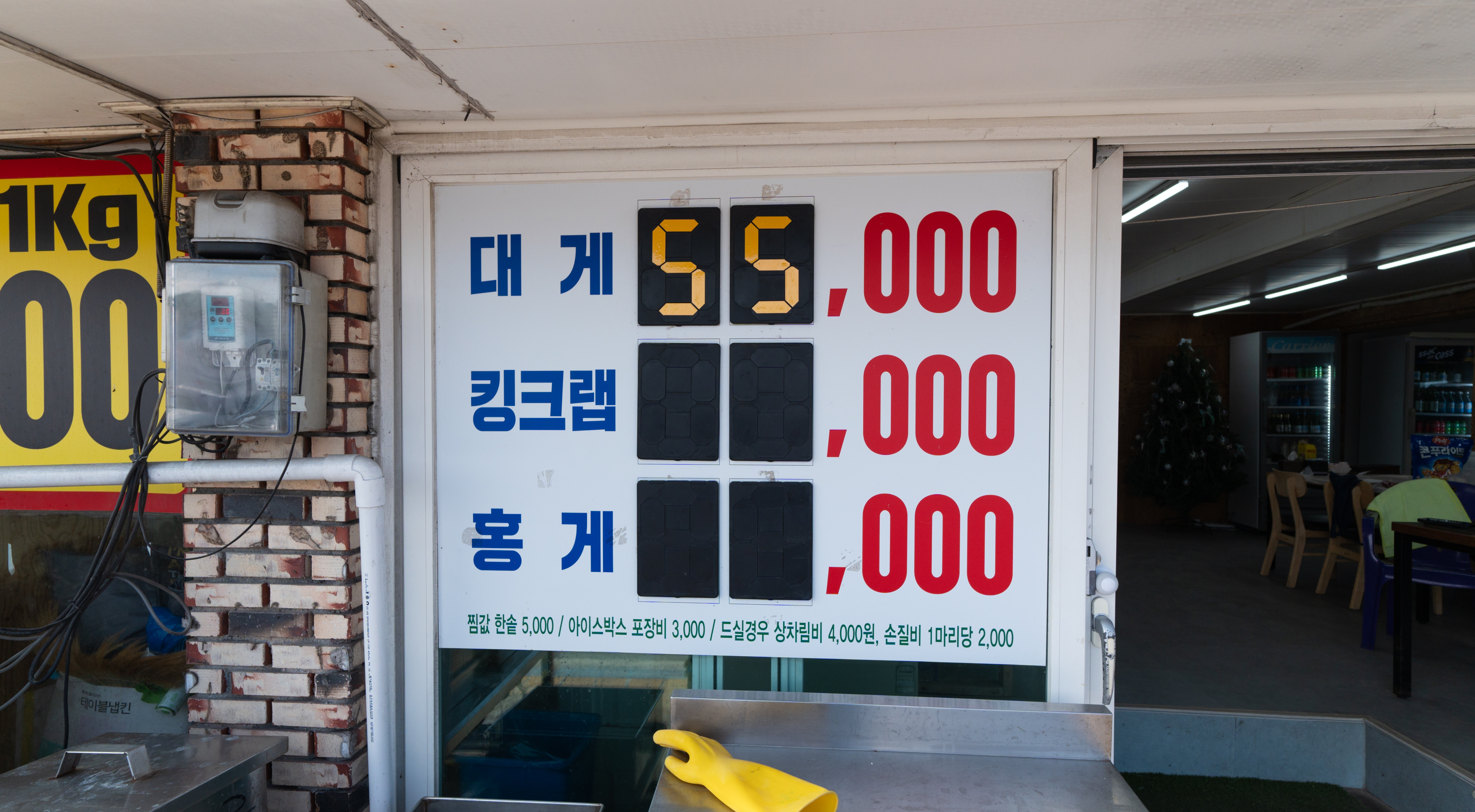 대게세일 대게직판장은 강원특별자치도 삼척시 정하동 75-1 에 위치해 있었습니다. 이곳은 삼척항과 가까이 위치해 있었고, 주차는 도로면 노상주차장에 하면 되었습니다. 가게에는 대게가 가득 담긴 수조가 가게 양쪽으로 있었고, 가게 앞에는 시가를 보여주는 가격판이 있었습니다. 제가 방문한 날의 대게 가격은 55,000원이었습니다.