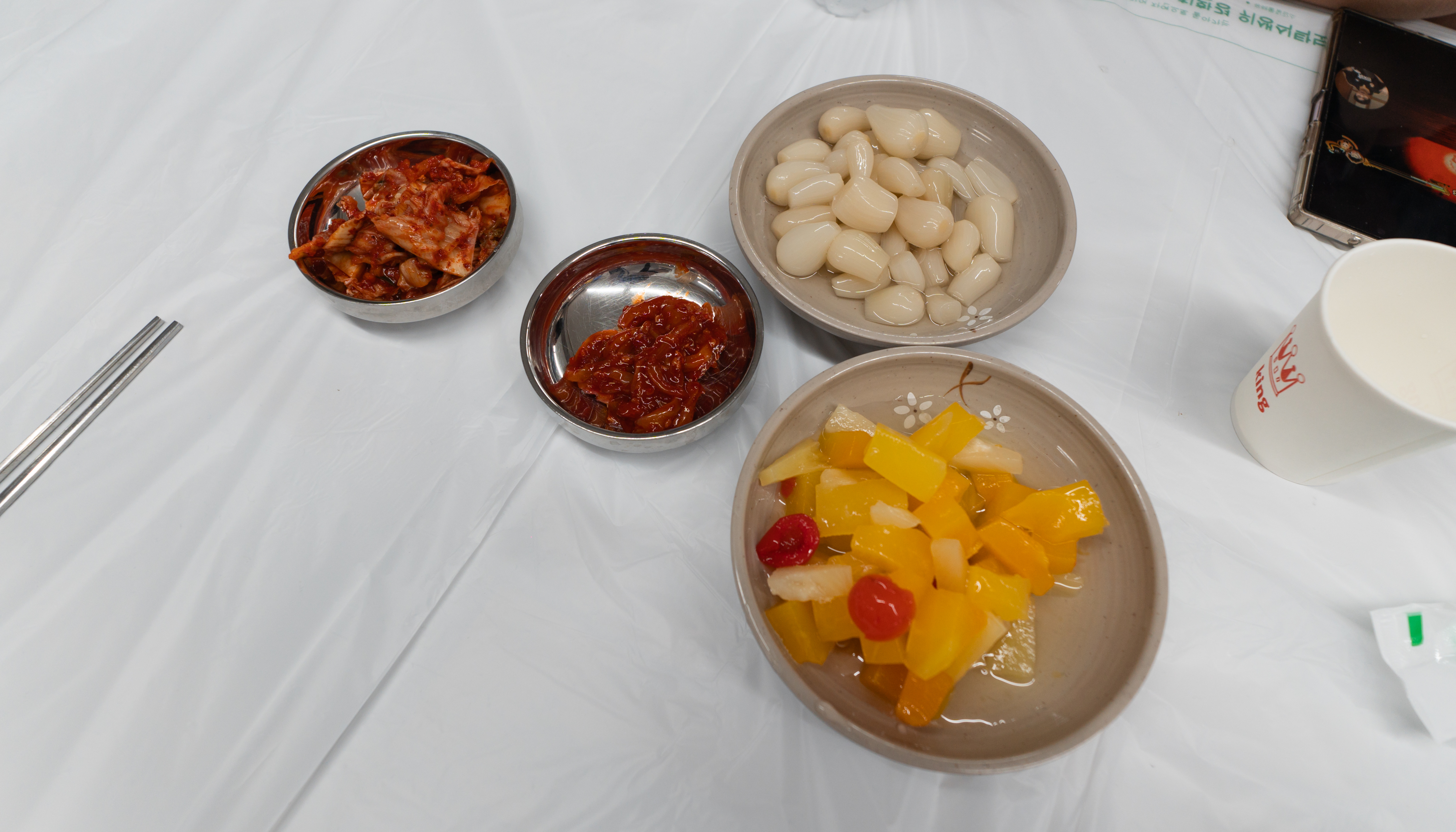 가게 내부의 모습은 위와 같습니다. 깔끔한 분위기이고 위 사진과 같은 공간이 양쪽으로 두 곳이 있었습니다. 반찬은 셀프바에서 직접 가져다 먹을 수 있었는데요. 김치와 젓갈, 후르츠칵테일, 락교 등이 있었습니다.