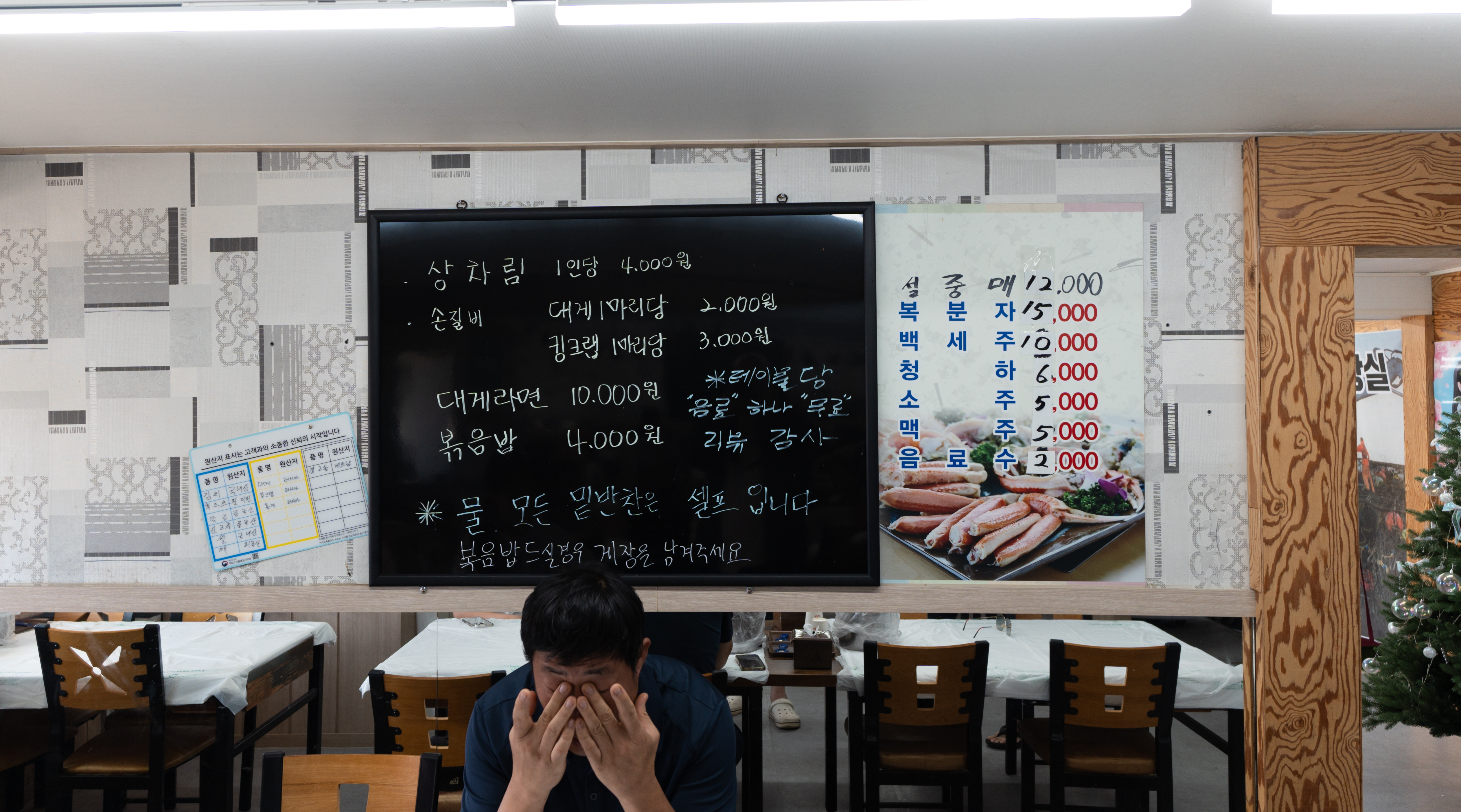 강원도 삼척 삼척항 맛집 대게세일 대게직판장의 메뉴는 위와 같습니다. 대게의 가격은 외부 가격판에 적혀있었고, 상차림비, 손질비, 대게라면, 볶음밥이 있었습니다. 물과 밑반찬은 셀프였고, 볶음밥을 주문하려면 게장을 남겨달라는 안내가 적혀있었습니다.