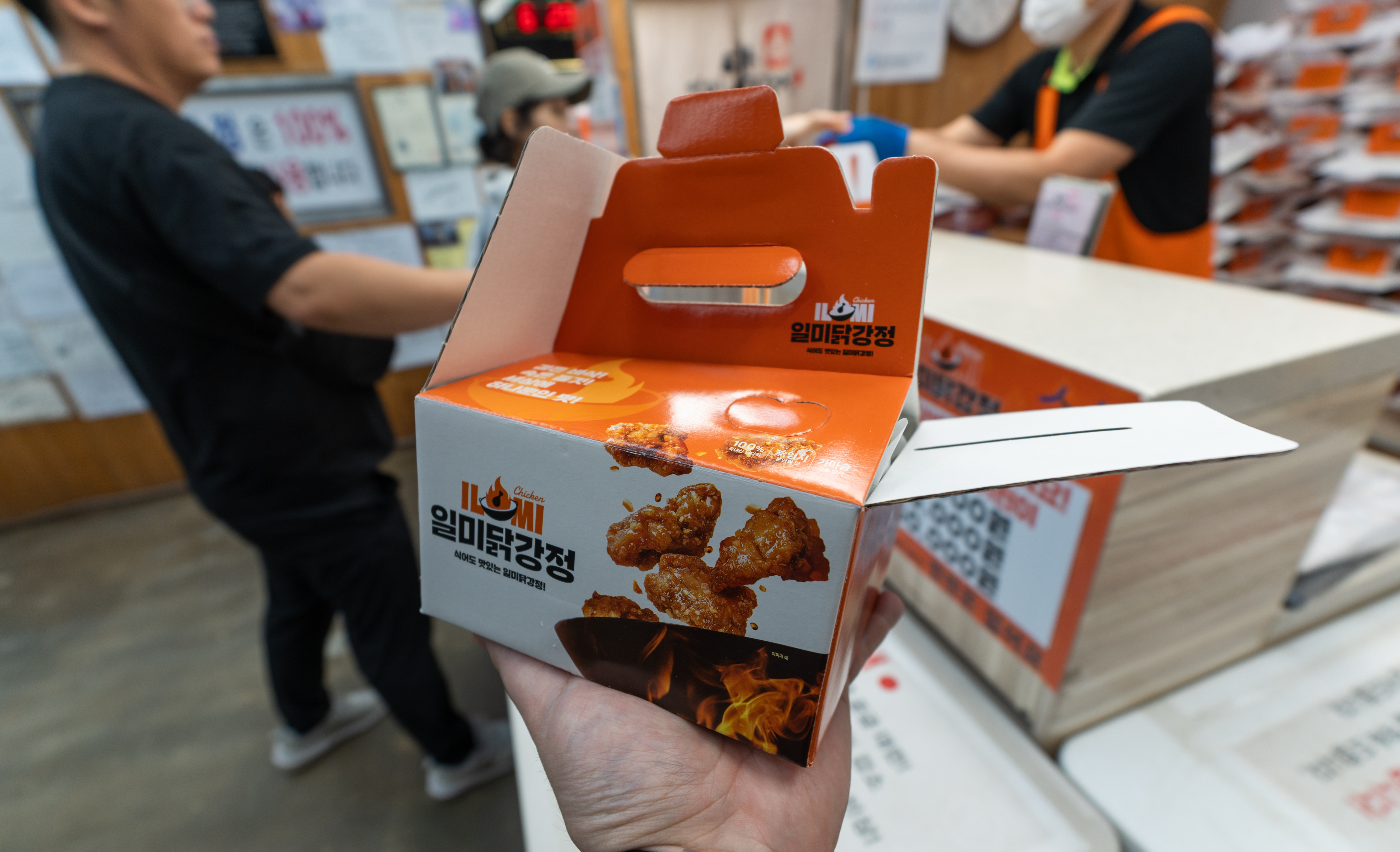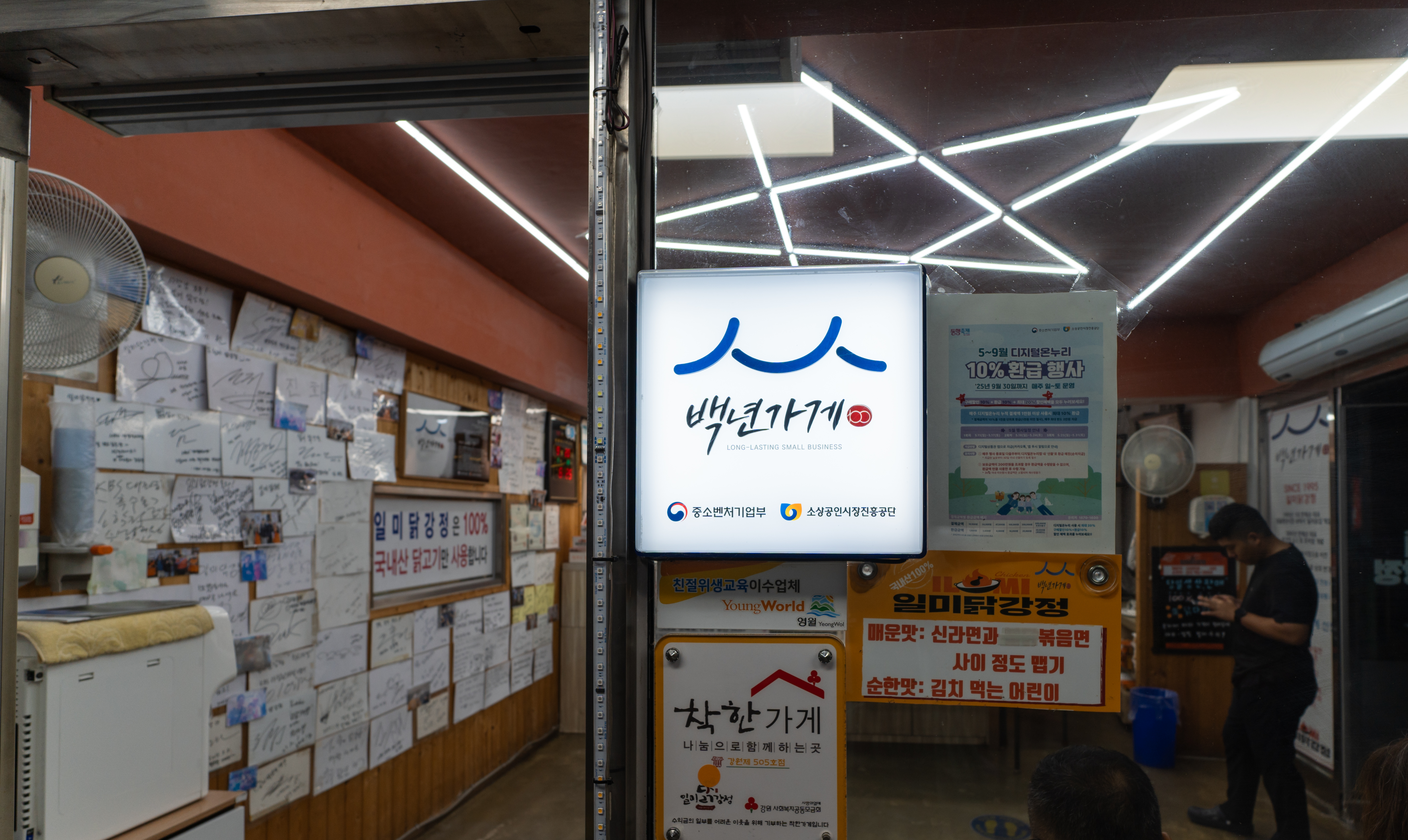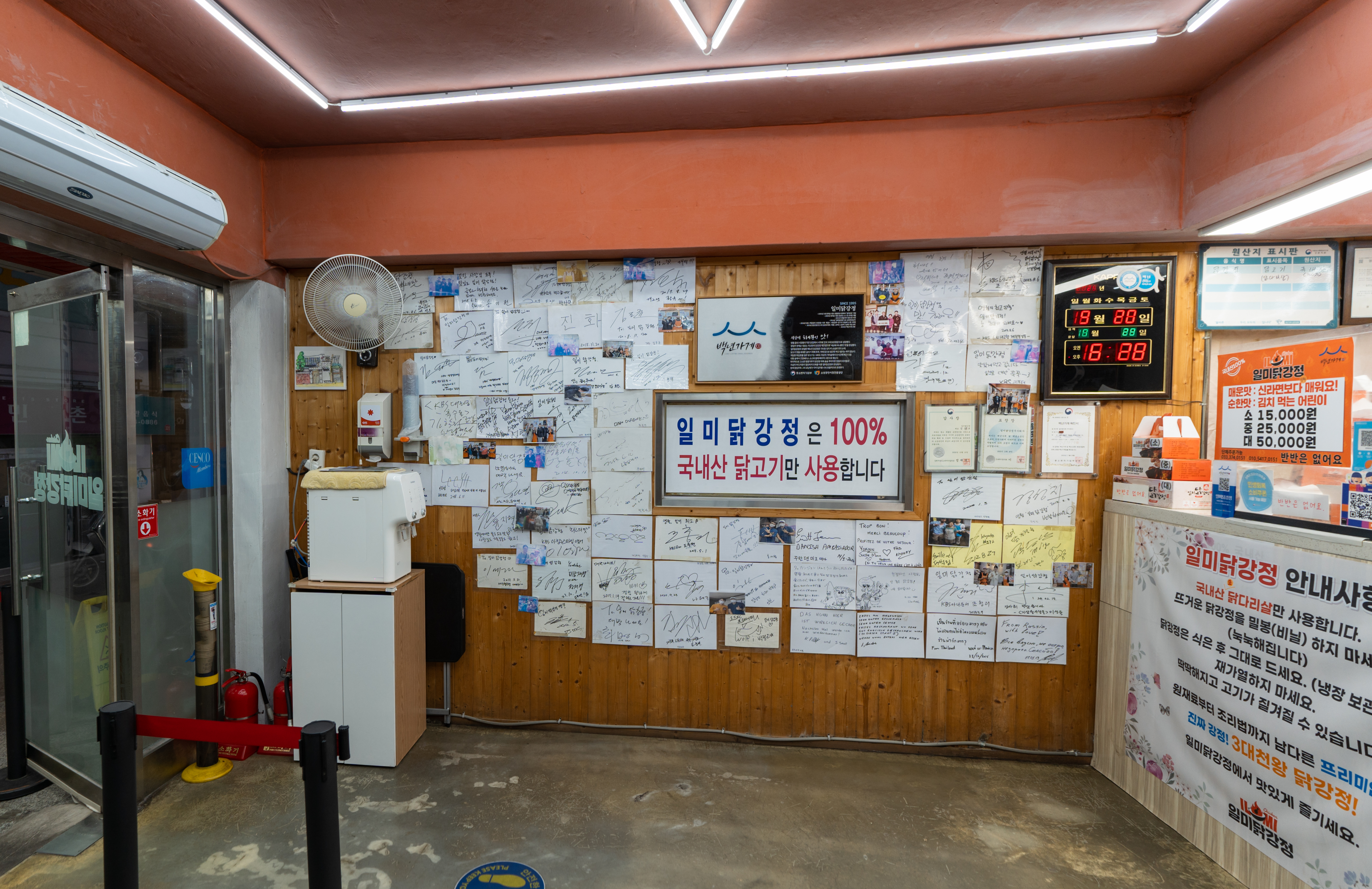 일미닭강정은 영월 서부시장(강원특별자치도 영월군 영월읍 하송리 4-1) 에 위치해 있었습니다. 이곳은 포장 위주로 판매하고 있는 가게였으며, 가게에는 포장 대기하는 손님들이 많이 있었습니다. 저도 포장 주문을 하고, 잠시 화장실에 다녀오니 주문한 메뉴가 나와있었습니다. 이곳은 유명인들이 많이 다녀간 맛집인지 가게 벽면에는 사인이 많이 붙어있었습니다.
