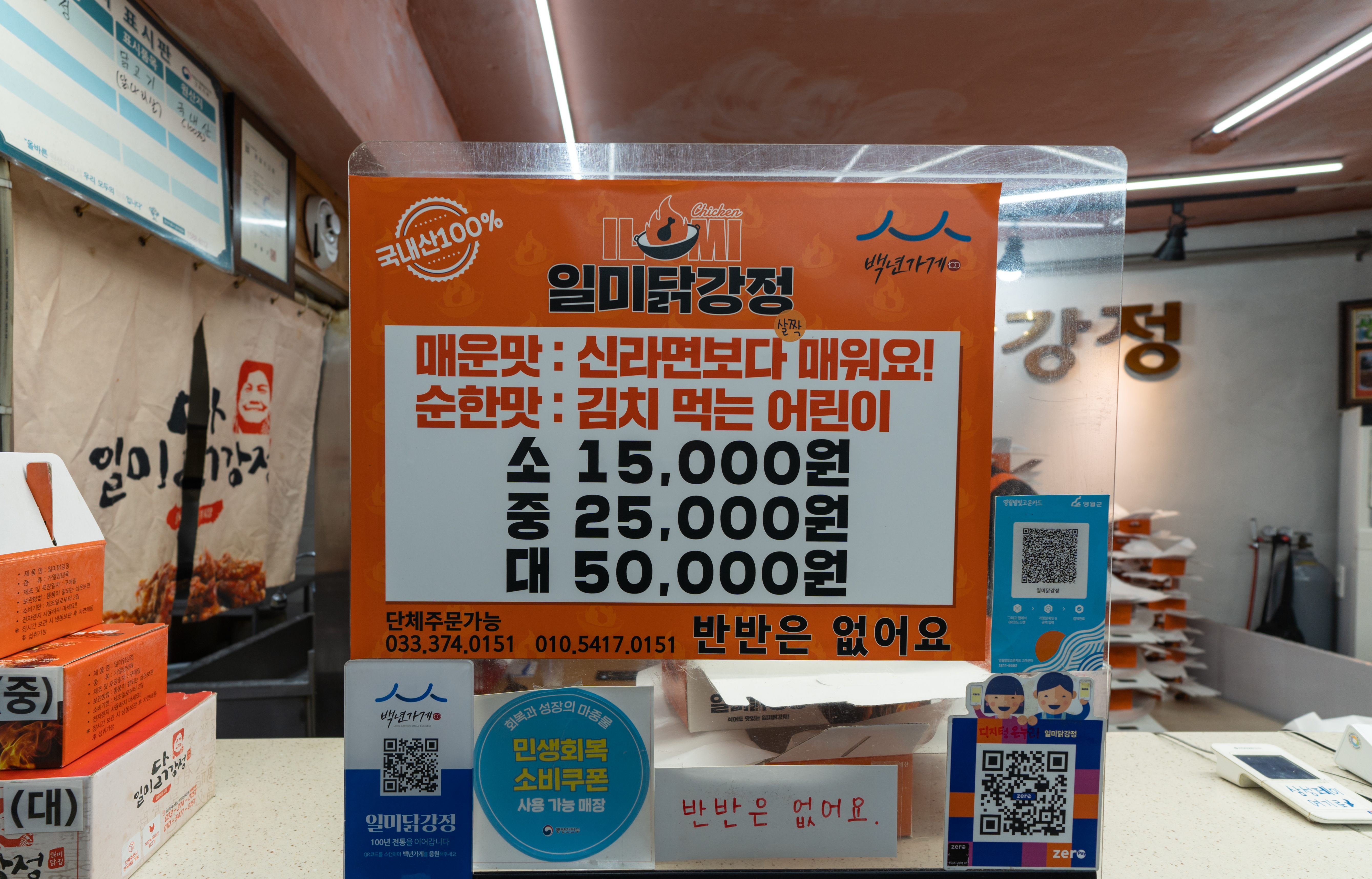 일미닭강정은 영월 서부시장(강원특별자치도 영월군 영월읍 하송리 4-1) 에 위치해 있었습니다. 이곳은 포장 위주로 판매하고 있는 가게였으며, 가게에는 포장 대기하는 손님들이 많이 있었습니다. 저도 포장 주문을 하고, 잠시 화장실에 다녀오니 주문한 메뉴가 나와있었습니다. 이곳은 유명인들이 많이 다녀간 맛집인지 가게 벽면에는 사인이 많이 붙어있었습니다.