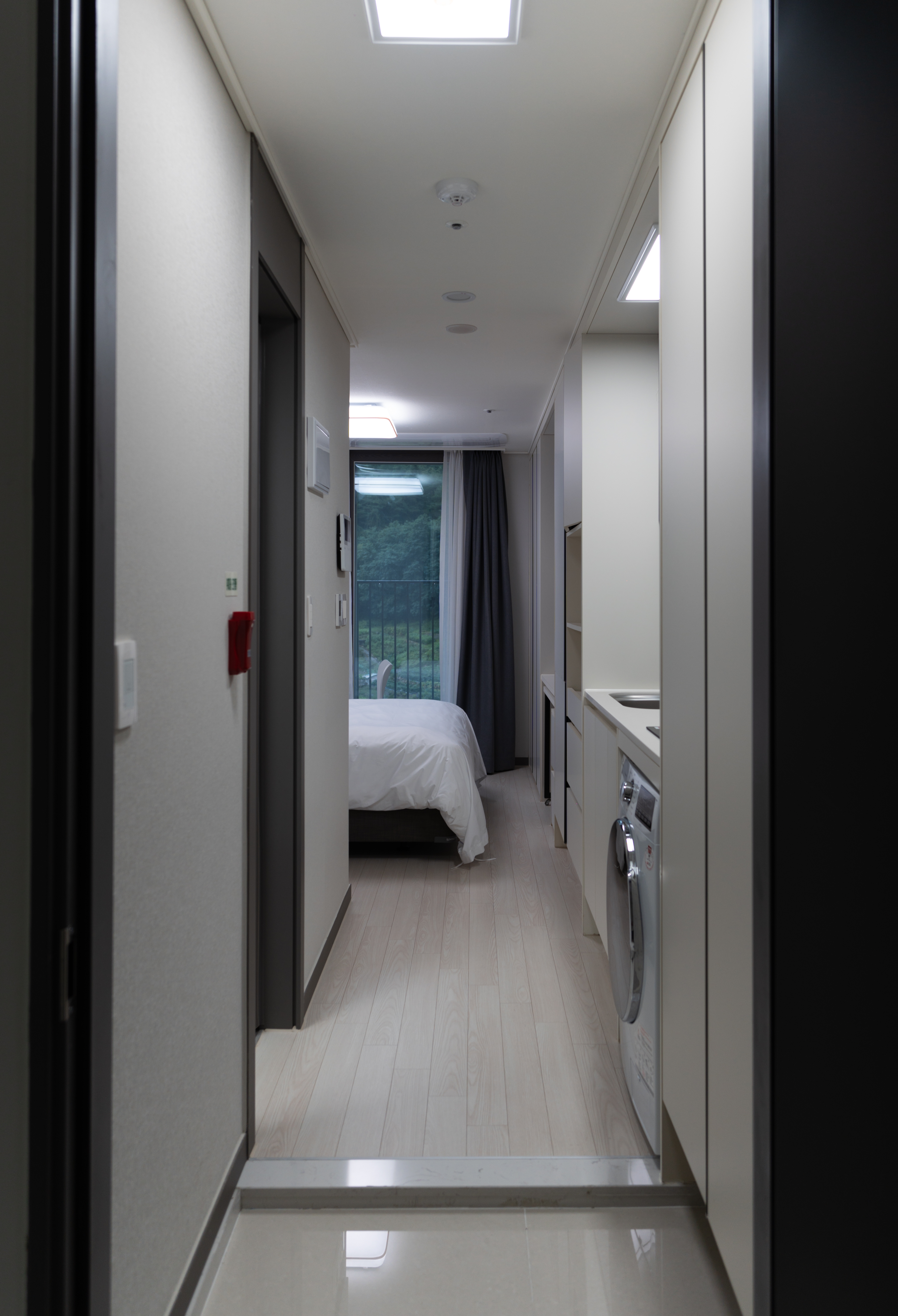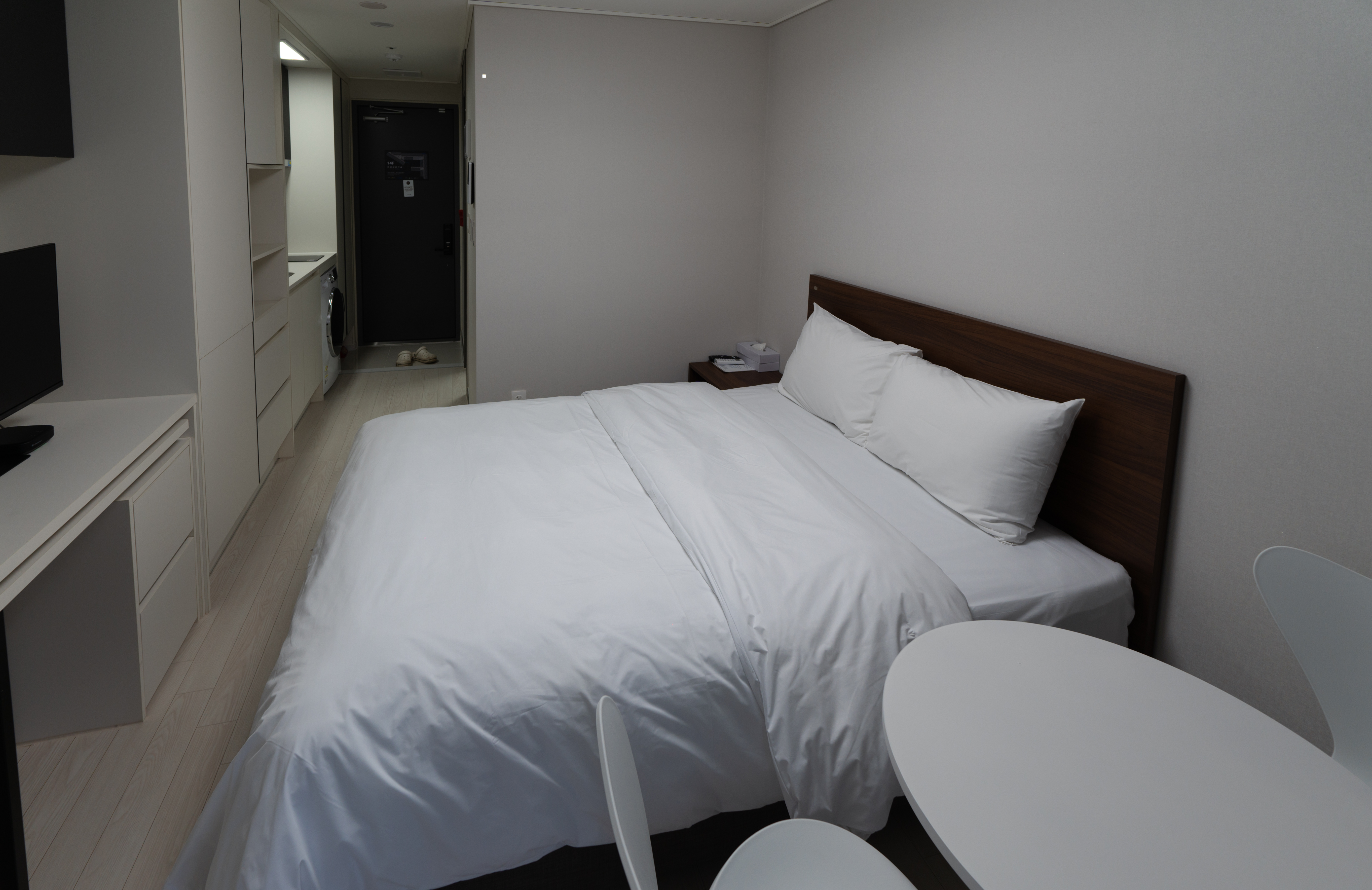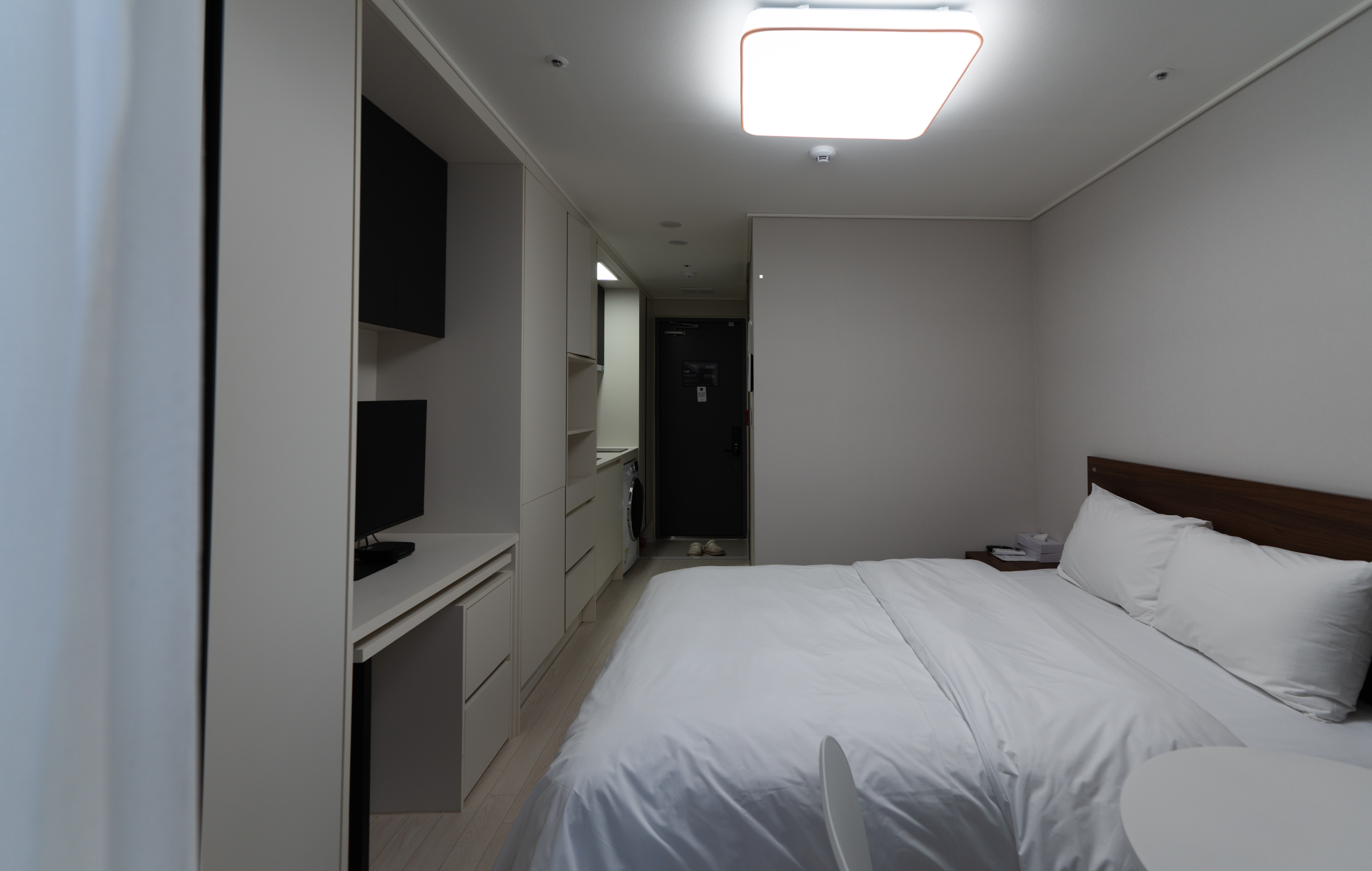 바로 '아리아리 호텔'이라는 곳인데요. 이곳은 레지던스 형태의 숙소로 기존의 호텔은 TV, 냉장고, 커피포트 정도의 생활가전이 있다면, 레지던스형 숙소는 더 나아가 주방(인덕션), 세탁기 등 생활가전이 더 추가되어 오피스텔 형태의 숙박시설을 의미합니다.