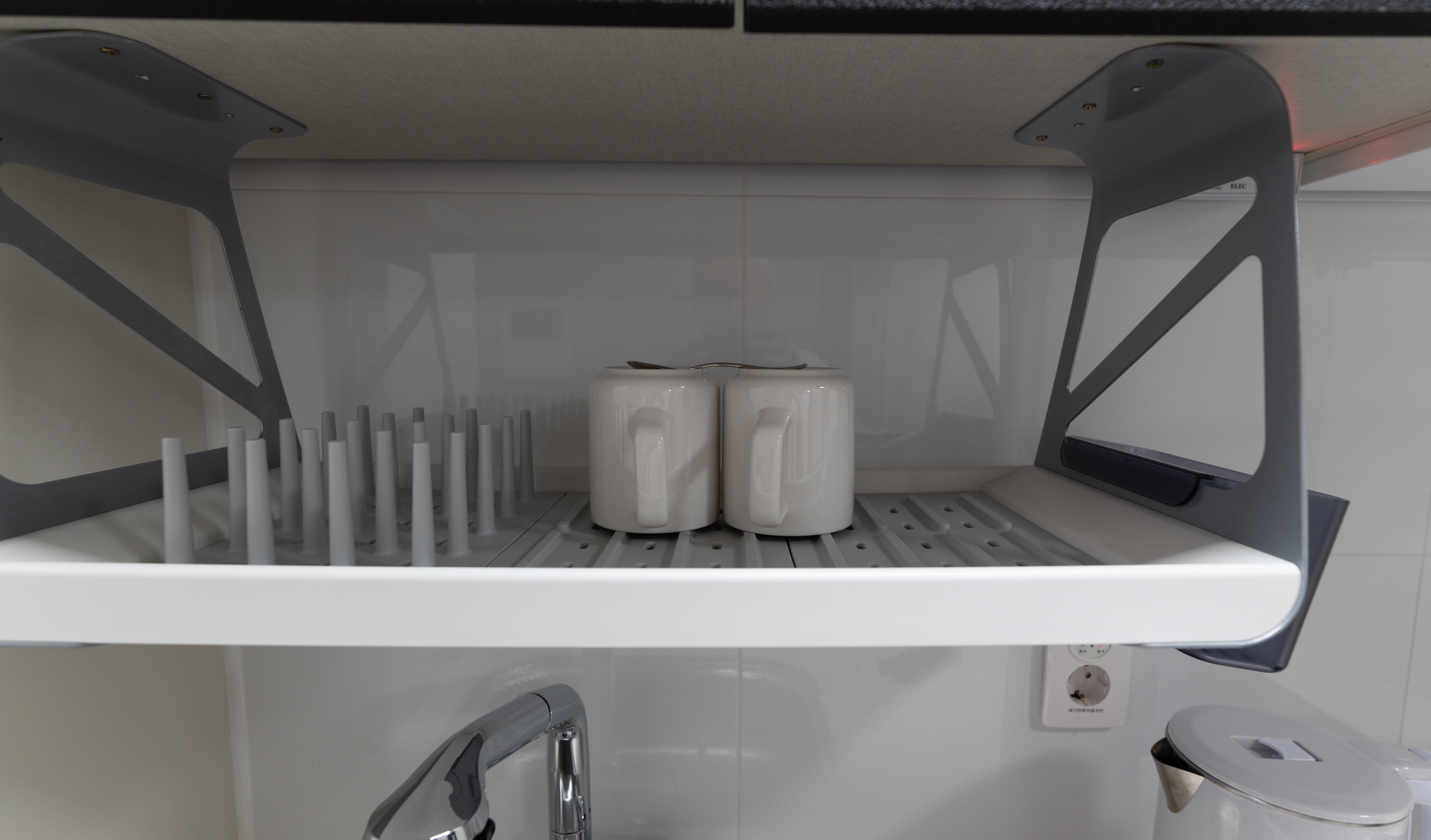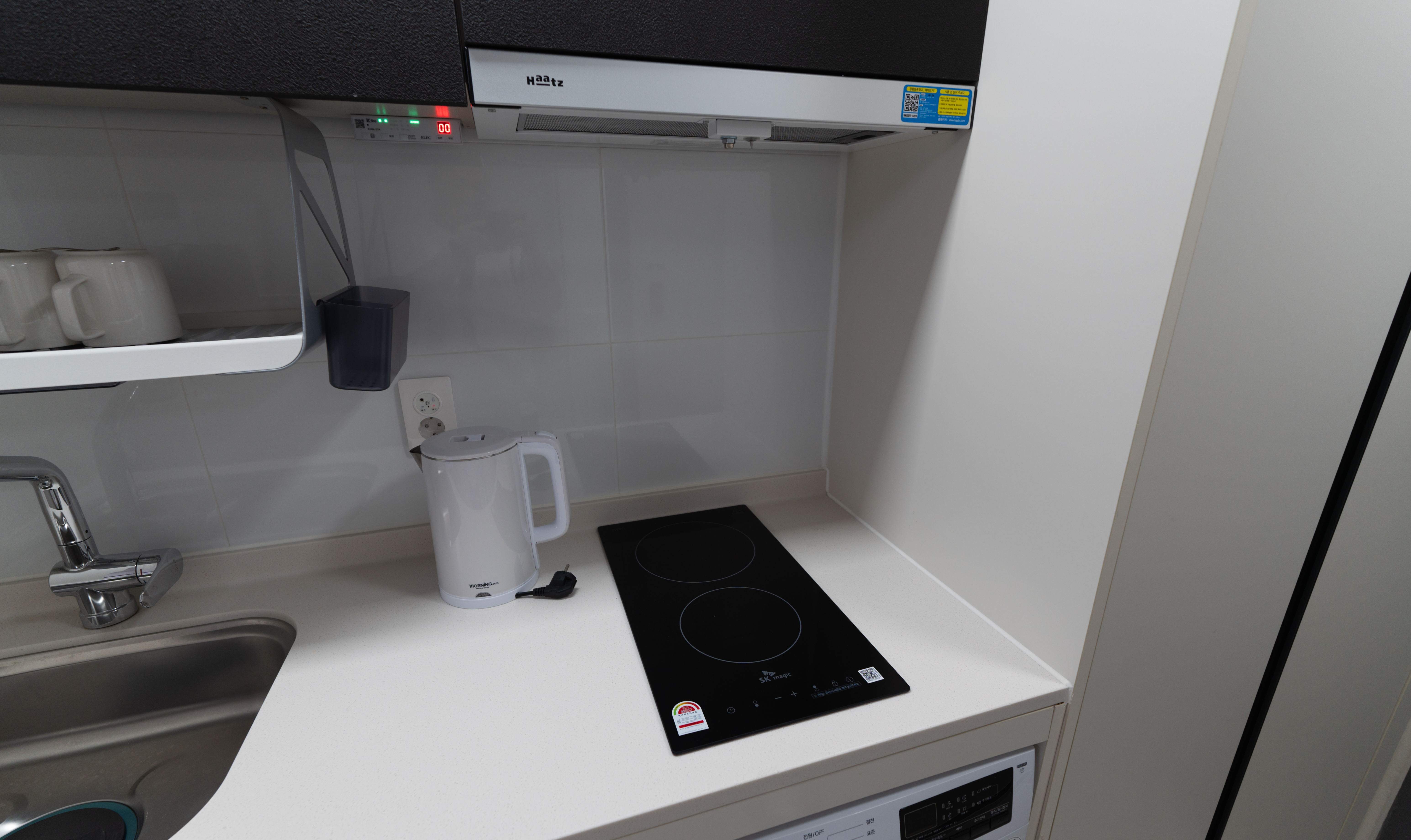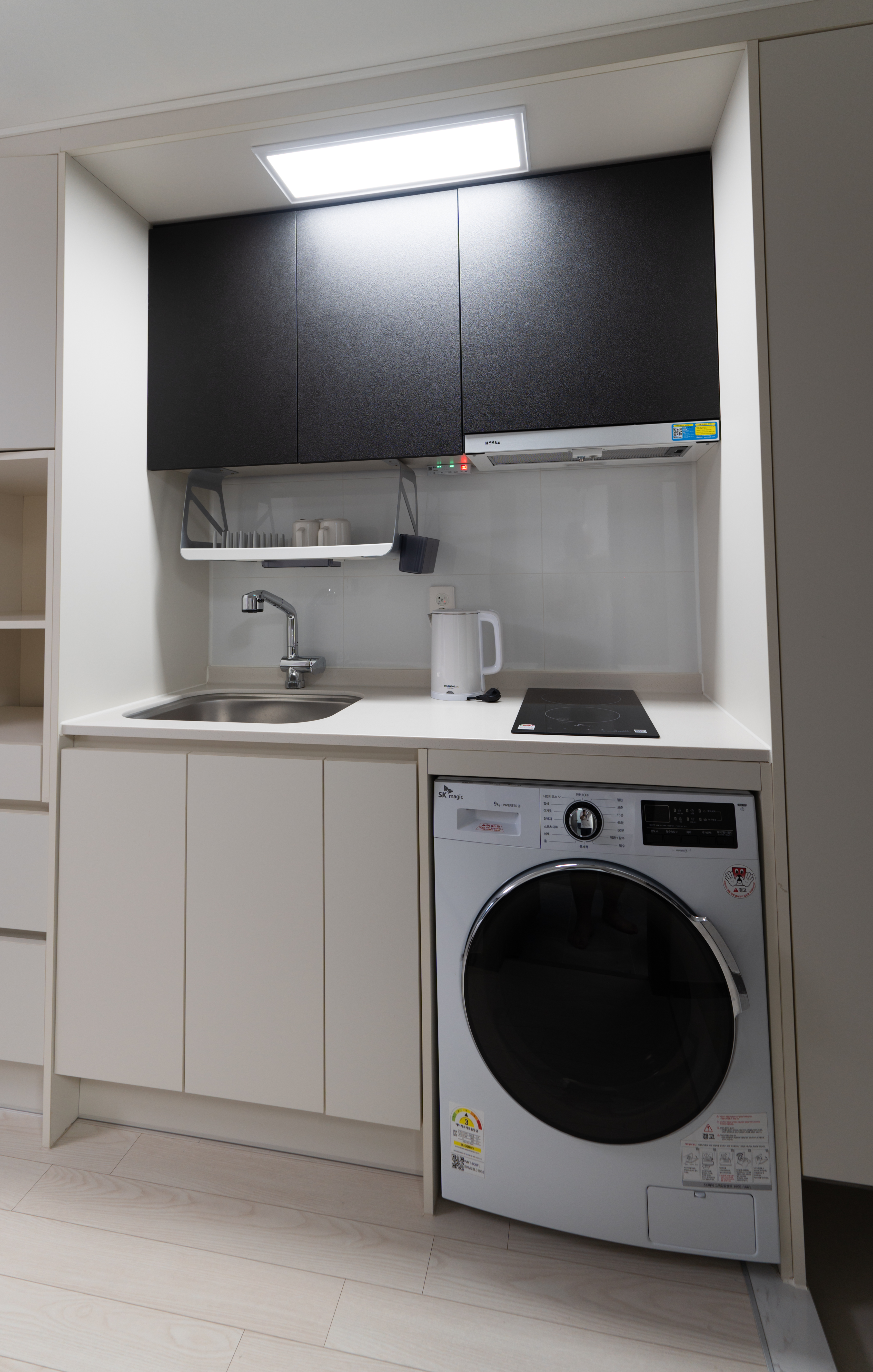 앞서도 언급했지만 이곳은 레지던스형 호텔이라 그런지 작지만 실용적인 주방이 있었습니다. 주방에는 세탁기를 비롯해 하이라이트가 있어서 간단한 조리를 해 먹을 수도 있었습니다.