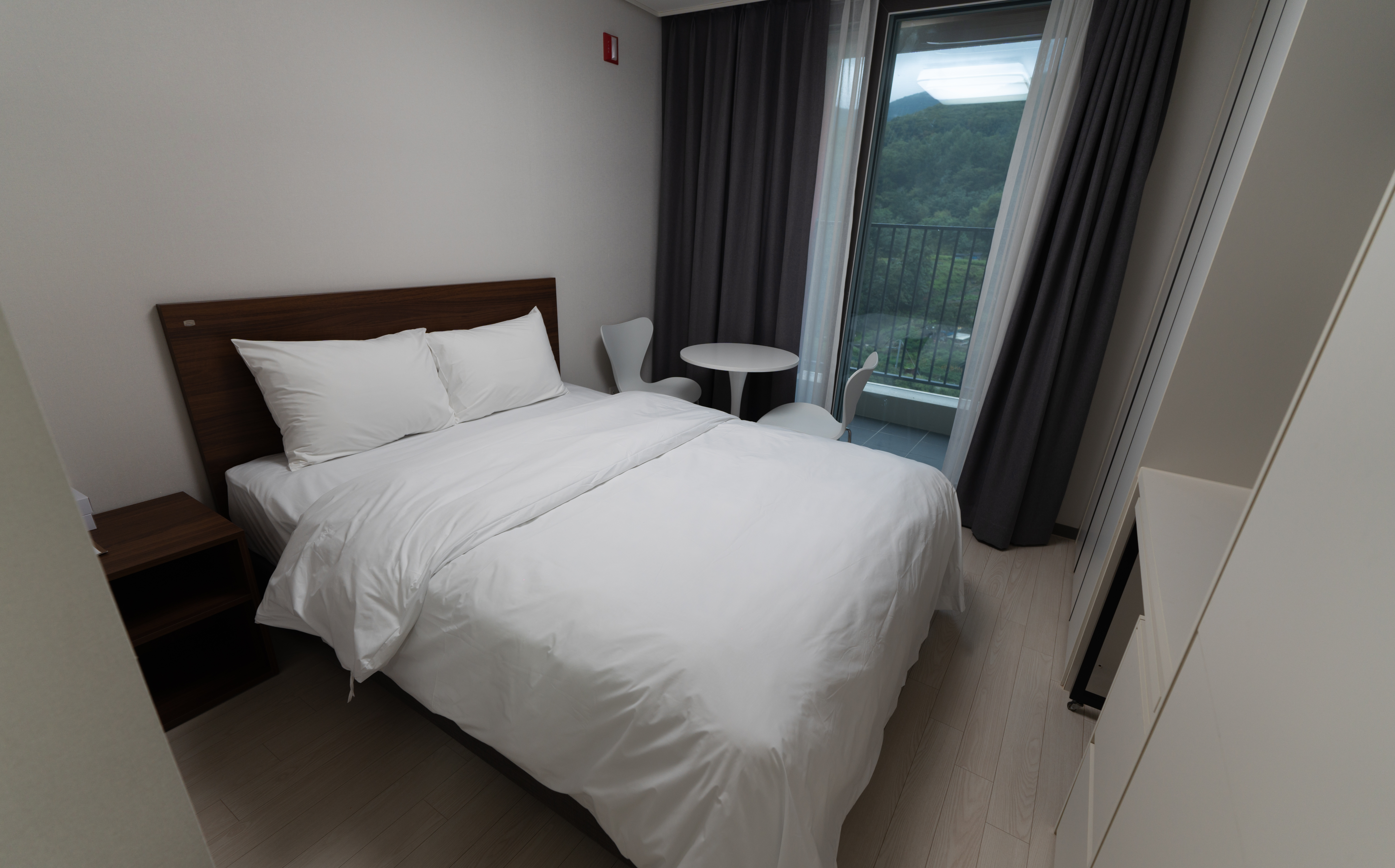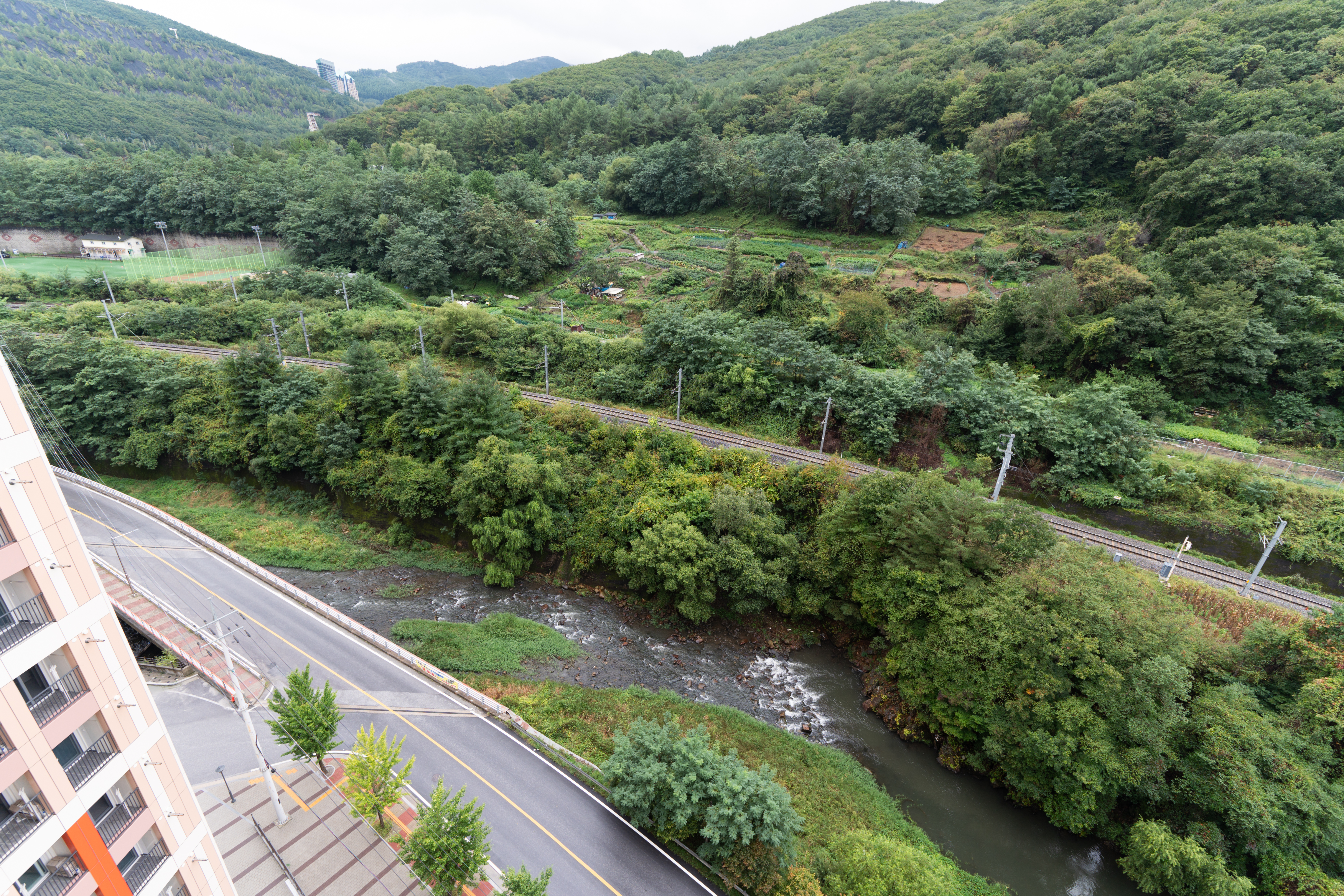 아리아리호텔의 객실은 건물의 컨디션과 동일하게 깔끔한 수준이었습니다. 크기가 넓은 건 아니었지만, 나름 작은 규모에도 곳곳에 수납장도 많고 세탁기부터 생활가전들이 많이 있어서 편리했습니다. 멋진 뷰는 아니지만 객실 밖으로 보이는 정선의 계곡뷰가 있었습니다.