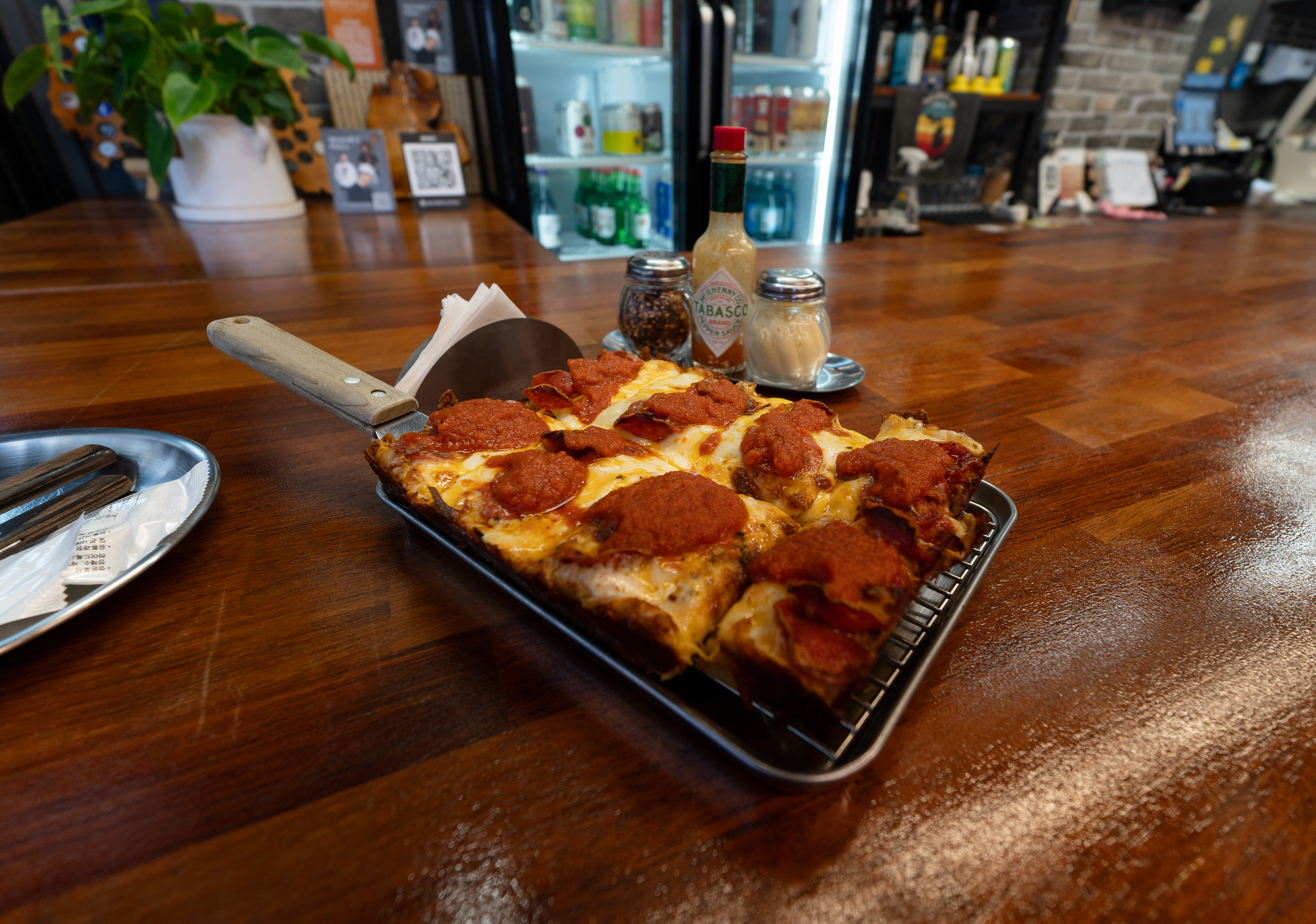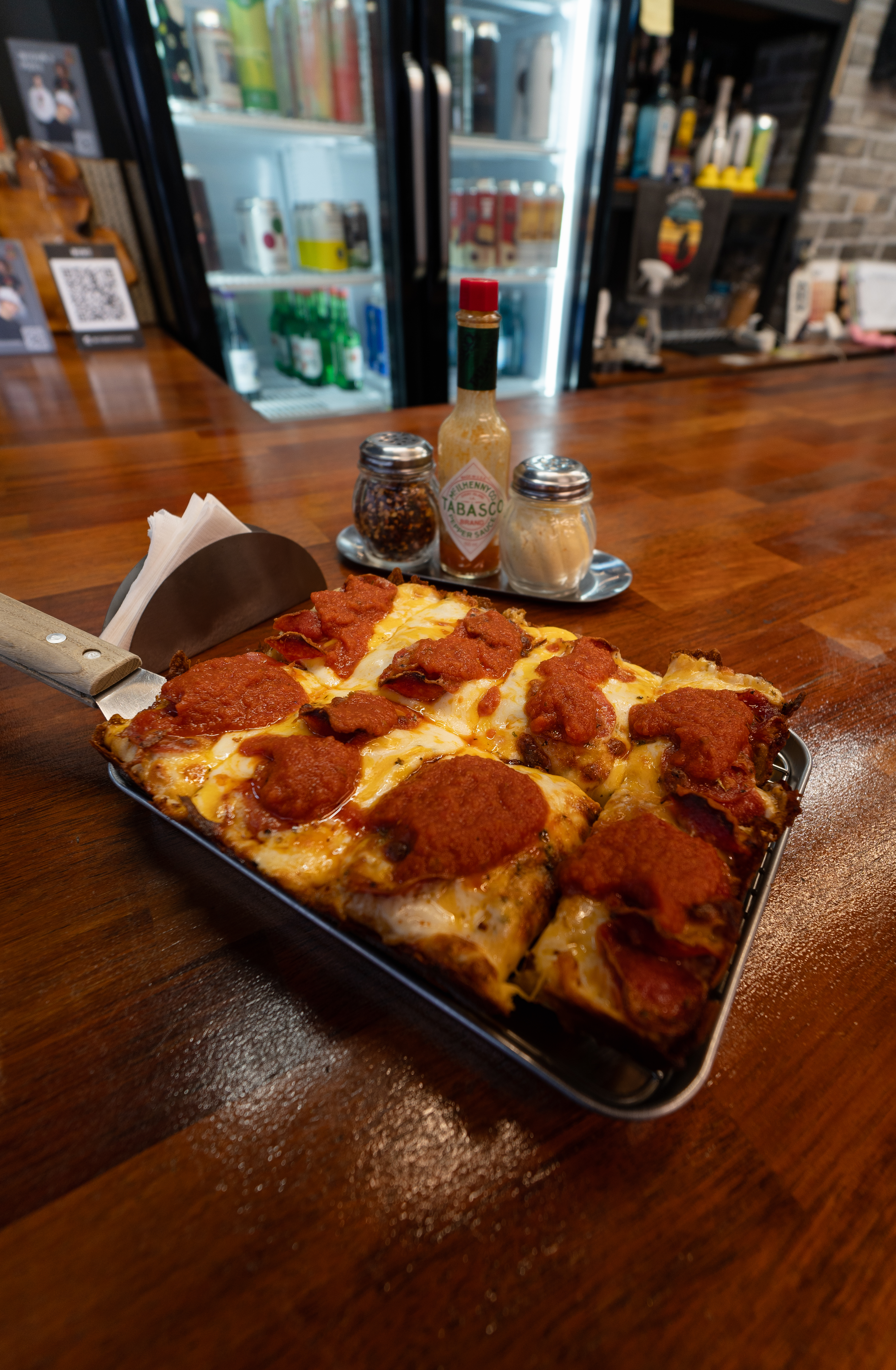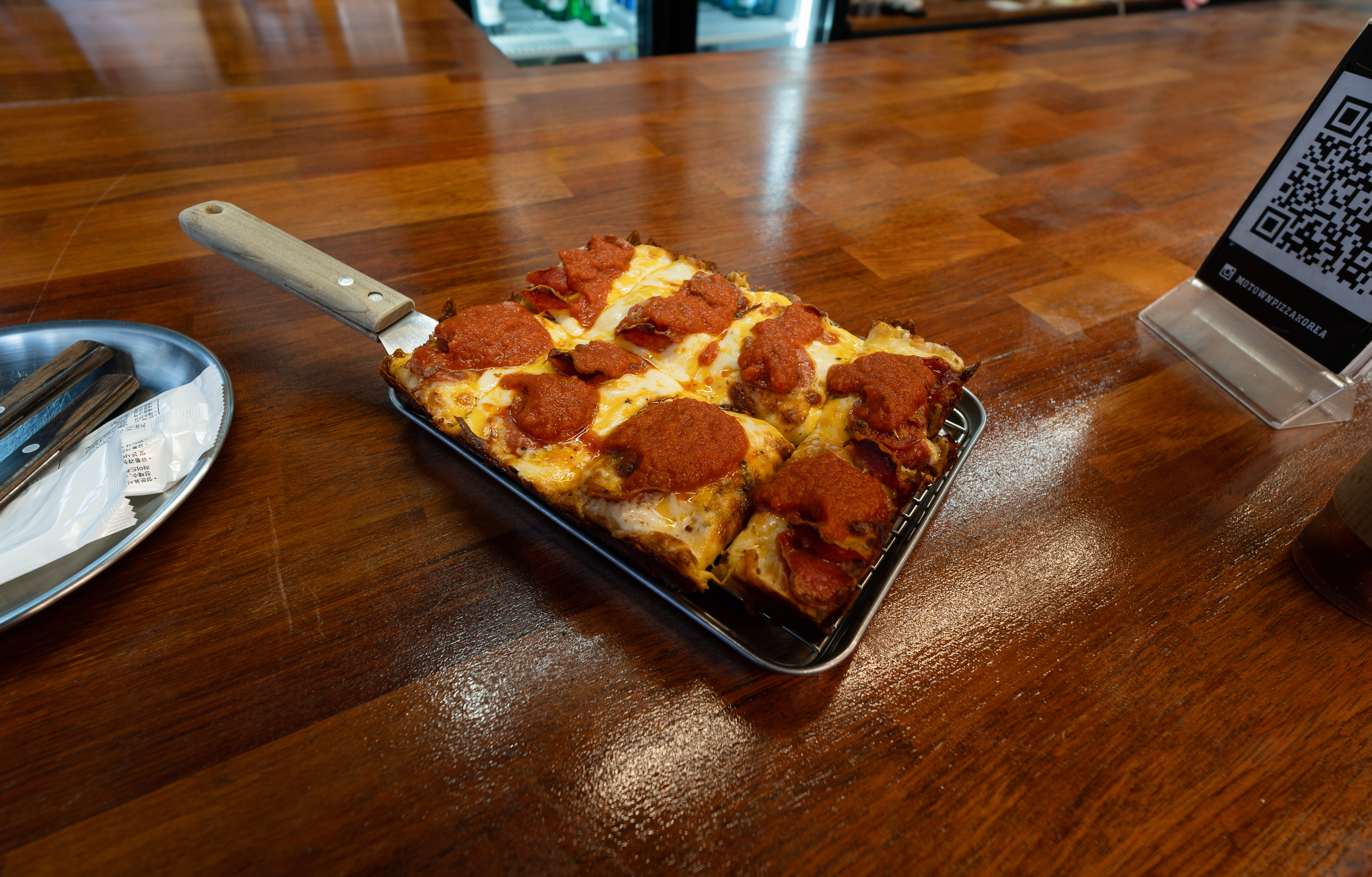 모타운 피자는 위와같이 파마산치즈, 고춧가루(크러시드 레드페퍼), 타바스코 핫소스가 함께 나왔습니다. 피자는 우리가 일반적으로 생각하는 원형의 피자가 아니었고, 네모난 형태의 피자였습니다.