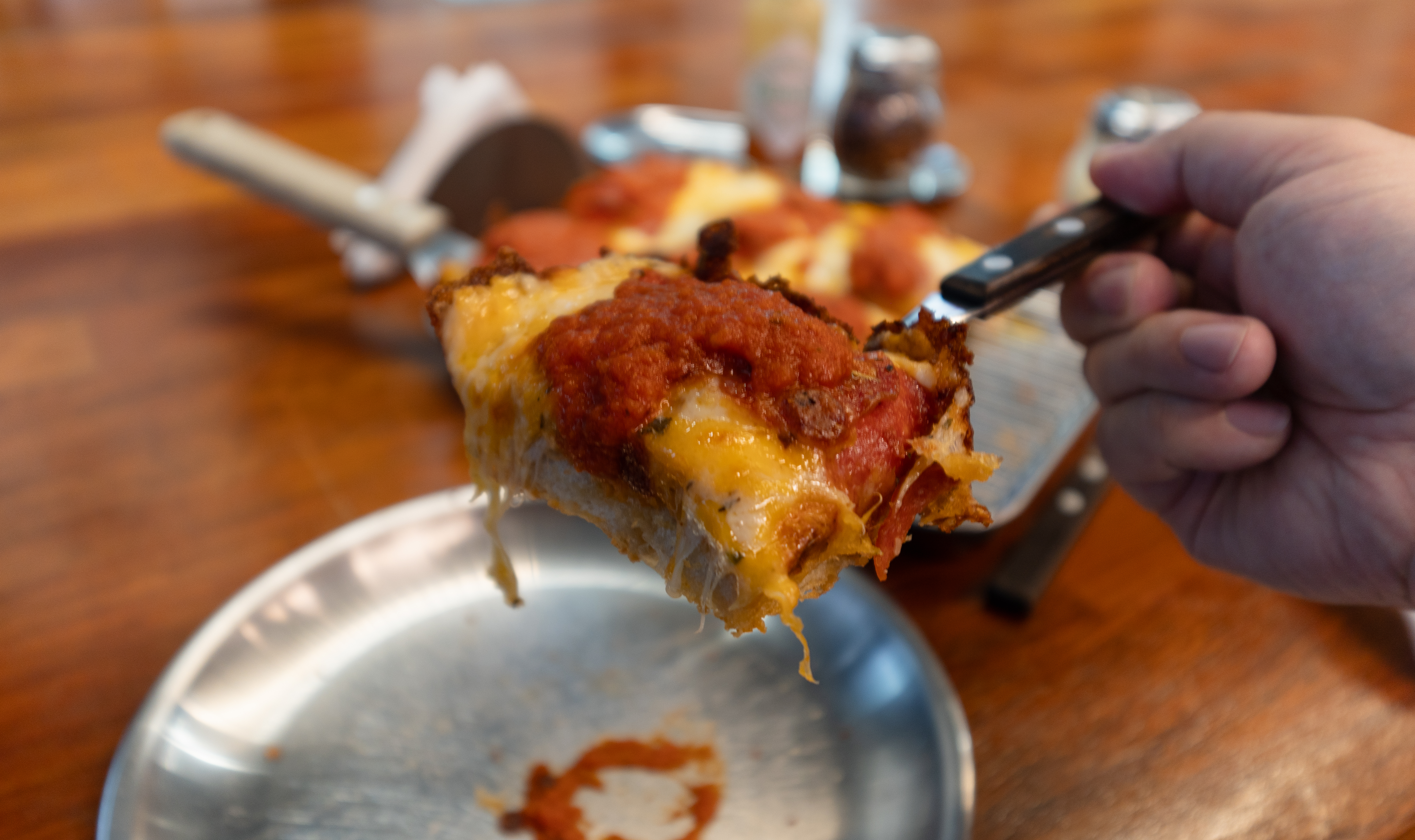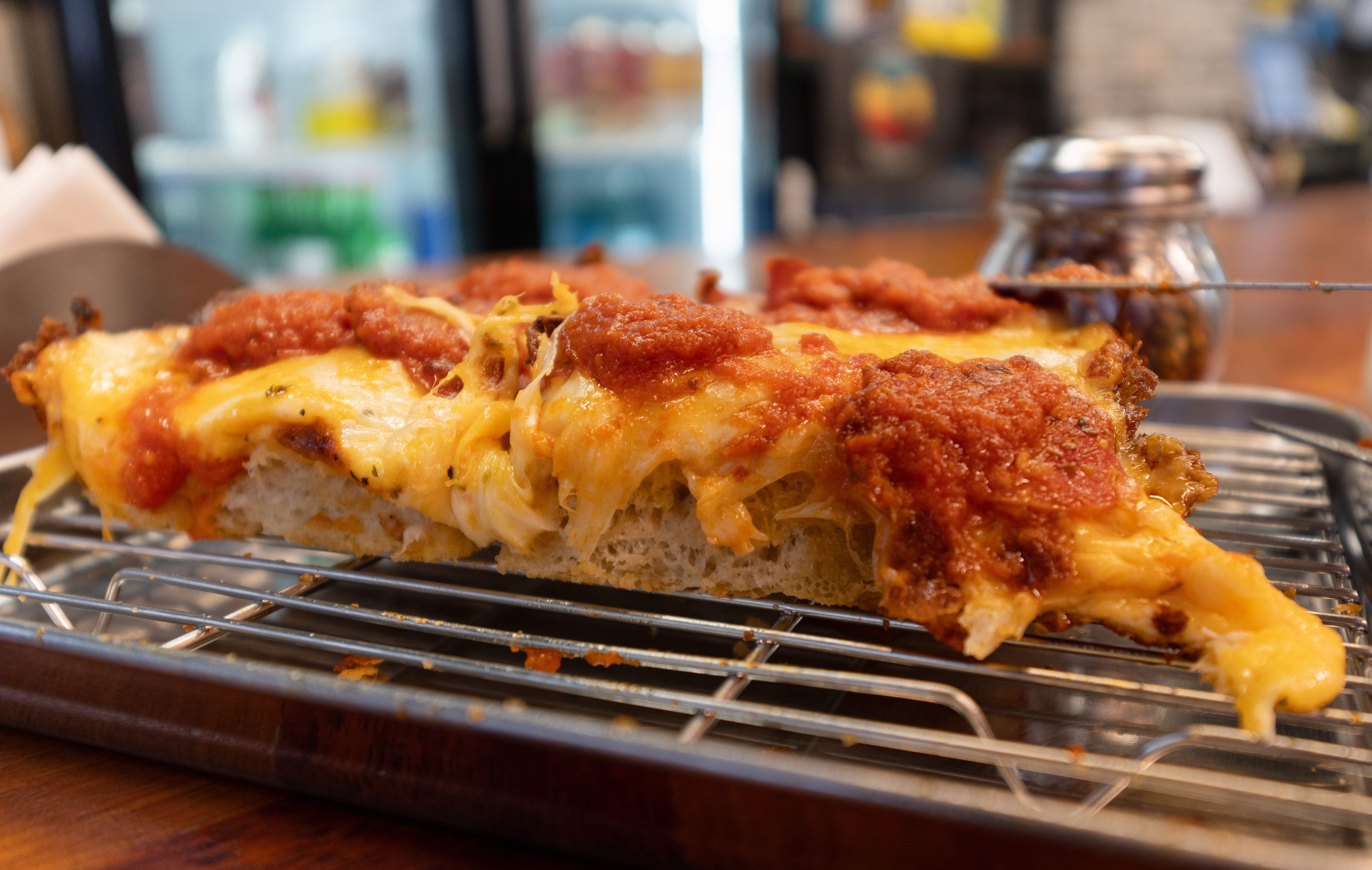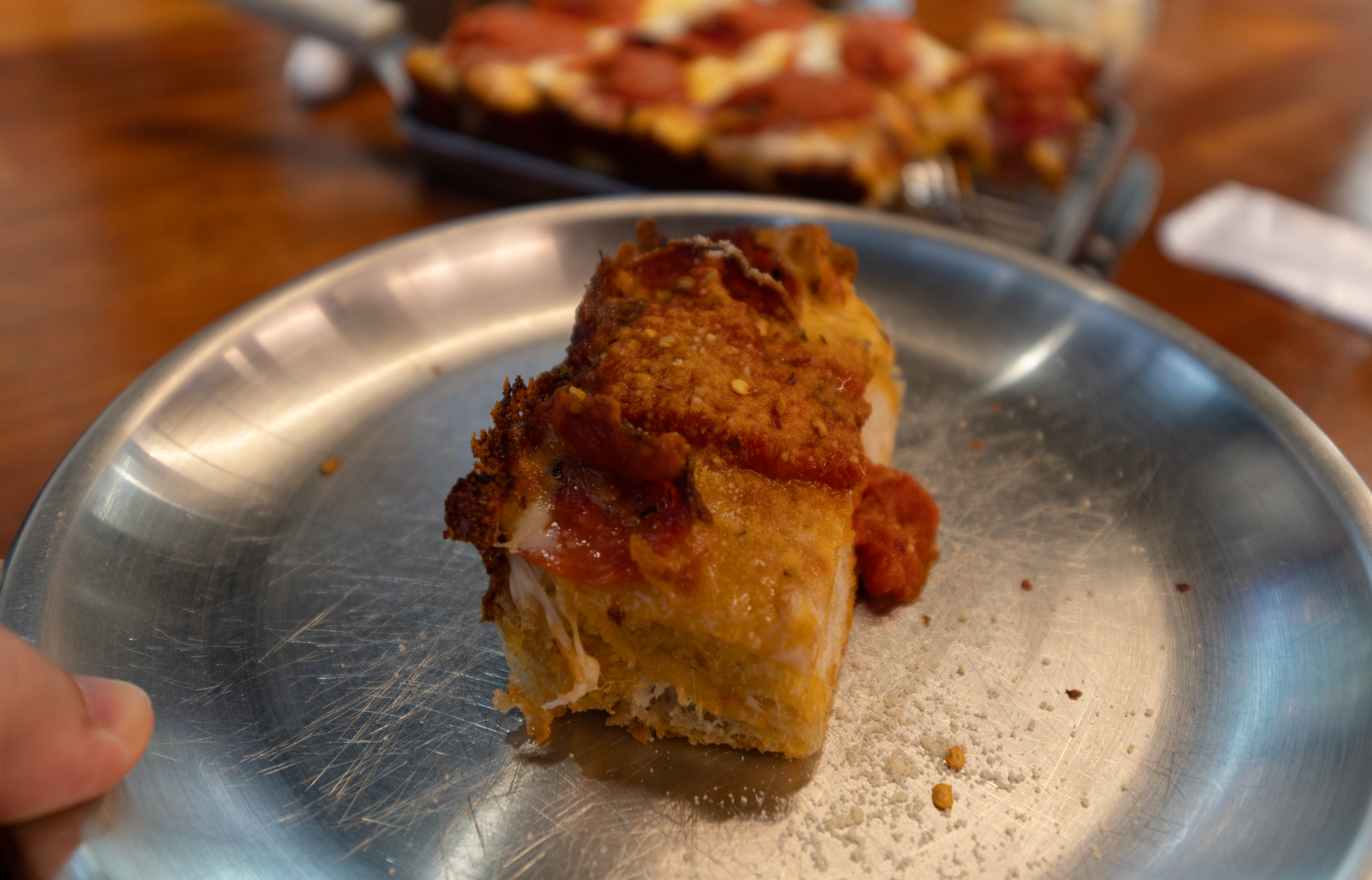 모타운 피자는 위와같이 파마산치즈, 고춧가루(크러시드 레드페퍼), 타바스코 핫소스가 함께 나왔습니다. 피자는 우리가 일반적으로 생각하는 원형의 피자가 아니었고, 네모난 형태의 피자였습니다.