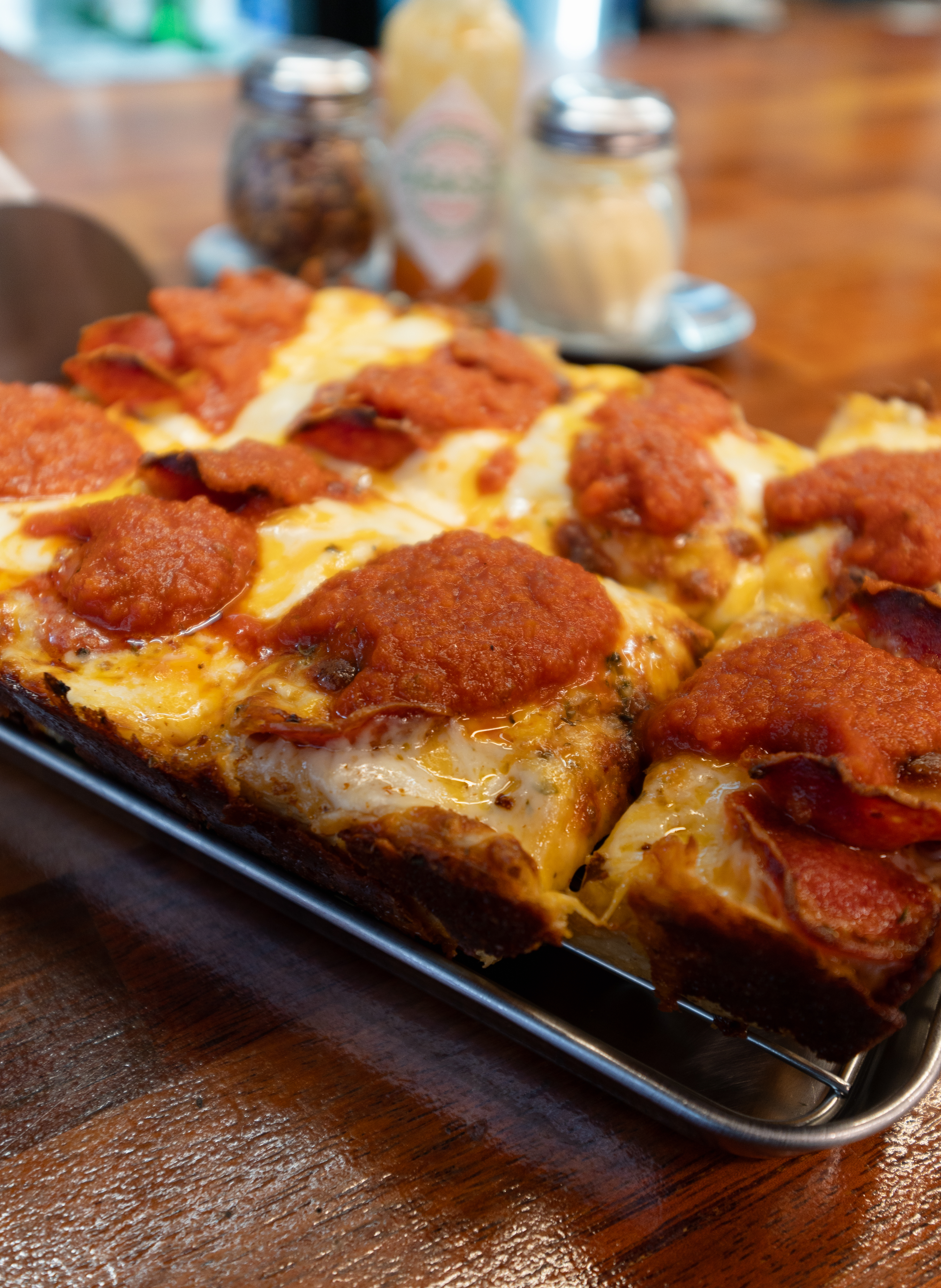 모타운 피자는 위와같이 파마산치즈, 고춧가루(크러시드 레드페퍼), 타바스코 핫소스가 함께 나왔습니다. 피자는 우리가 일반적으로 생각하는 원형의 피자가 아니었고, 네모난 형태의 피자였습니다.