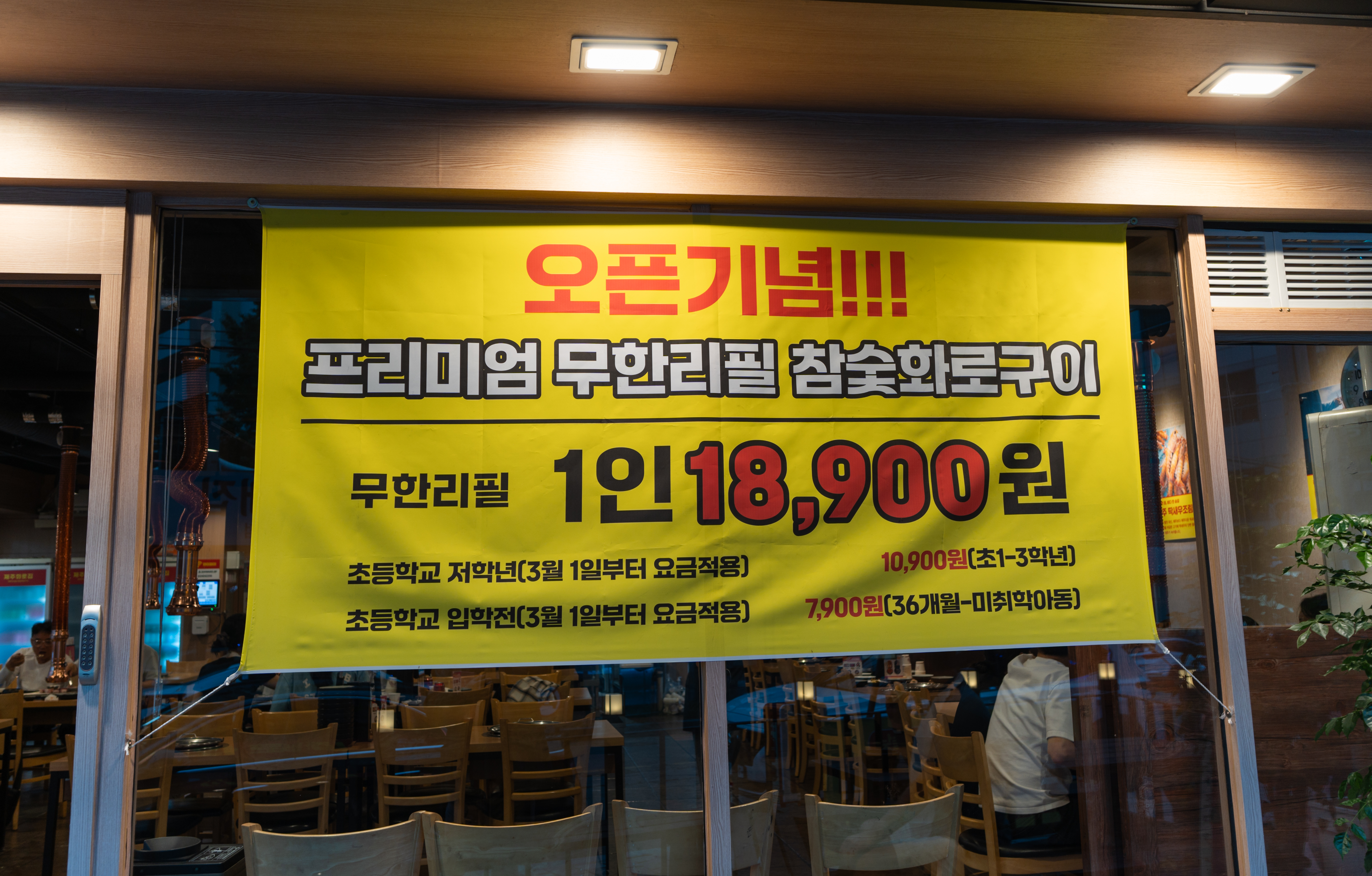 가격은 프리미엄 무한리필 참숯화로구이 가격은 오픈기념 성인기준 1인 18,900원, 초등학교 저학년 10,900원, 초등학교 입학 전 7,900원이었습니다.