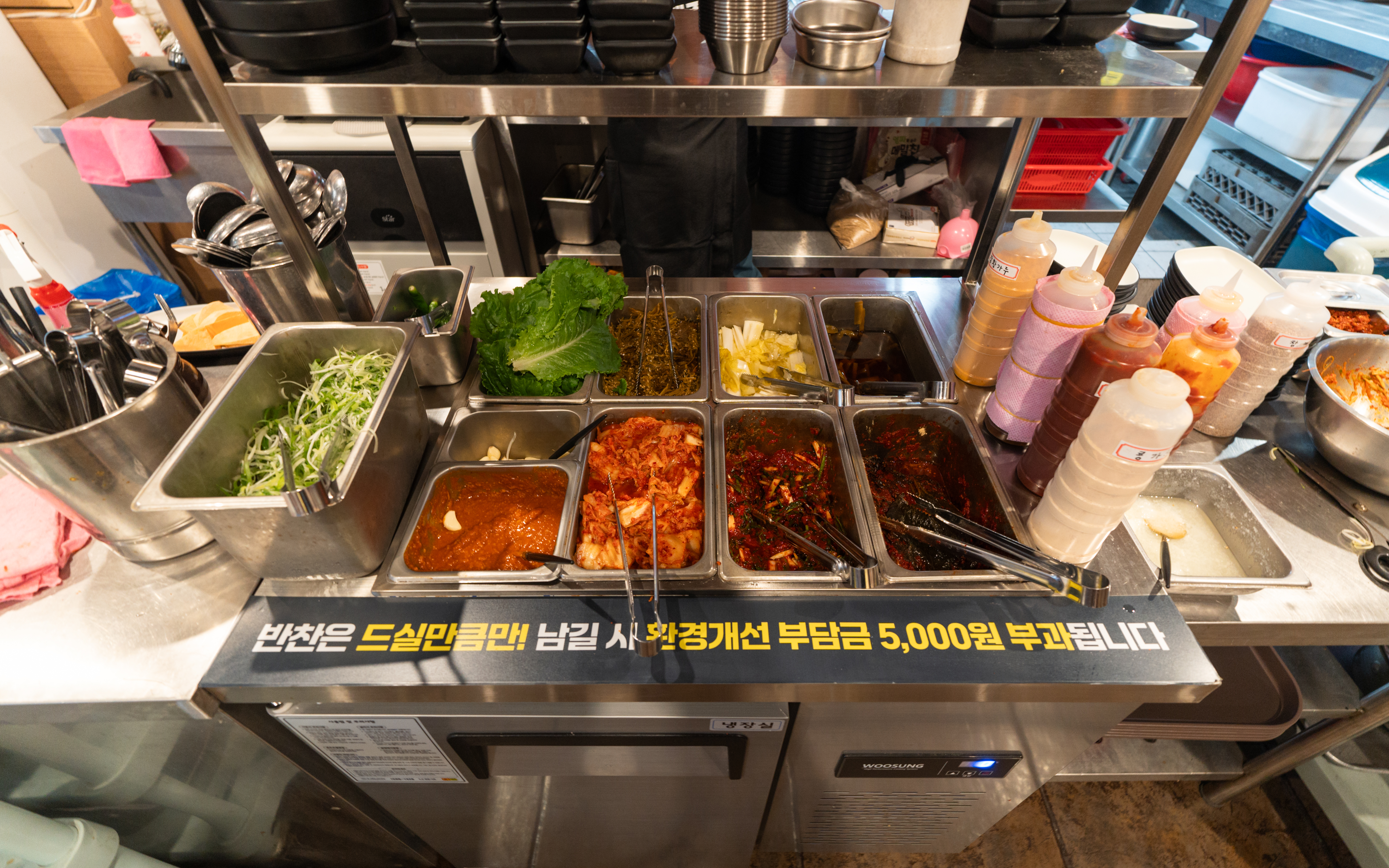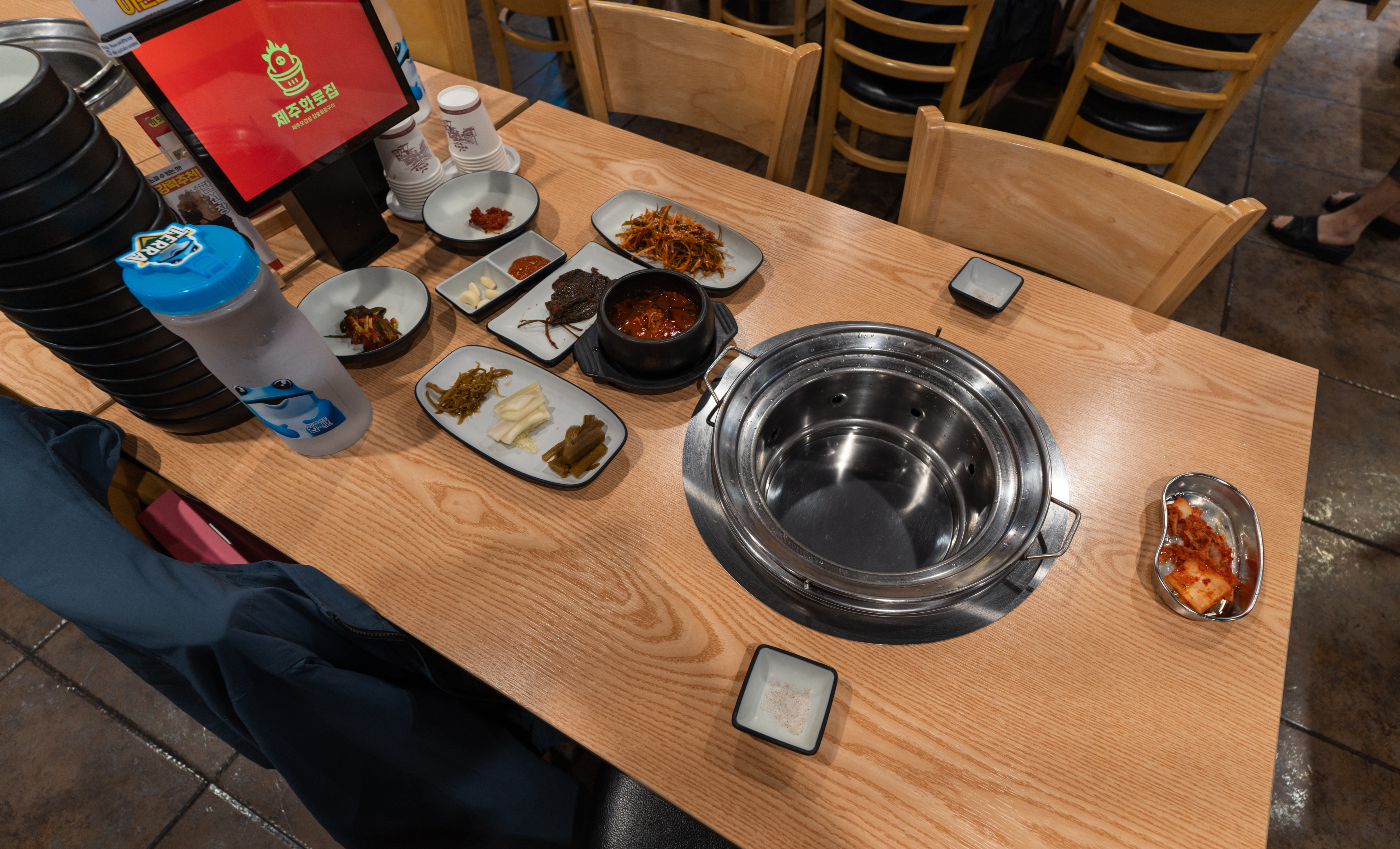 제주화로집 가락점은 기본적으로 메뉴를 자리에 위치한 태블릿으로 주문하였고, 부족한 반찬은 셀프바에서 직접 가져다 먹을 수도 있었습니다. 처음에는 삼겹살과 목살이 기본적으로 제공되었고, 이후에는 껍데기, 양념갈비를 포함해 4종류의 메뉴를 직접 주문할 수 있었습니다.