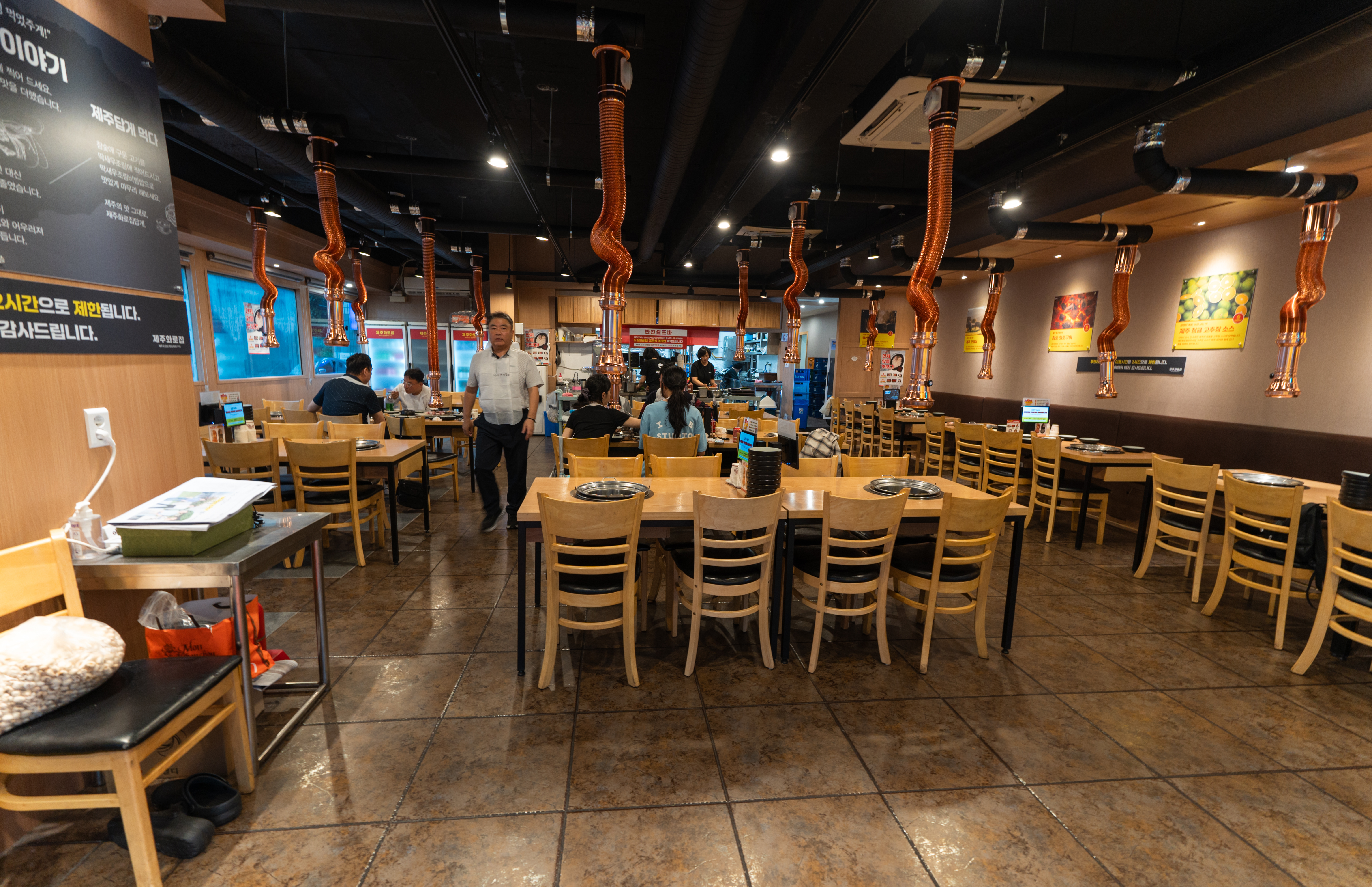 제주화로집 가락점은 기본적으로 메뉴를 자리에 위치한 태블릿으로 주문하였고, 부족한 반찬은 셀프바에서 직접 가져다 먹을 수도 있었습니다. 처음에는 삼겹살과 목살이 기본적으로 제공되었고, 이후에는 껍데기, 양념갈비를 포함해 4종류의 메뉴를 직접 주문할 수 있었습니다.