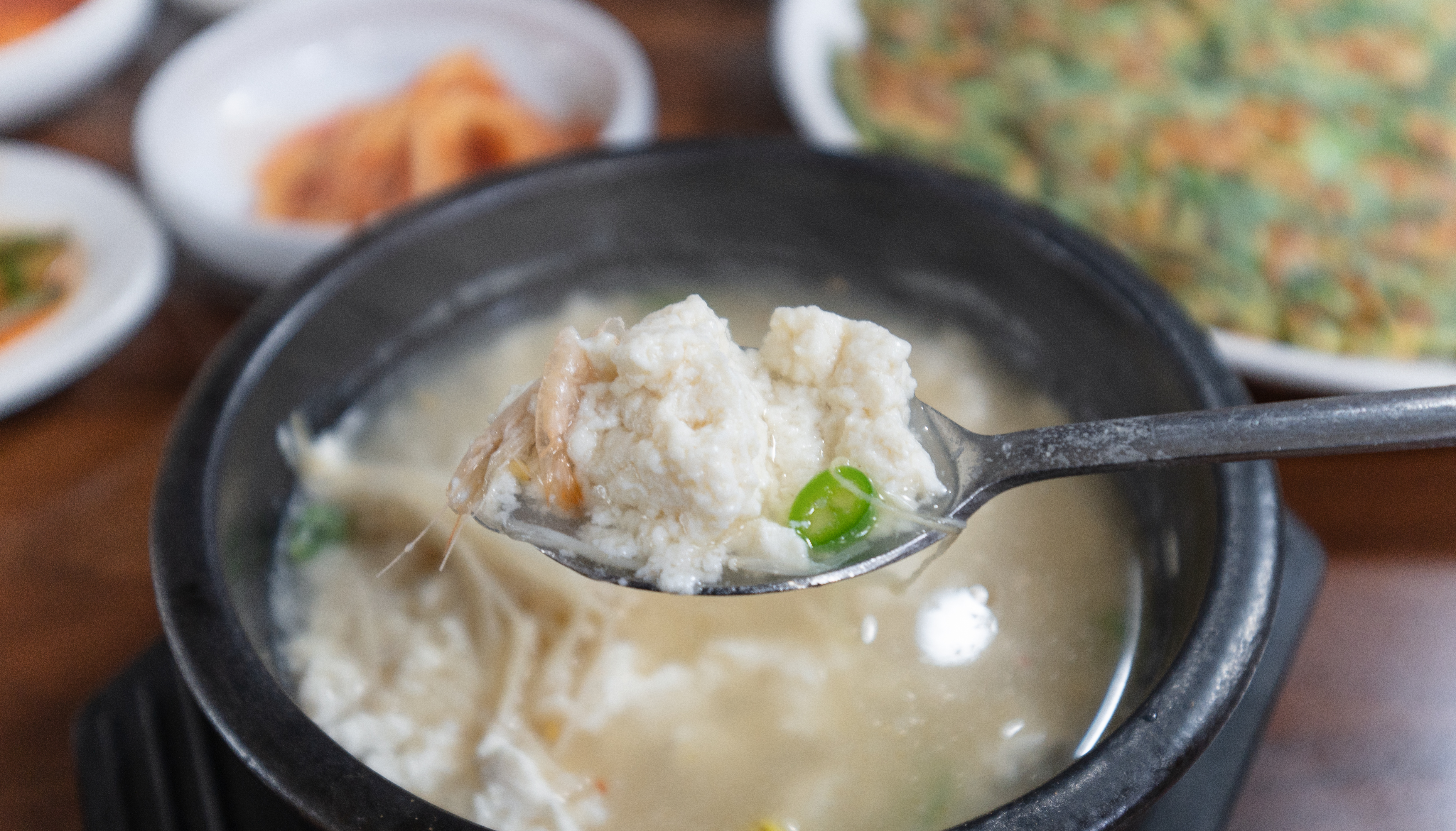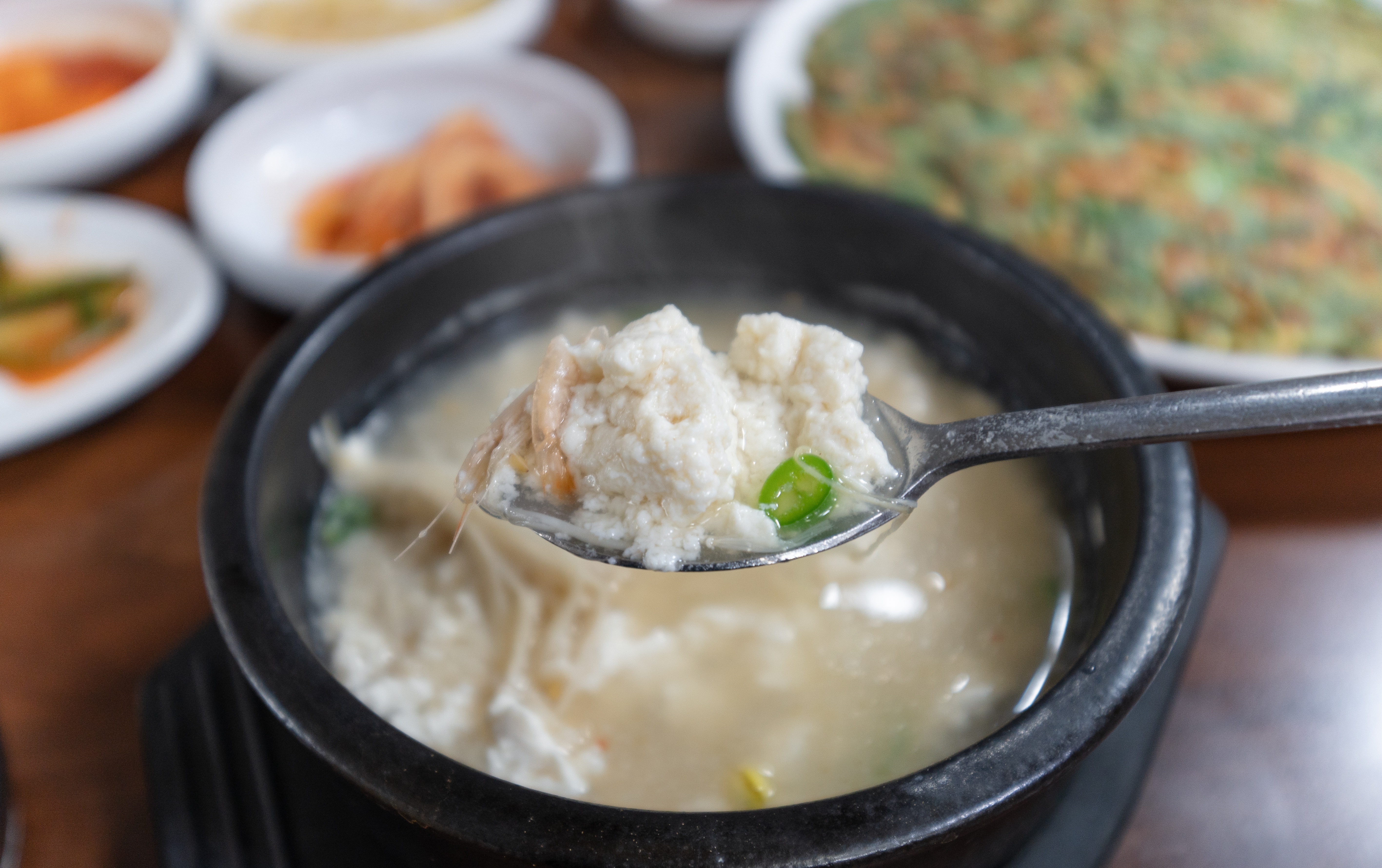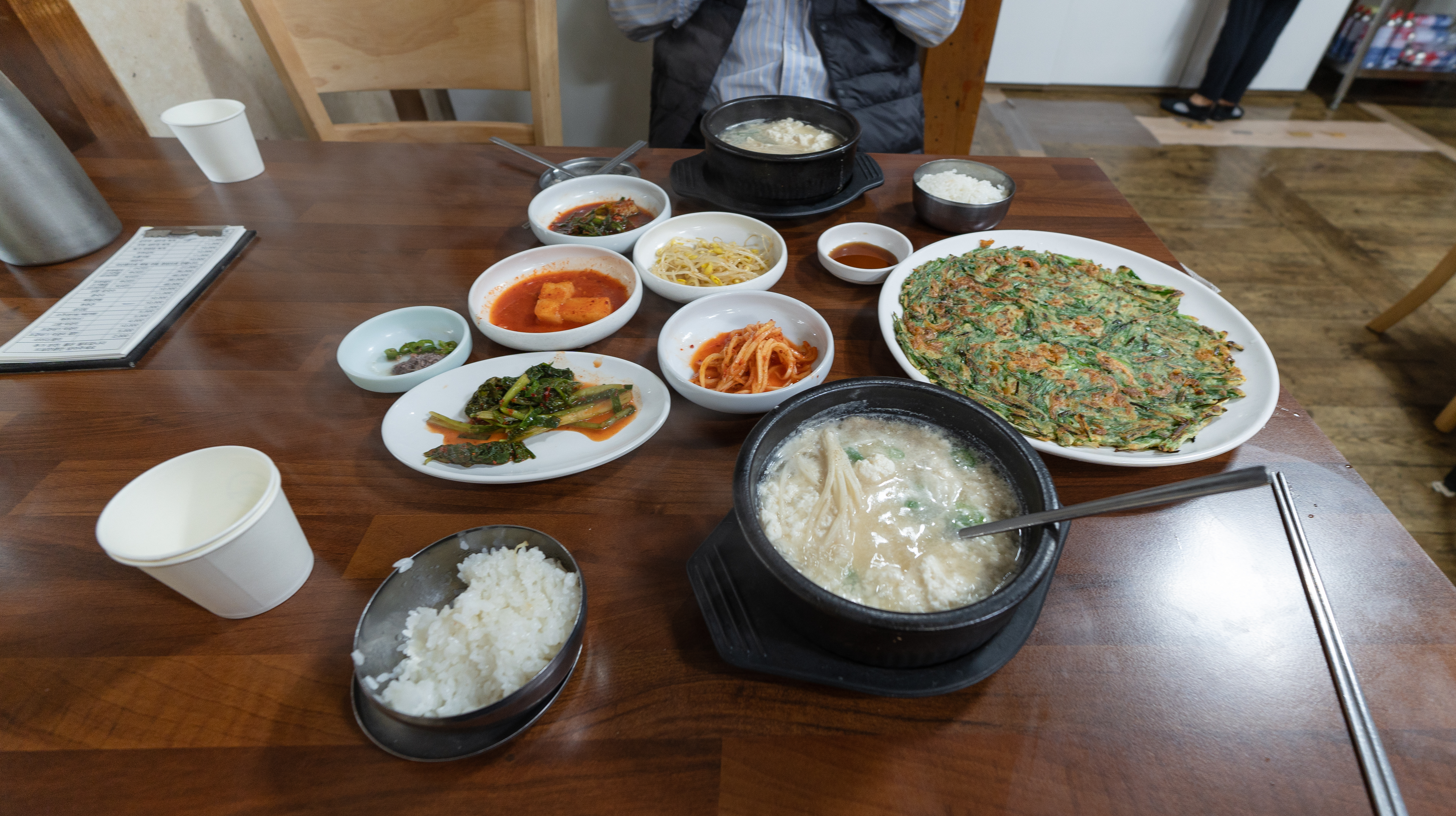주문한 토가의 순두부새우젓찌개와 부추전이 나왔습니다. 이곳에는 곤쟁이젓이라는 반찬을 함께 내어주시는데, 곤쟁이젓은 일반 새우젓보다 약간 더 비릿하고 진한맛이 느껴지는 젓갈이었습니다.