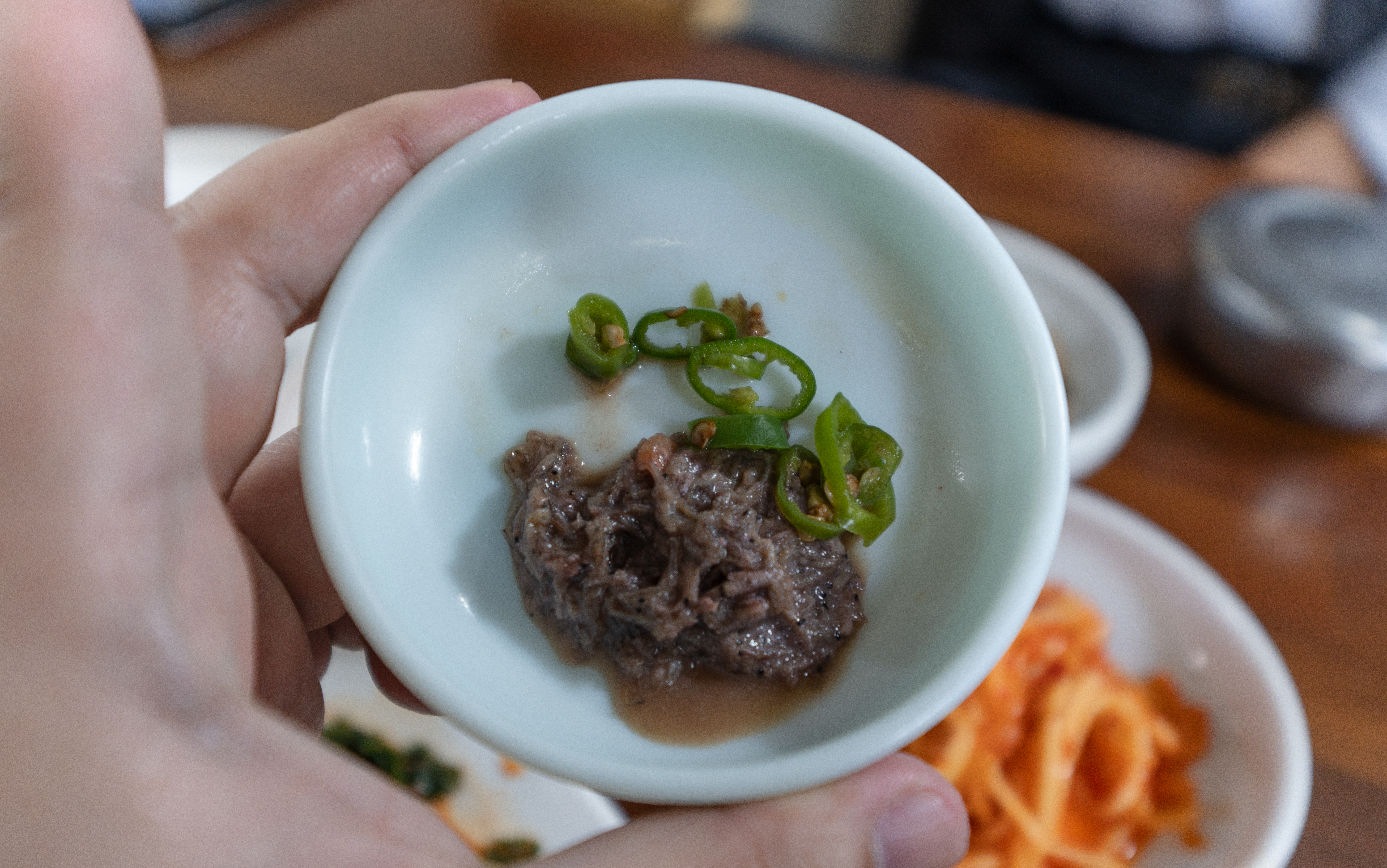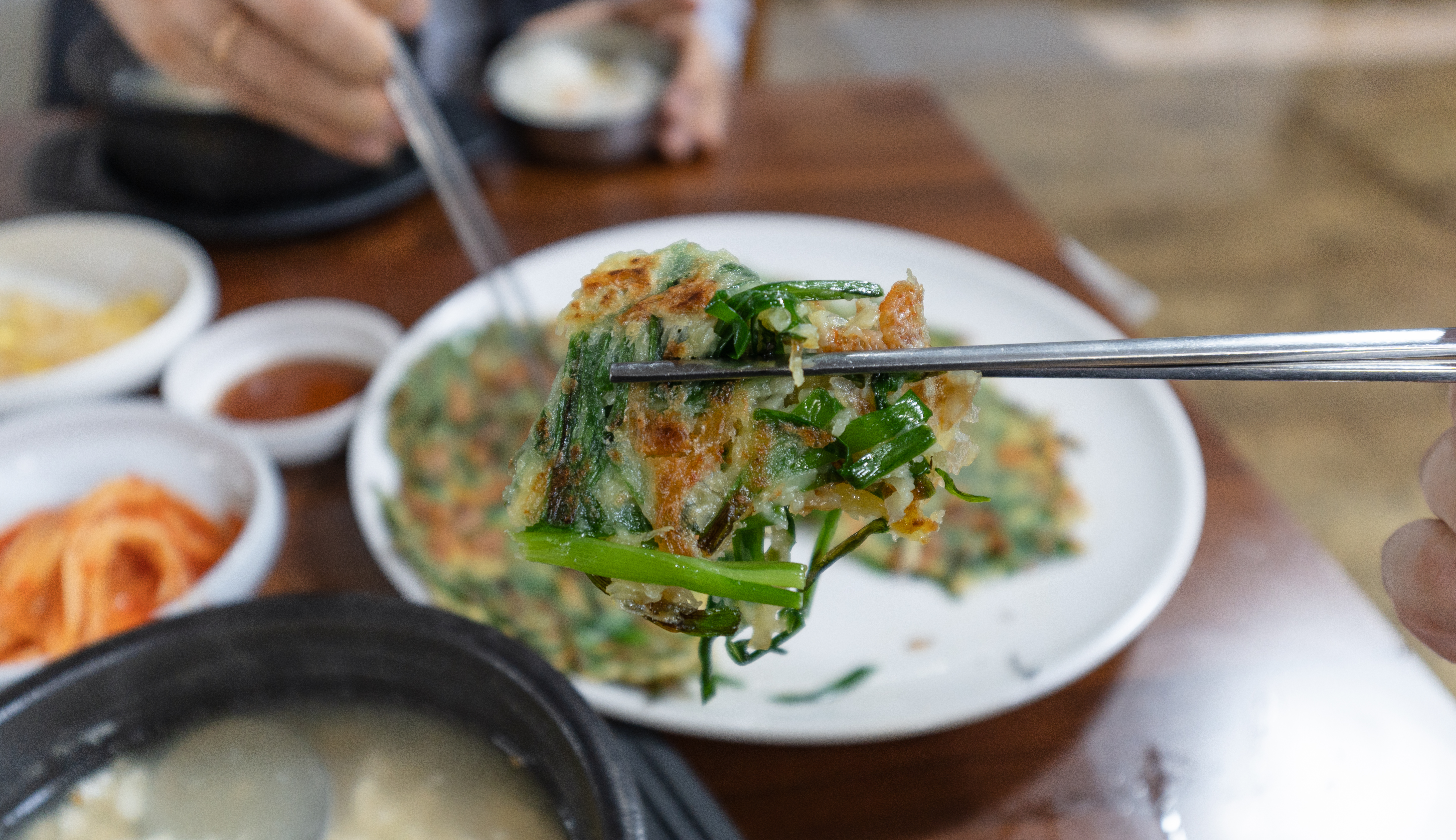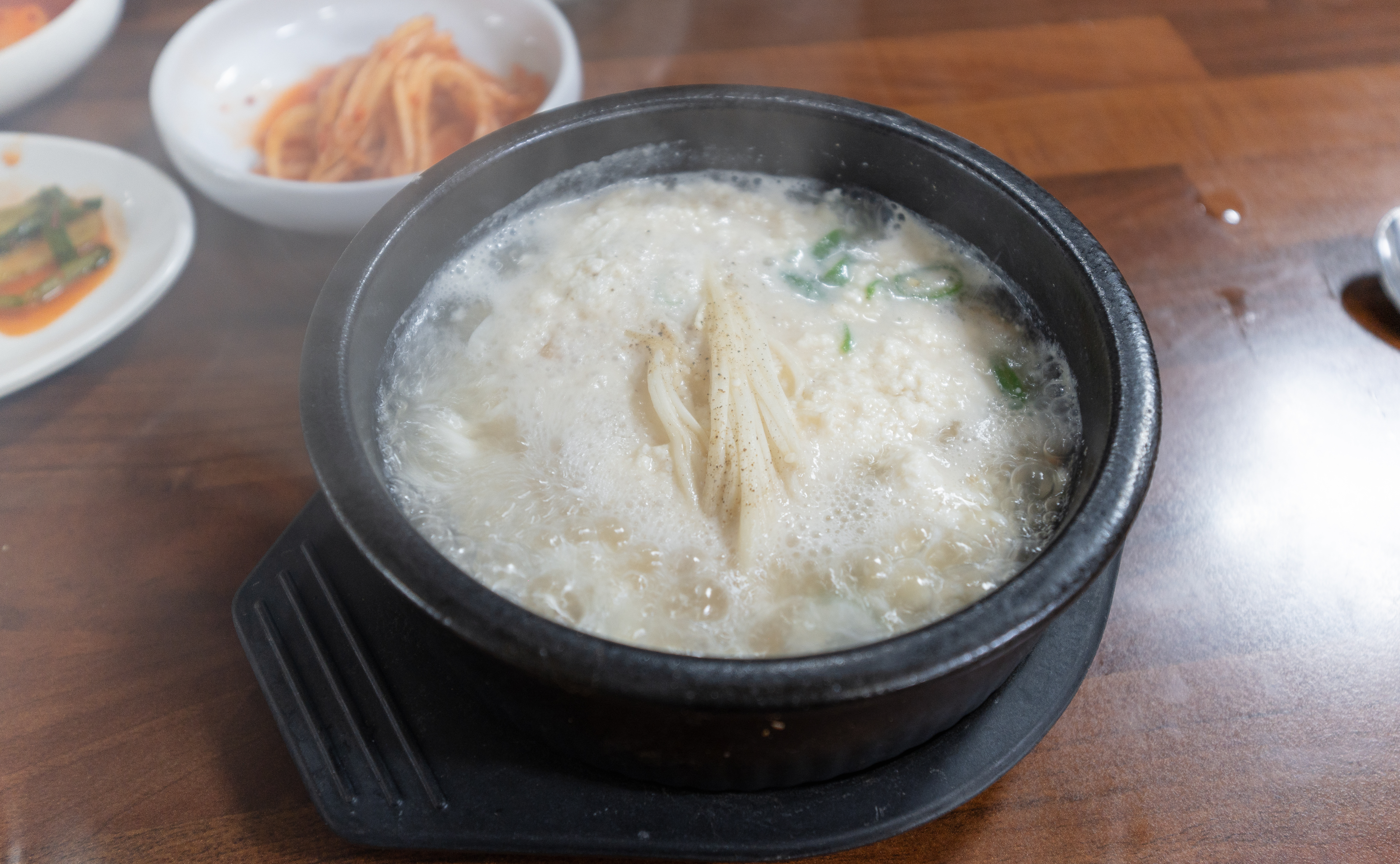 주문한 토가의 순두부새우젓찌개와 부추전이 나왔습니다. 이곳에는 곤쟁이젓이라는 반찬을 함께 내어주시는데, 곤쟁이젓은 일반 새우젓보다 약간 더 비릿하고 진한맛이 느껴지는 젓갈이었습니다.