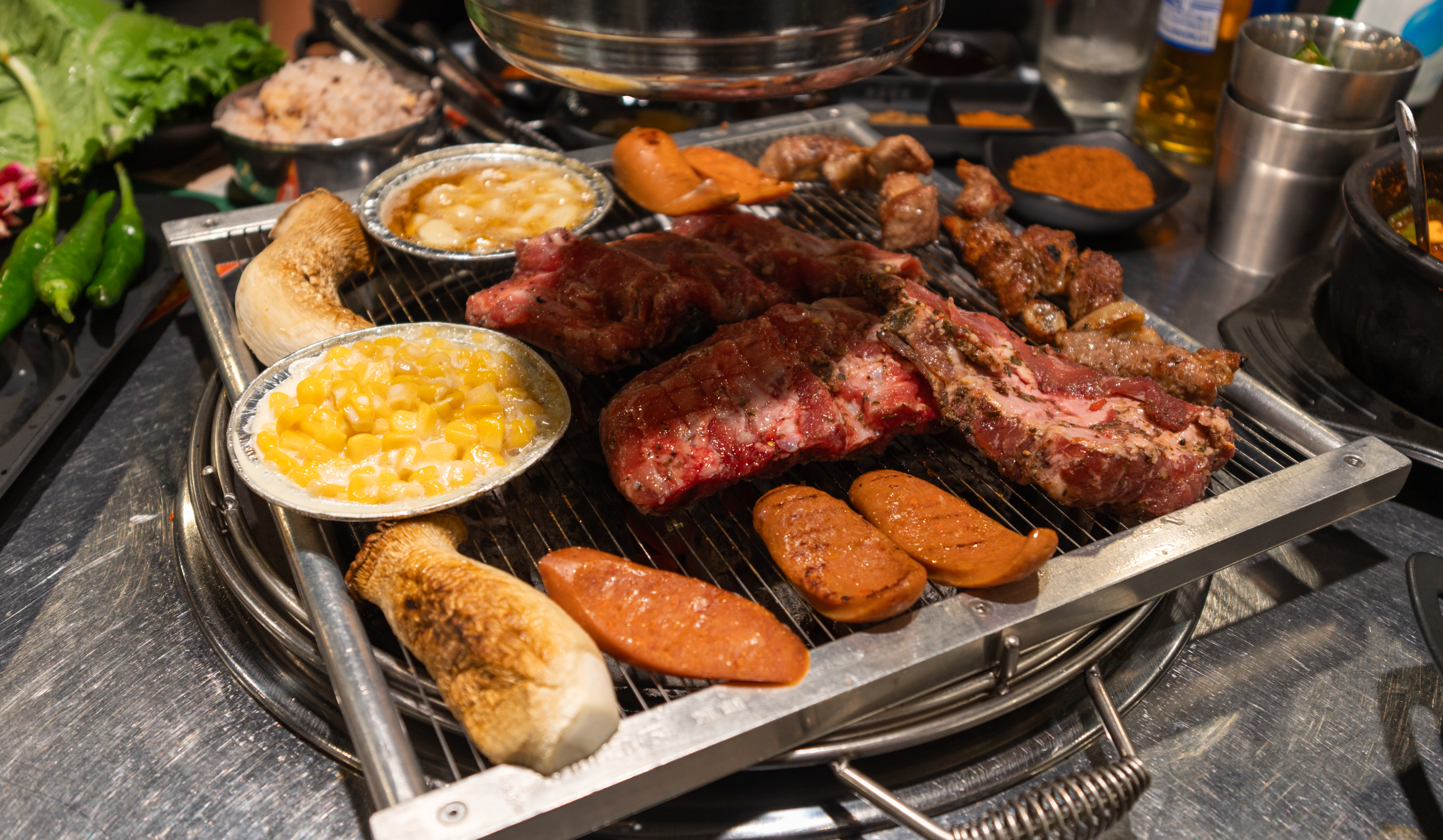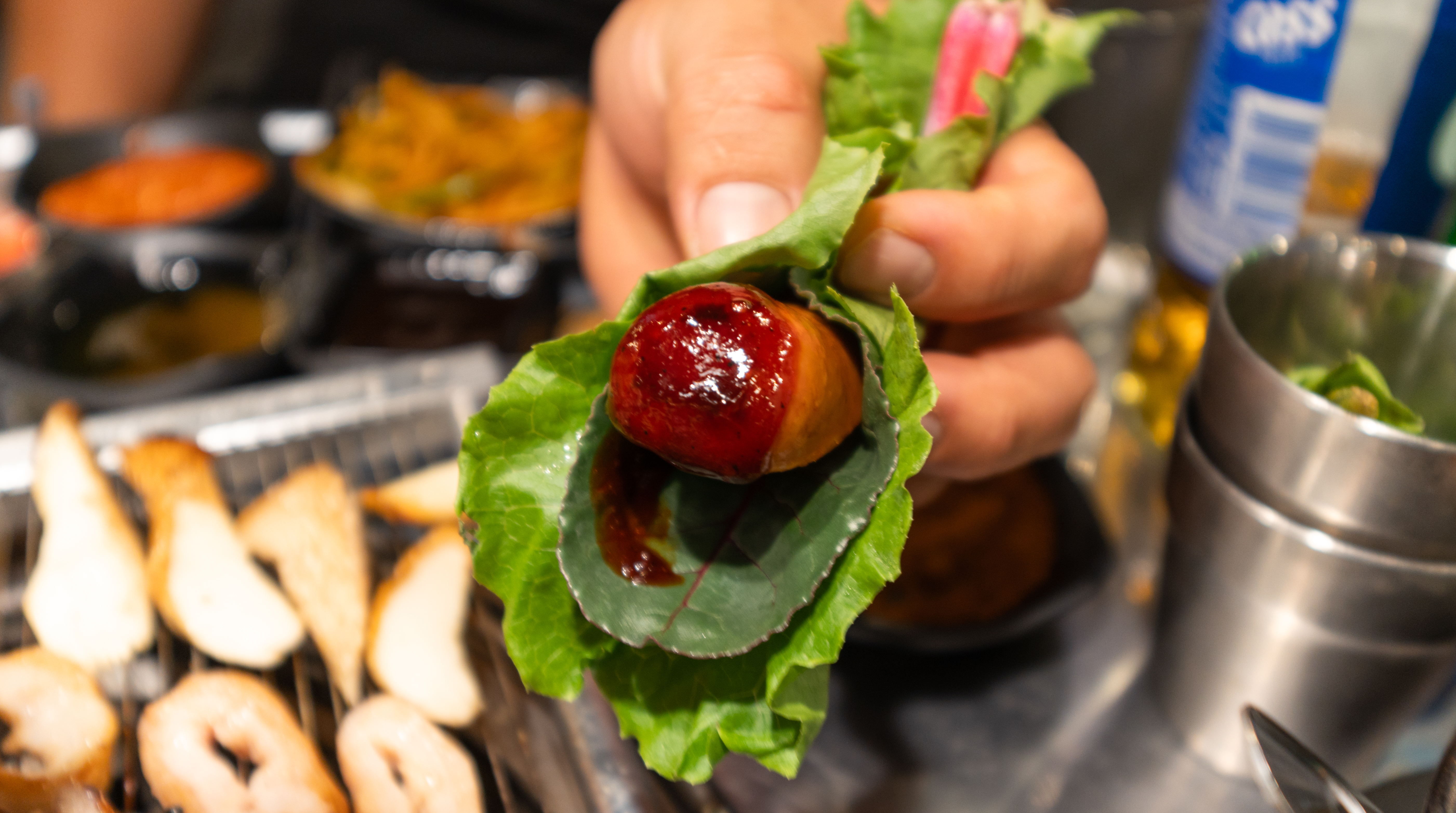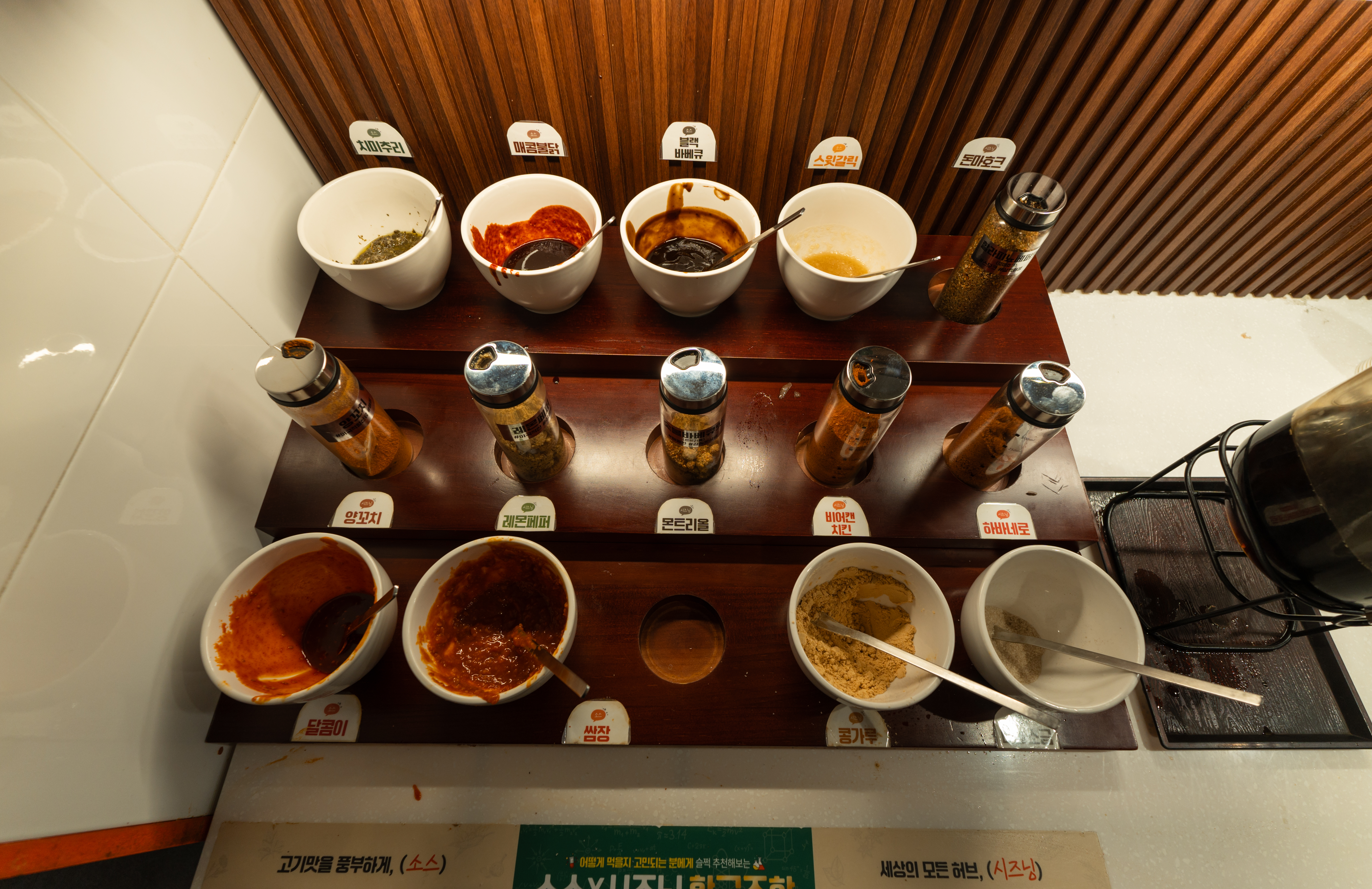 반찬은 버섯, 떡, 마늘, 고추, 근대, 상추, 양파채, 무생채, 소시지, 배추김치, 옥수수, 파채 등이 있었고, 소스류는 치미추리, 매콤불닭, 블랙바베큐, 스윗갈릭, 돈마호크, 양꼬치, 레몬페퍼, 몬트리올, 비어캔치킨, 하바네로, 달콤이, 쌈장, 콩가루, 소금 등이 있었습니다.
