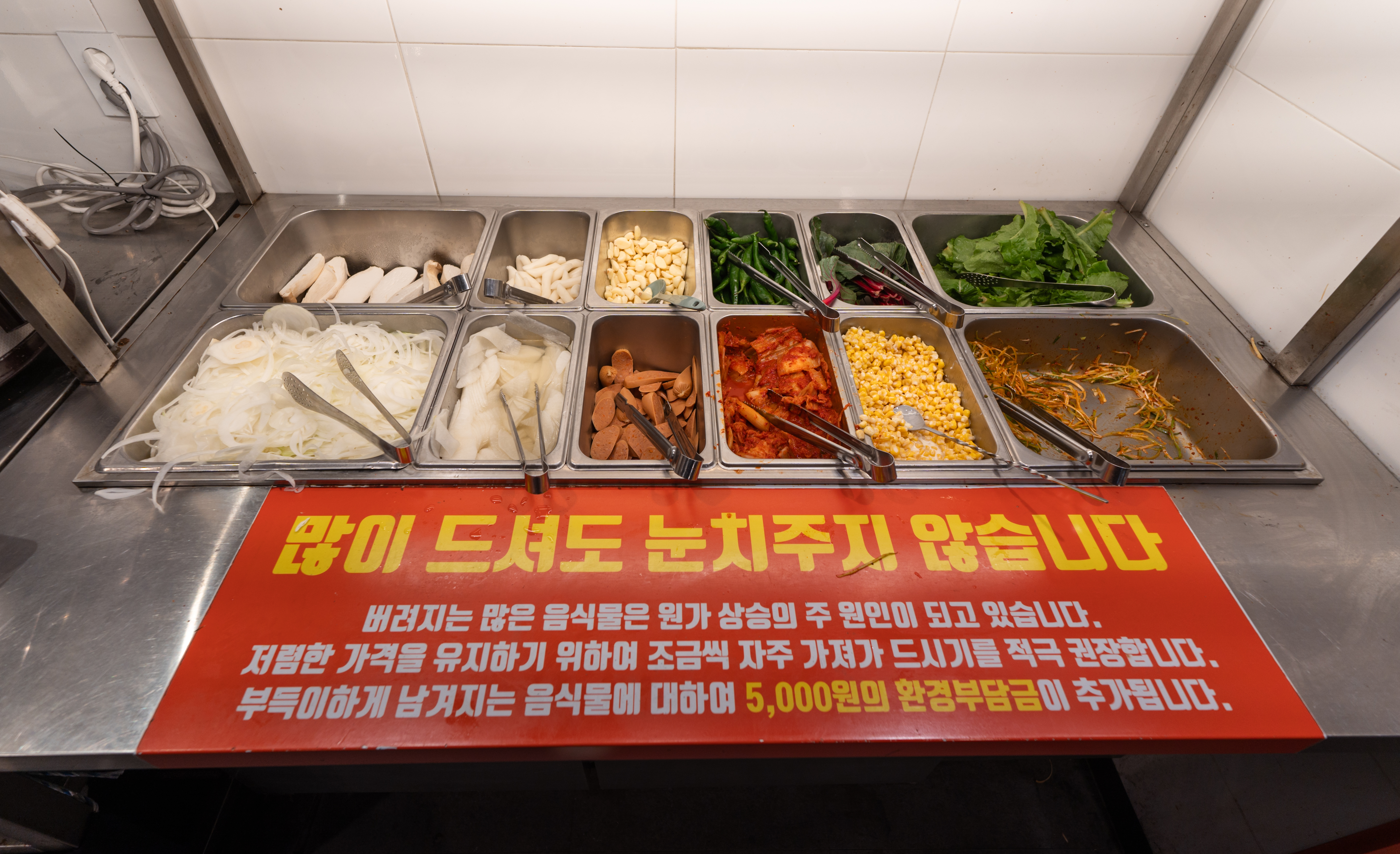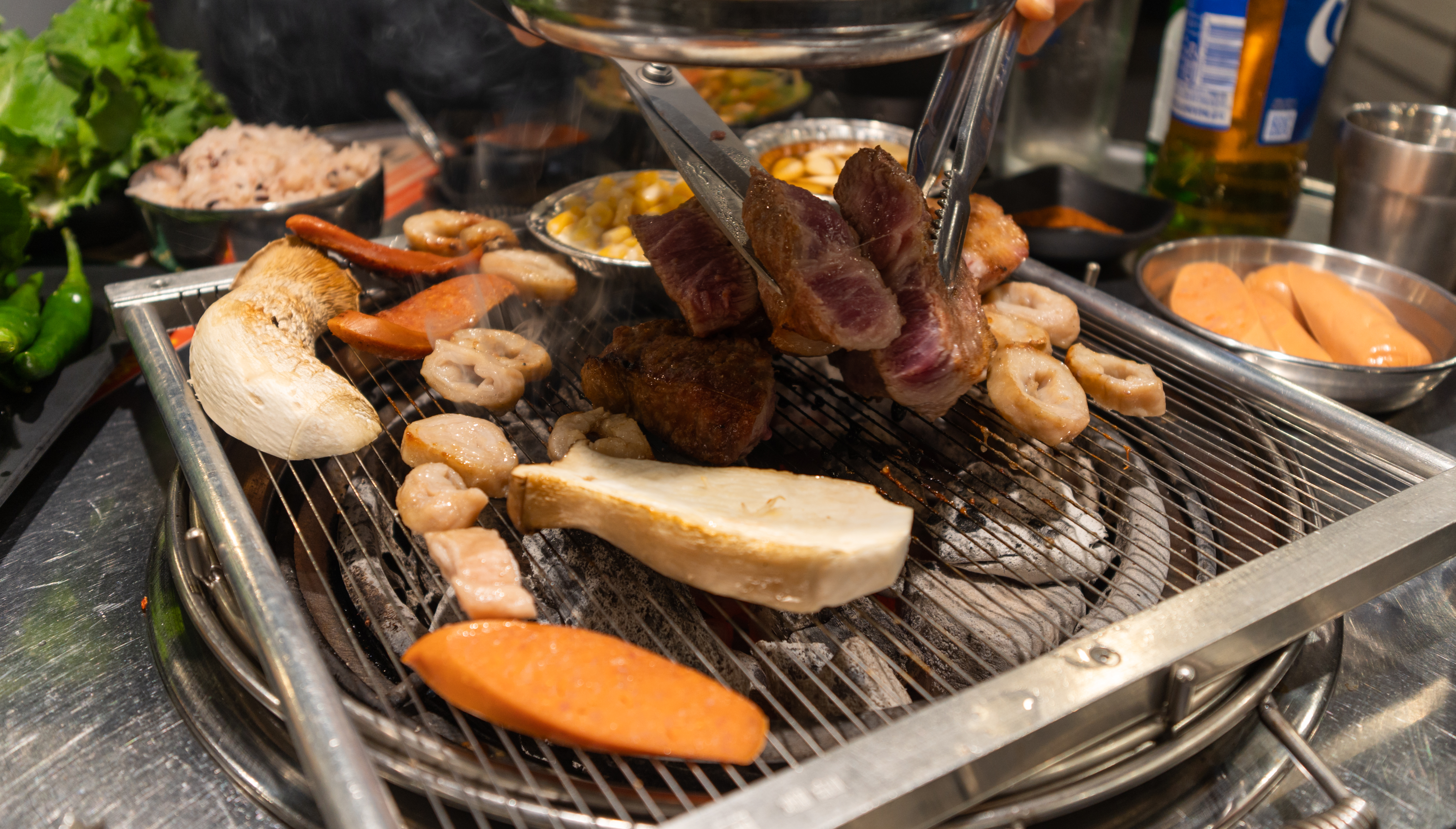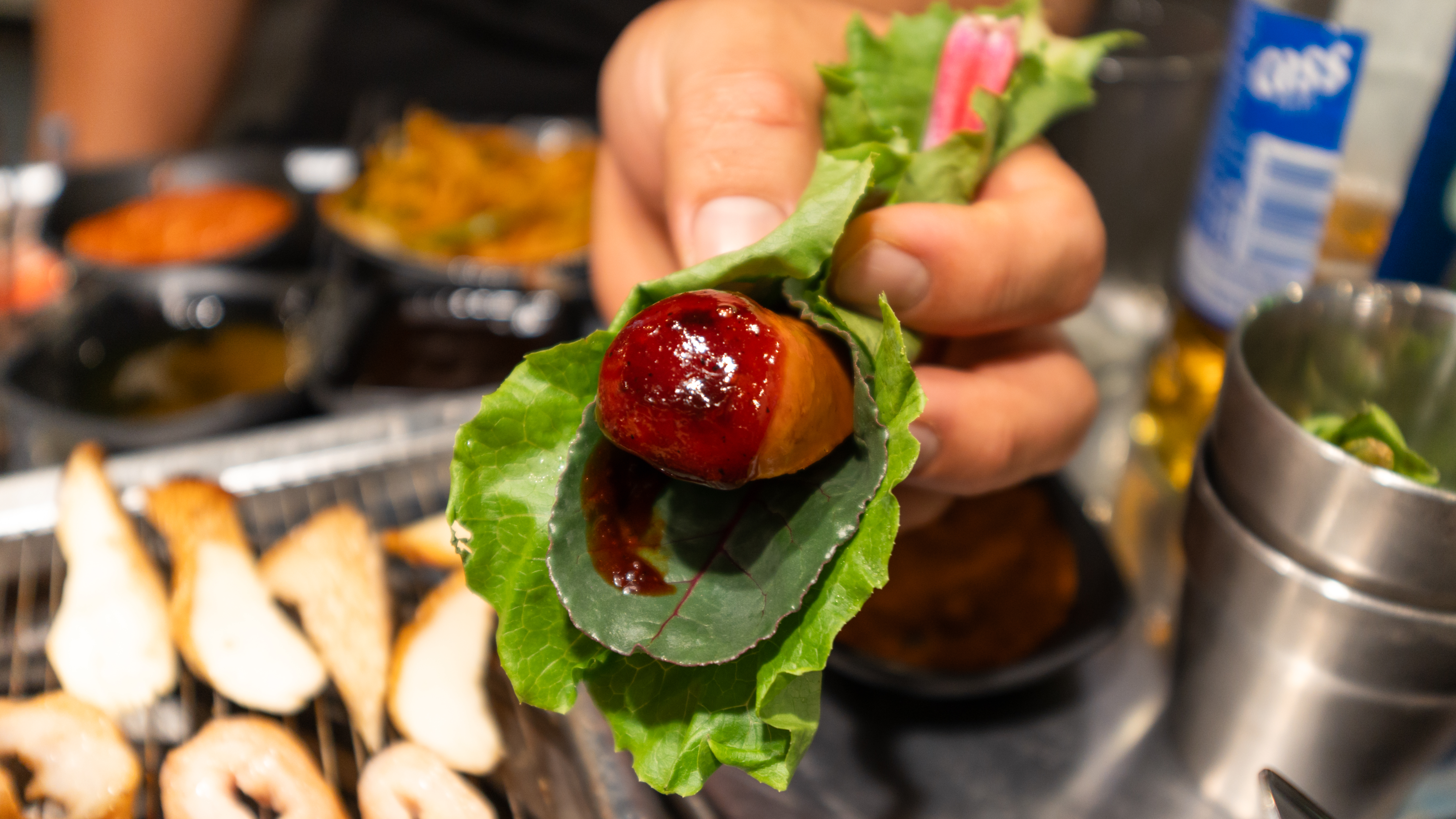 반찬은 버섯, 떡, 마늘, 고추, 근대, 상추, 양파채, 무생채, 소시지, 배추김치, 옥수수, 파채 등이 있었고, 소스류는 치미추리, 매콤불닭, 블랙바베큐, 스윗갈릭, 돈마호크, 양꼬치, 레몬페퍼, 몬트리올, 비어캔치킨, 하바네로, 달콤이, 쌈장, 콩가루, 소금 등이 있었습니다.