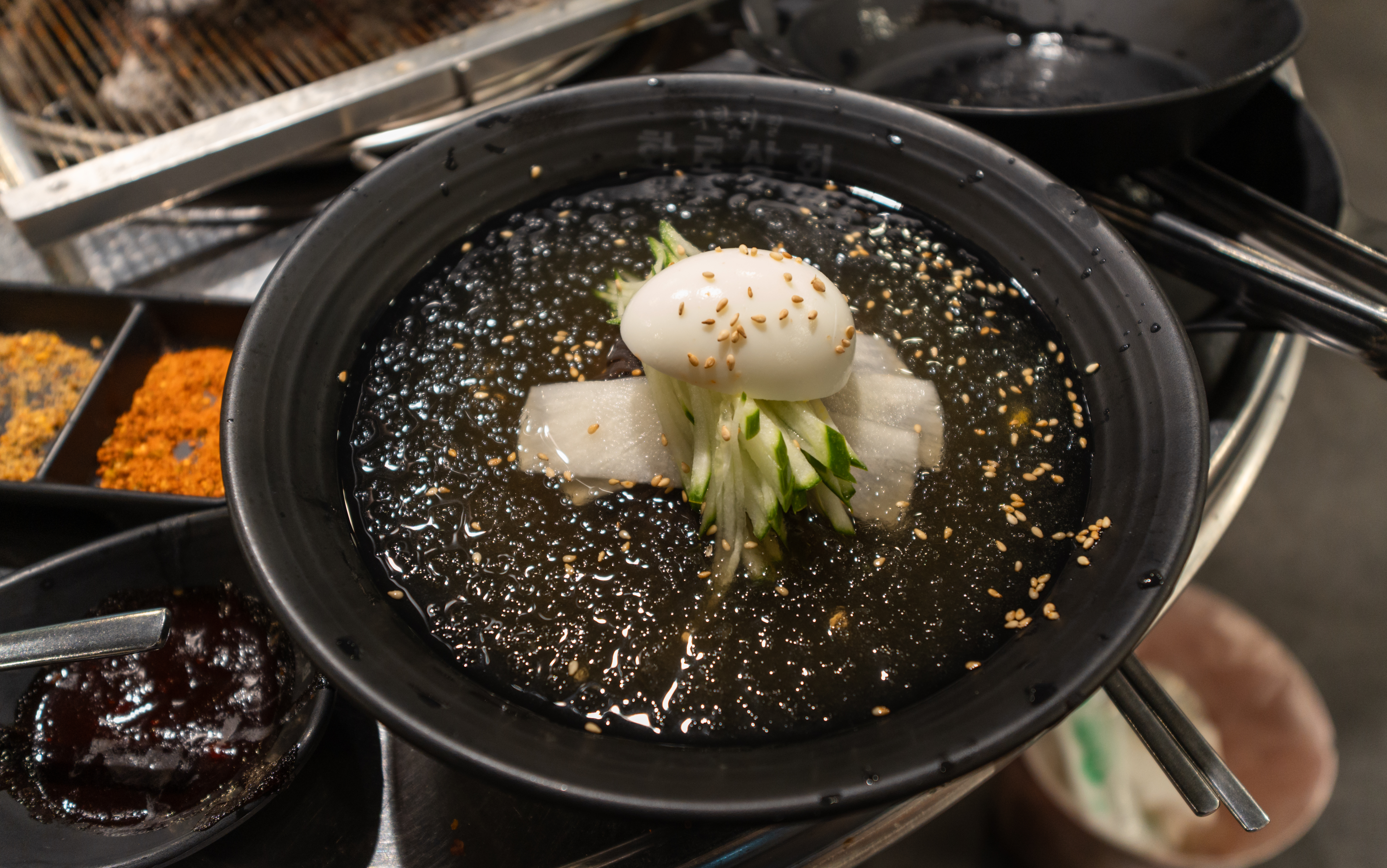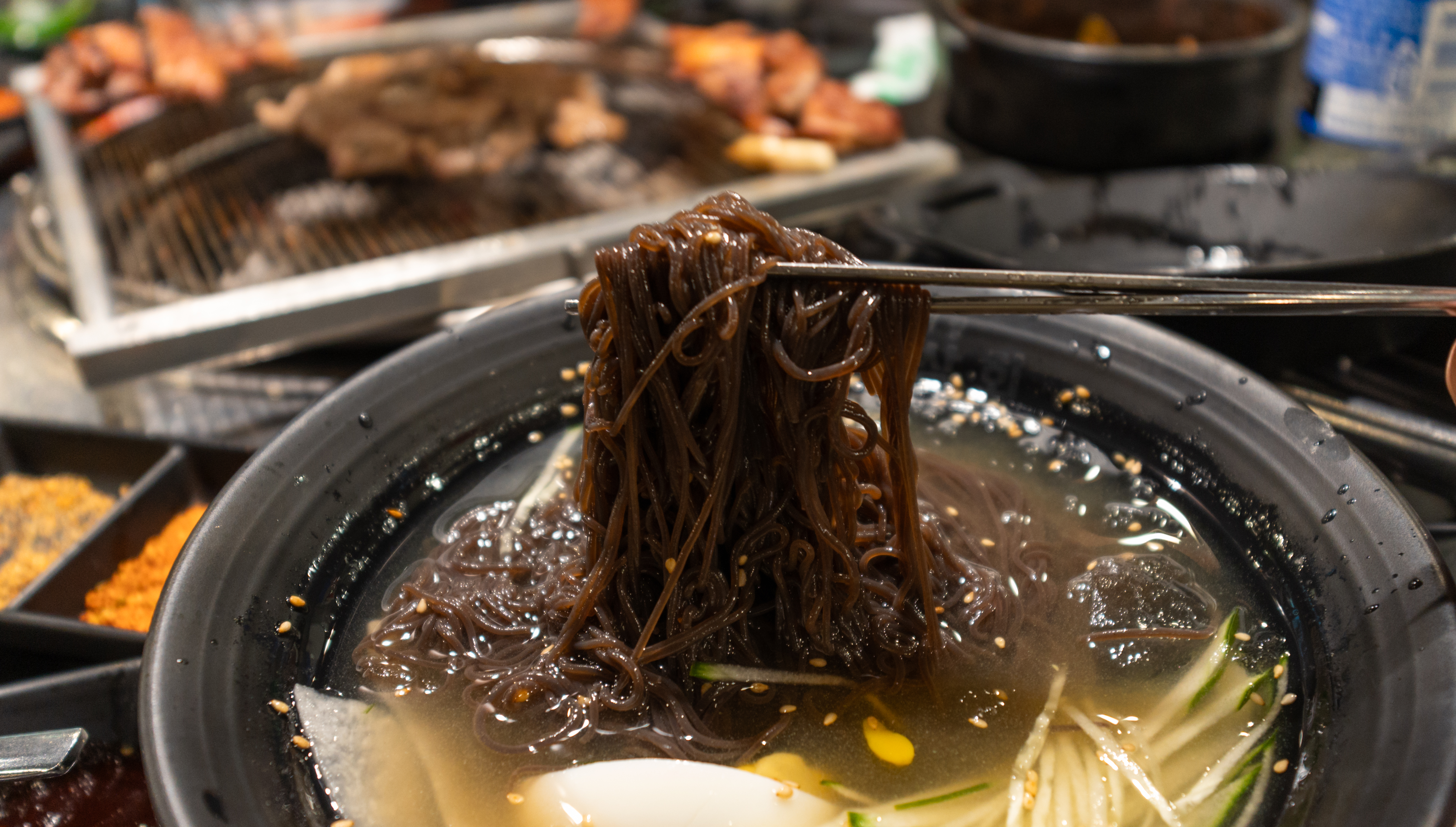 원래 즐겨먹던 눈꽃통목살은 기본은 해주었고, 이번에 새로 생긴 고기종류인 금쪽등갈비도 생각보다 맛있더라고요. 소스는 양꼬치나 몬트리올소스가 고기와 잘 어울렸다고 생각합니다. 이후에 주문한 물냉면과 양념목살로 마무리. 주문한 메뉴가 바로 나오지 않아서, 조금 오래 기다렸는데요.