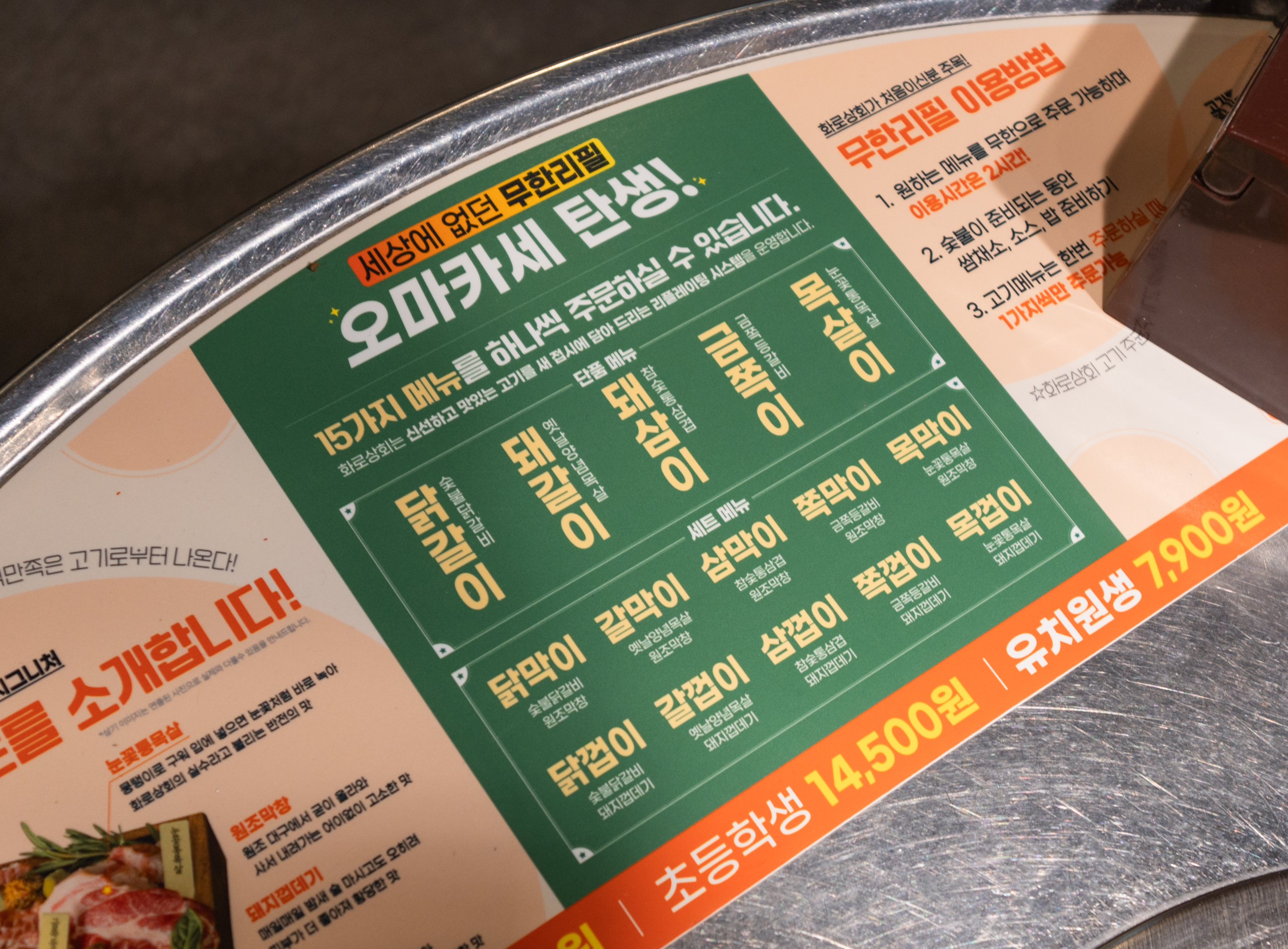 화로상회 태안점은 숯불닭갈비, 옛날양념목살, 참숯통삼겹, 금쪽등갈비, 눈꽃통목살, 원조막창, 돼지껍데기를 무한리필로 주문할 수 있었습니다. 가격은 기본 19,500원, 초등학생 14,500원, 유치원생 7,900원이었습니다.