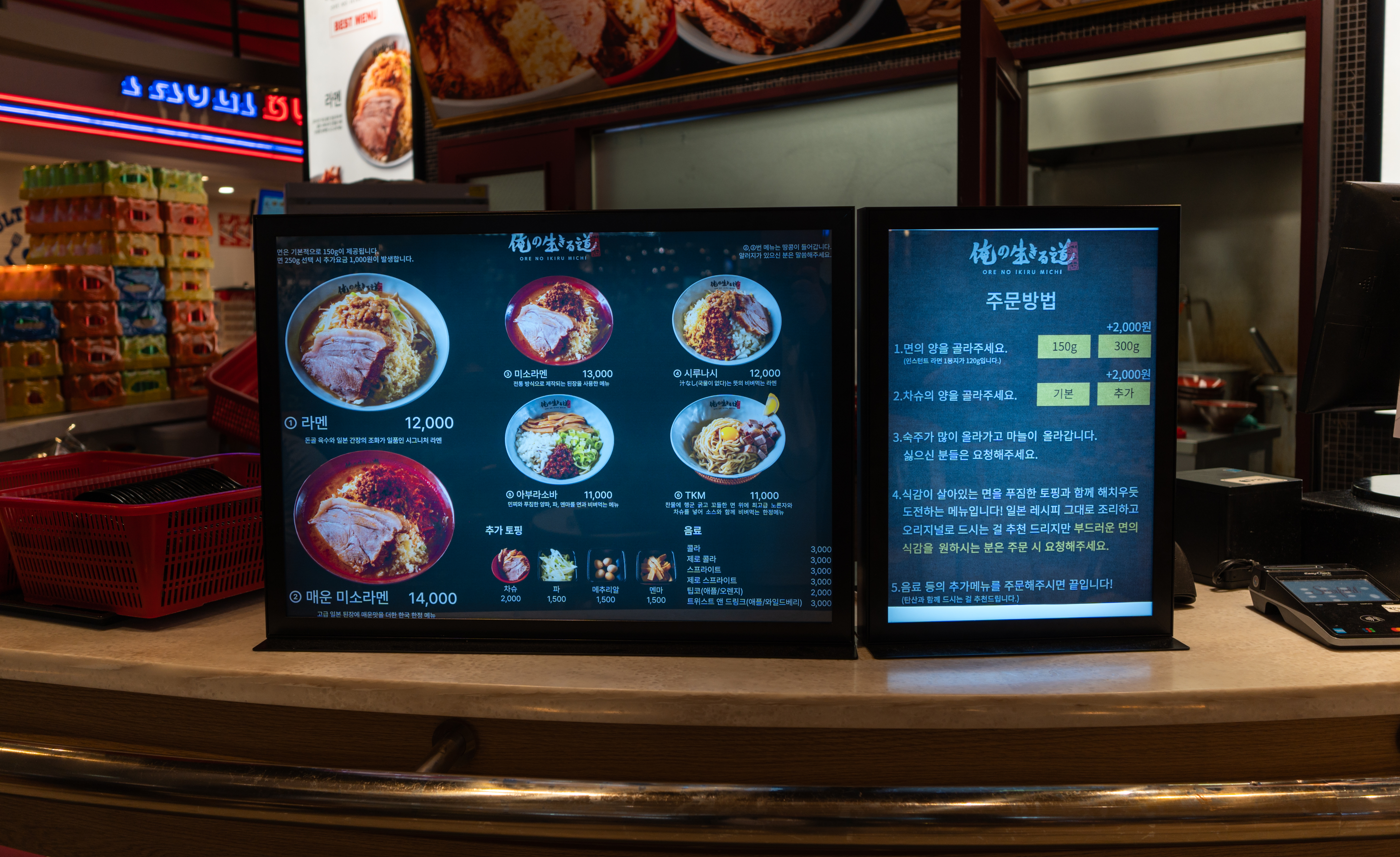 오레노이키루미치의 뜻은 '내가 살아가는 길'로 푸짐한 면과 야채, 균형 있는 진한 육수, 두툼한 고기와 세아부라, 마음대로 바꿀 수 있는 토핑이 특징인 폭력적인 라멘이라고 합니다. 토핑의 종류는 차슈, 파, 메추리알, 멘마가 있었습니다.