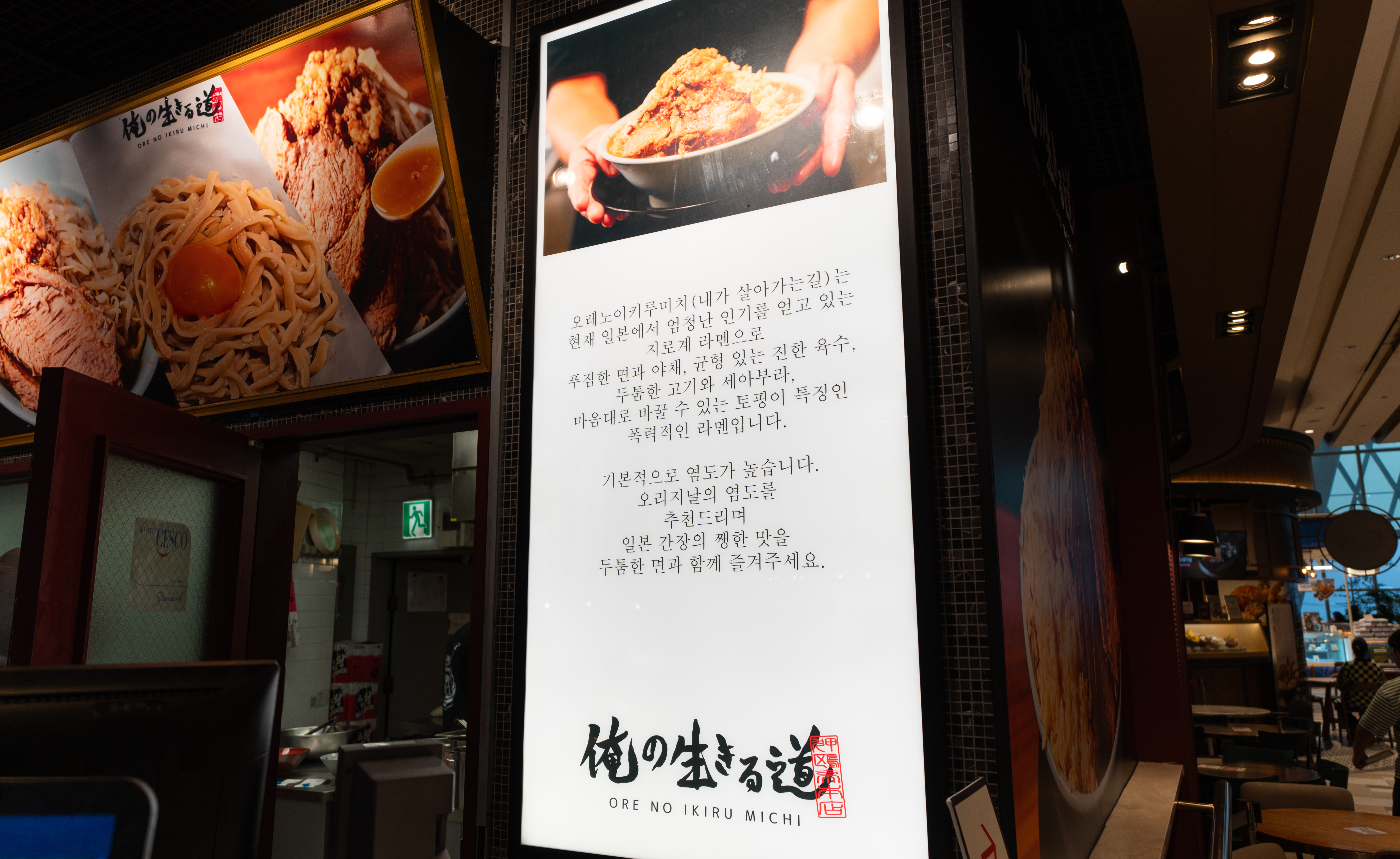 그렇게 발견한 곳은 스타필드 3층 푸드코트(잇토피아)에 위치한 '오레노이키루미치'. 오레노이키루미치는 압구정에 본점을 두고 있는 라멘집으로, 정통 일본식 지로계 라멘을 판매하는 맛집이었습니다.