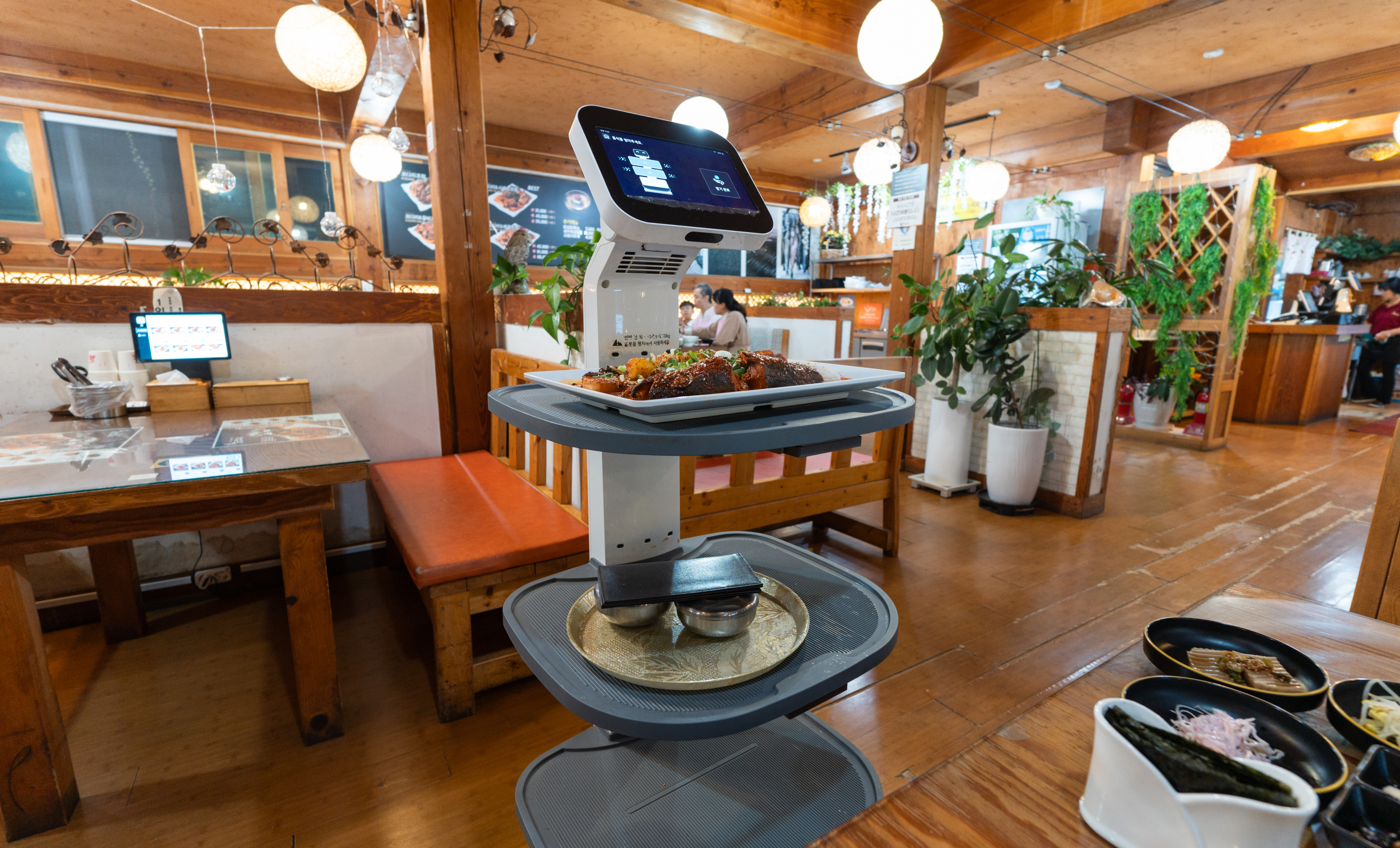 황금코다리의 메뉴는 코다리조림, 코다리&갈비조림, 코다리&시래기조림, 코다리&해물조림, 코다리냉면, 황코물냉면, 등심돈까스, 치즈돈까스, 새우튀김5개, 시래기추가가 있었습니다. 메뉴는 서빙로봇을 통해 자리로 가져다주고 있었습니다.