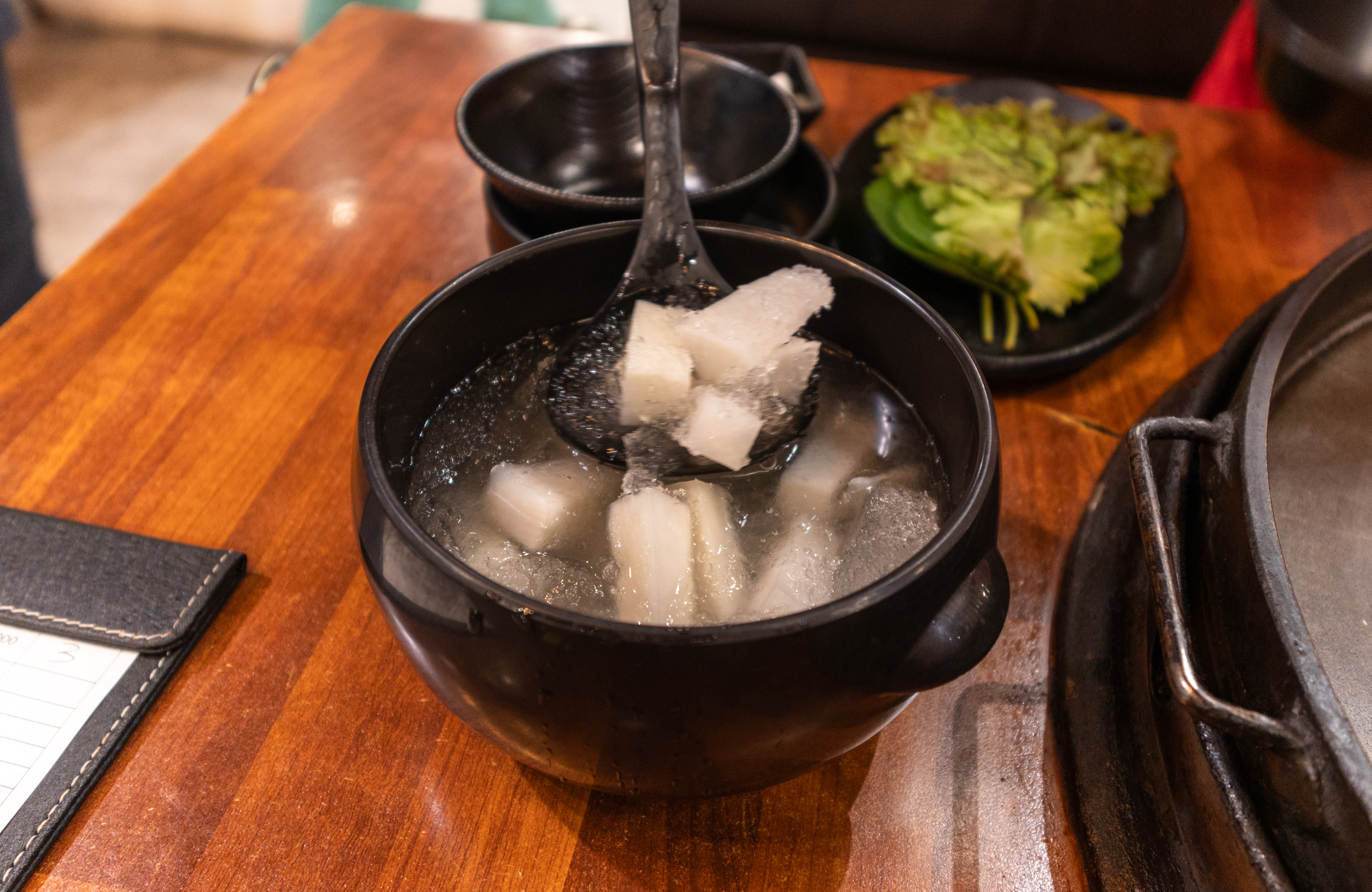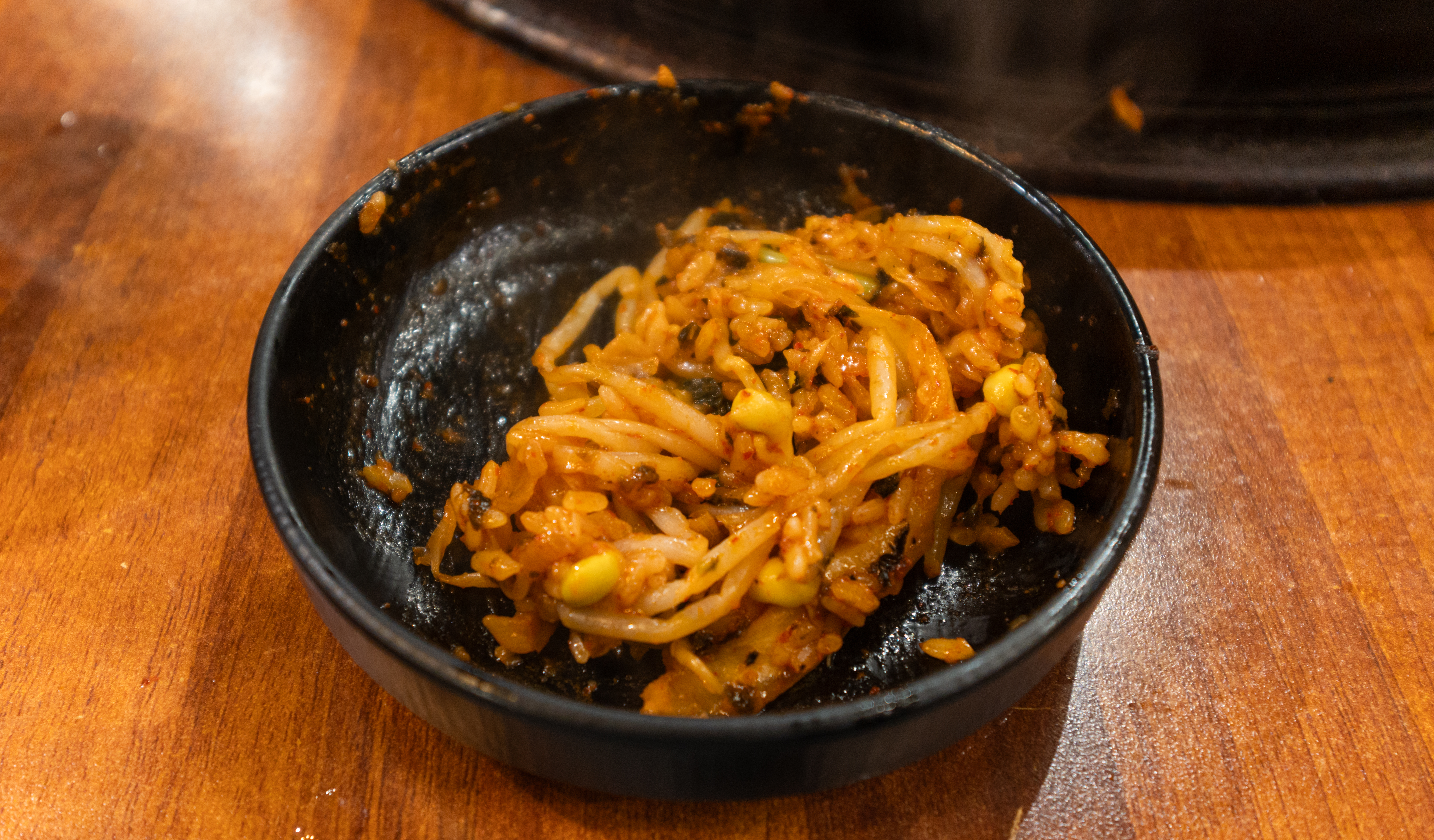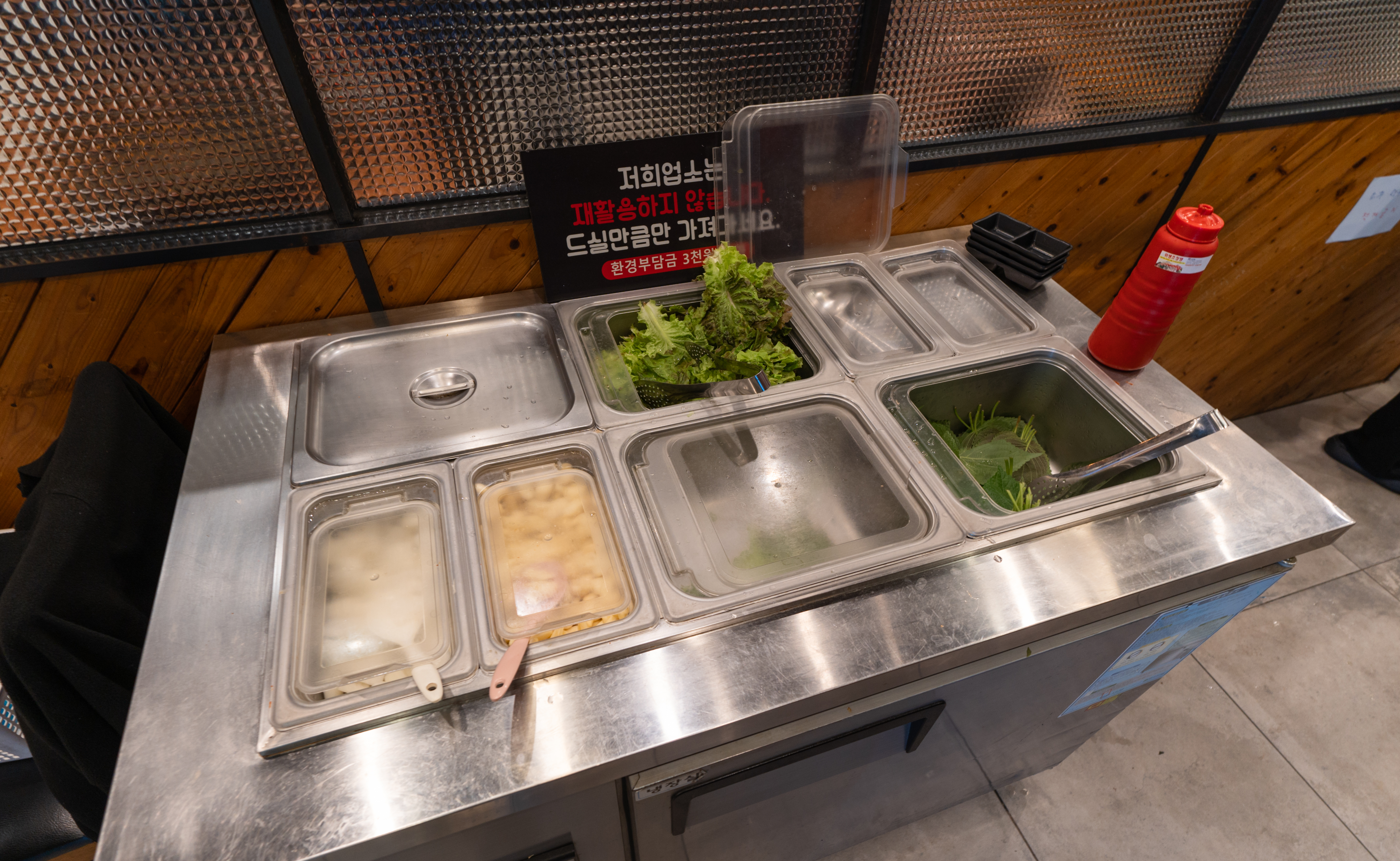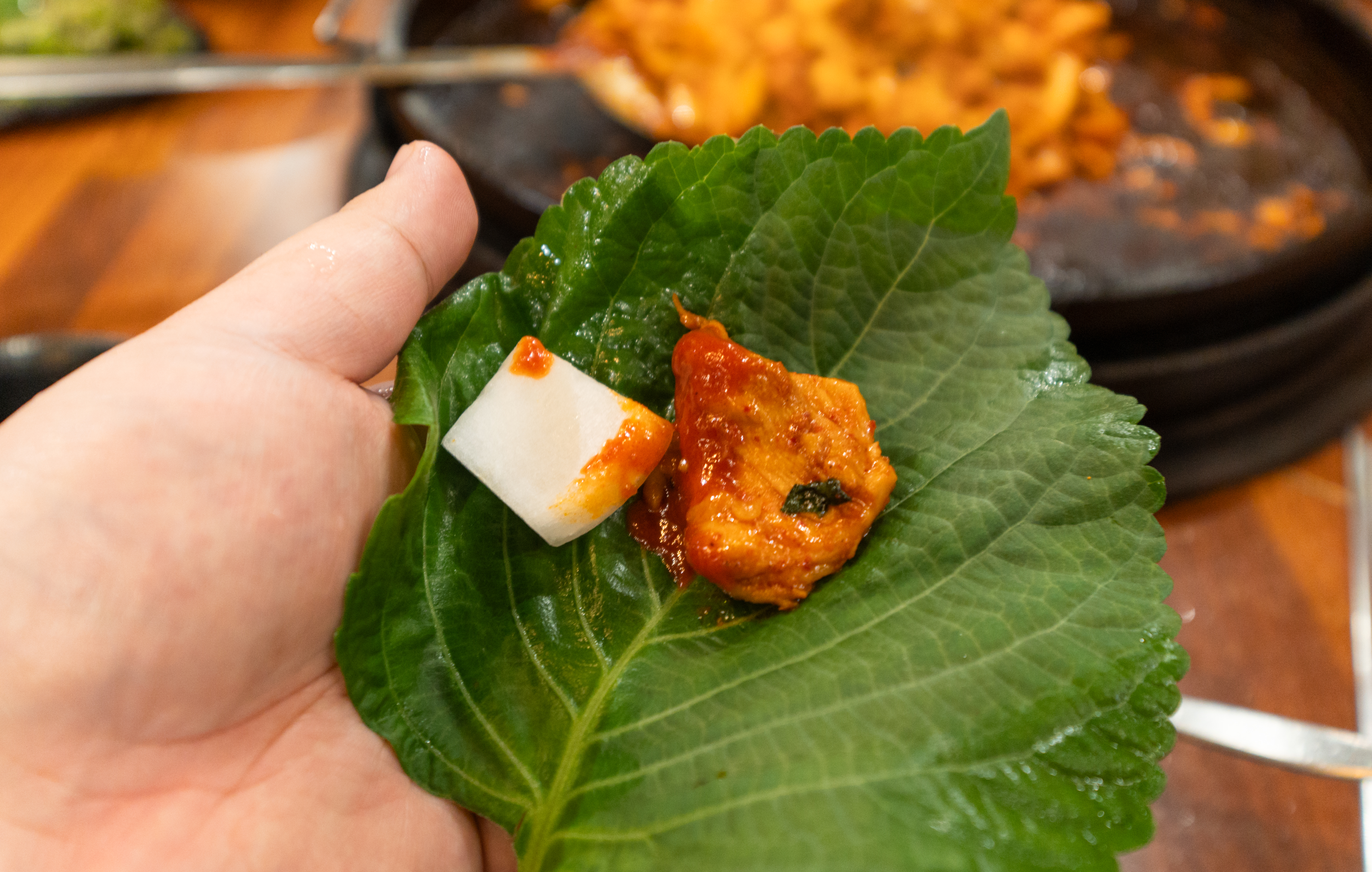 우성닭갈비의 반찬은 상추, 깻잎, 동치미, 마늘, 양파, 초고추장이 있었습니다. 닭갈비를 주문하면 철판에 직접 볶아주시는데요. 고기가 다 익으면 불을 줄이면서 먹어도 된다고 안내를 해주셔서, 그전까지는 닭갈비 볶는 과정에 그냥 기다리면 되었습니다.