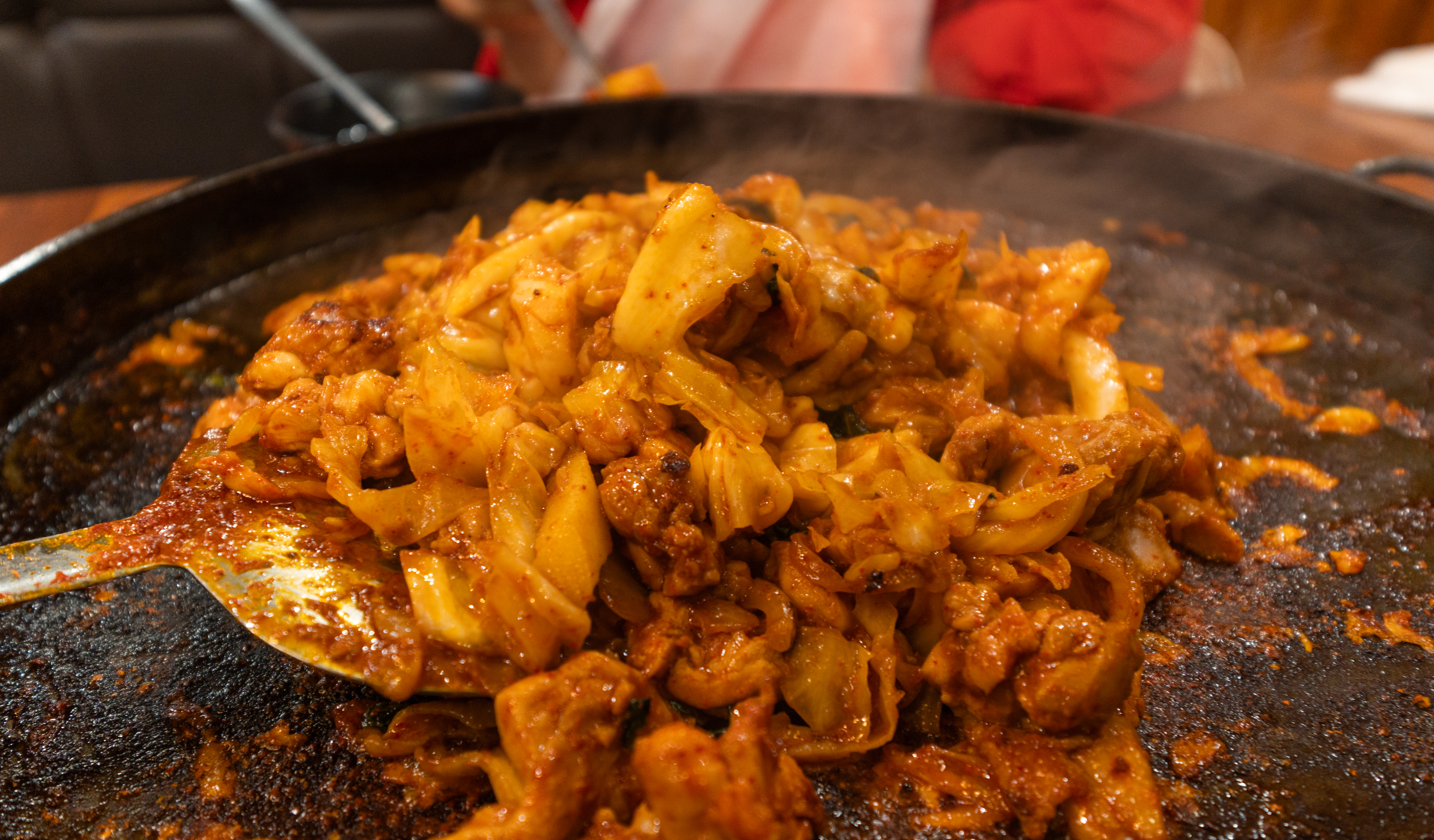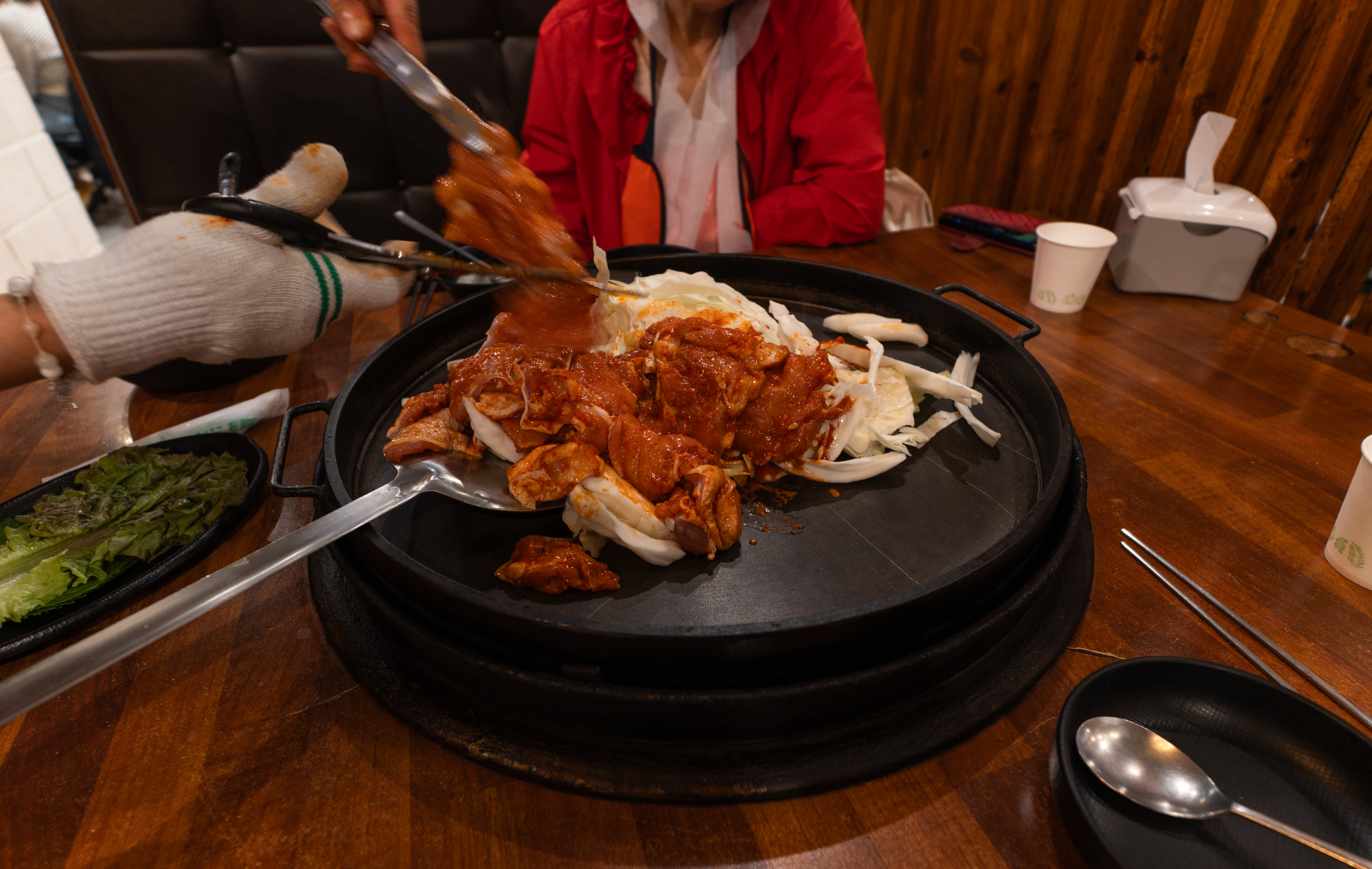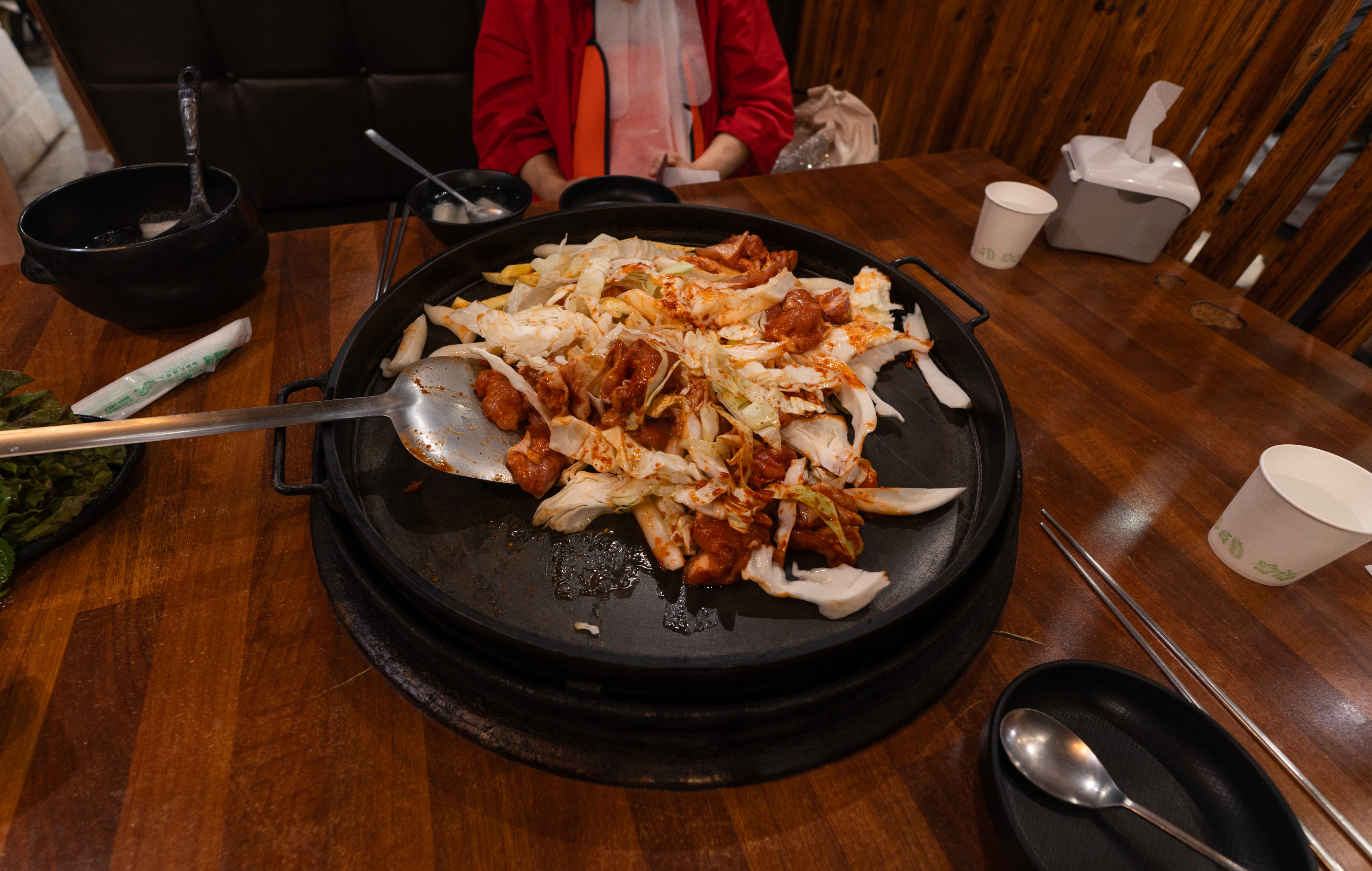 곧이어 닭갈비가 다 익었는지 직원분이 이제 드셔도 된다고 알려주었고, 떡과 고구마, 양배추부터 닭고기까지 순서대로 먹었습니다. 춘천의 닭갈비 가게들이 대부분 다 맛이 상향평준화 되어 어딜 가나 맛은 비슷한 느낌인데, 이곳의 닭갈비는 부드럽고 양념도 진해서 맛있었습니다.