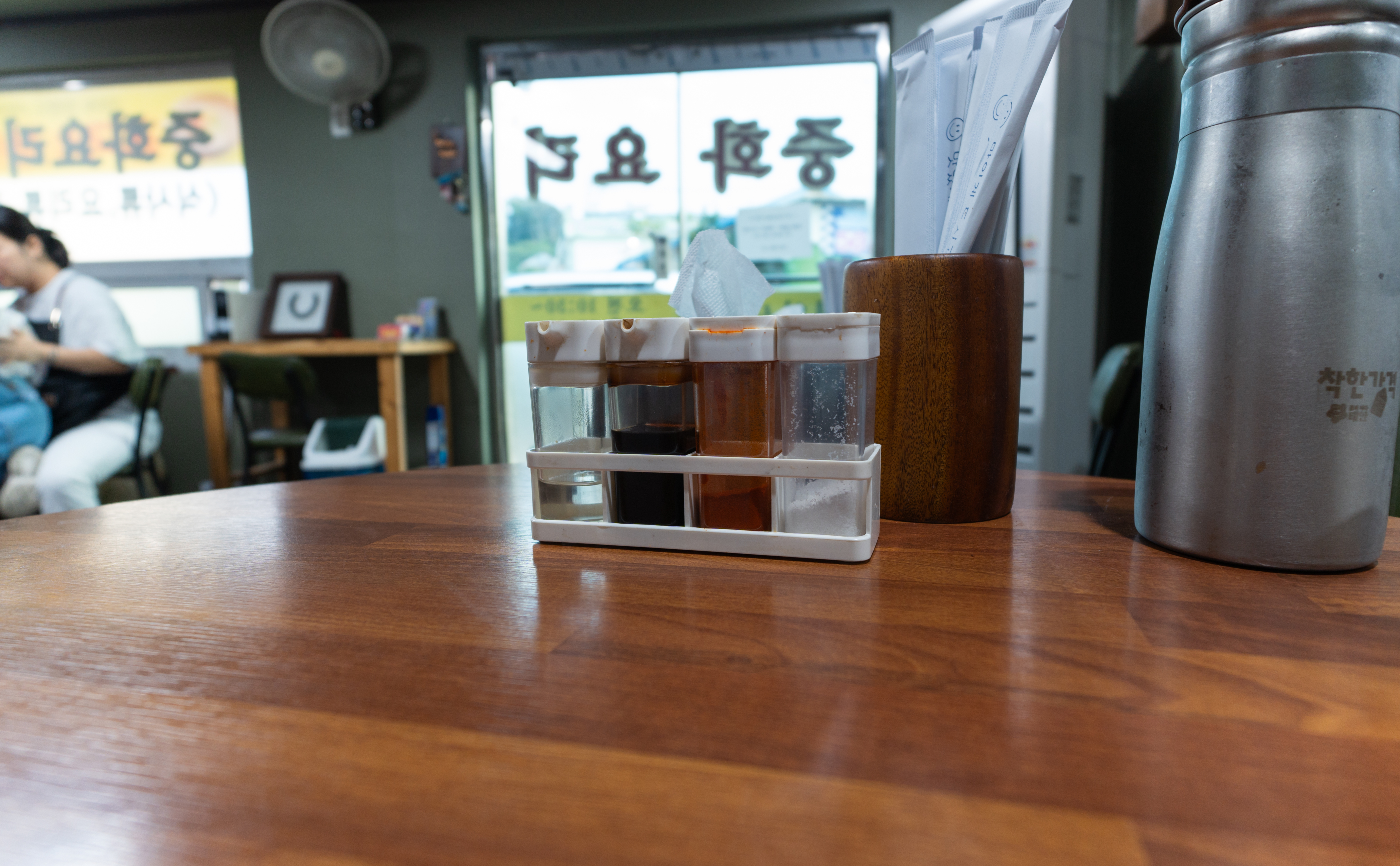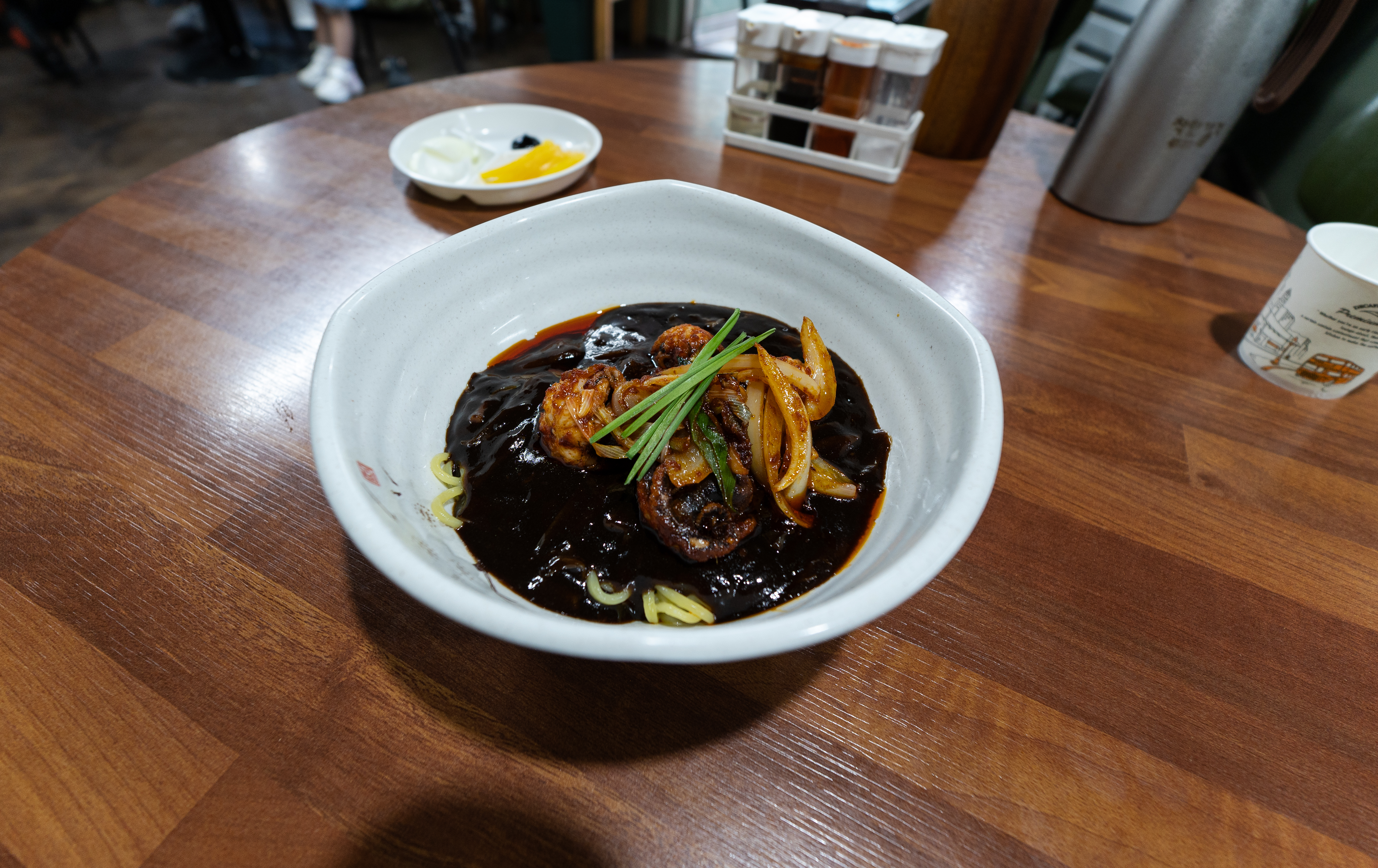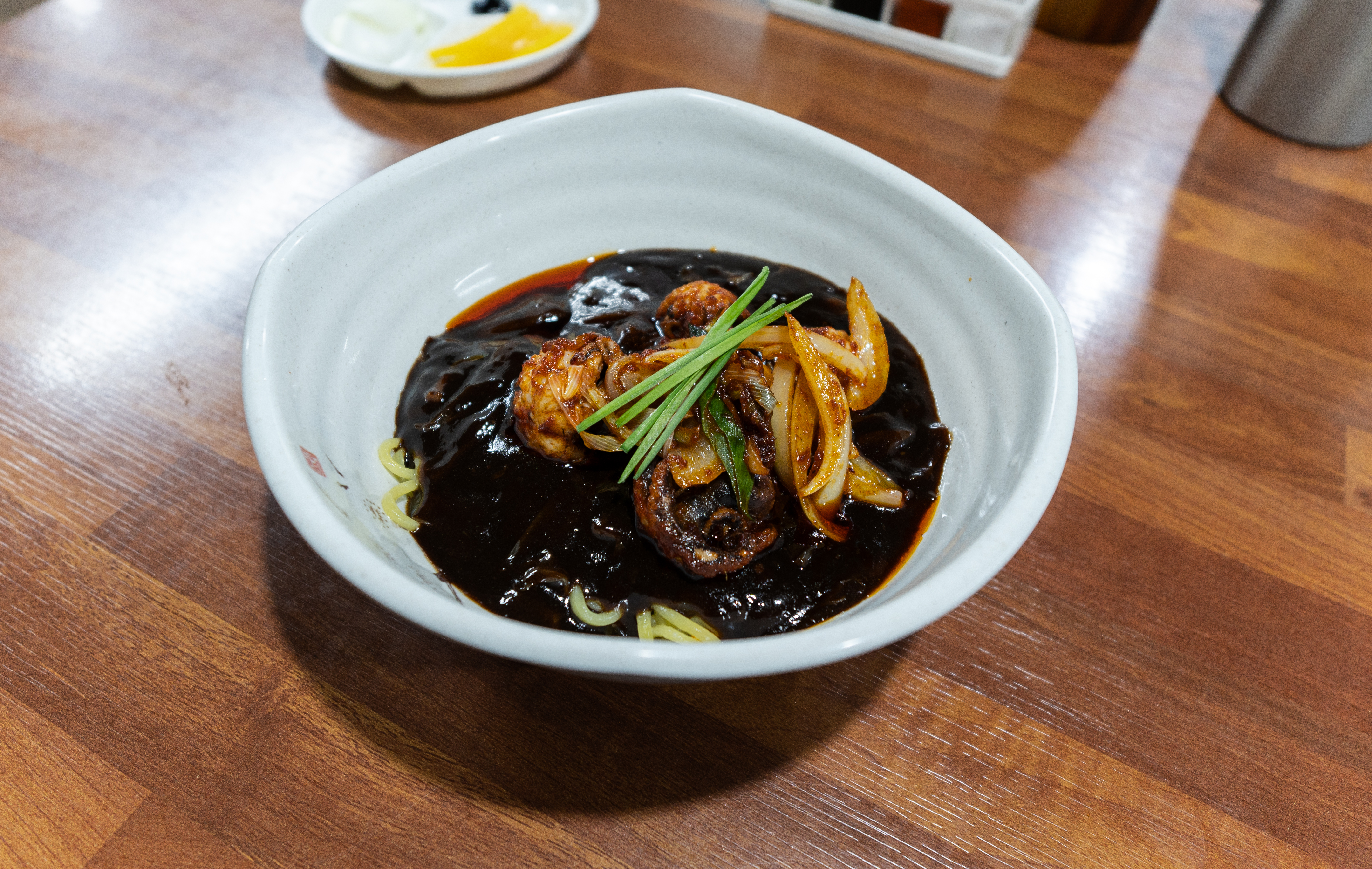 중화루의 쭈꾸미짜장면은 위와 같이 나왔습니다. 자리에는 추가 양념으로 식초, 간장, 고춧가루, 소금(?)이 있었습니다. 가장 궁금했던 쭈꾸미짜장면의 모습을 조금 더 자세히 살펴보겠습니다.
