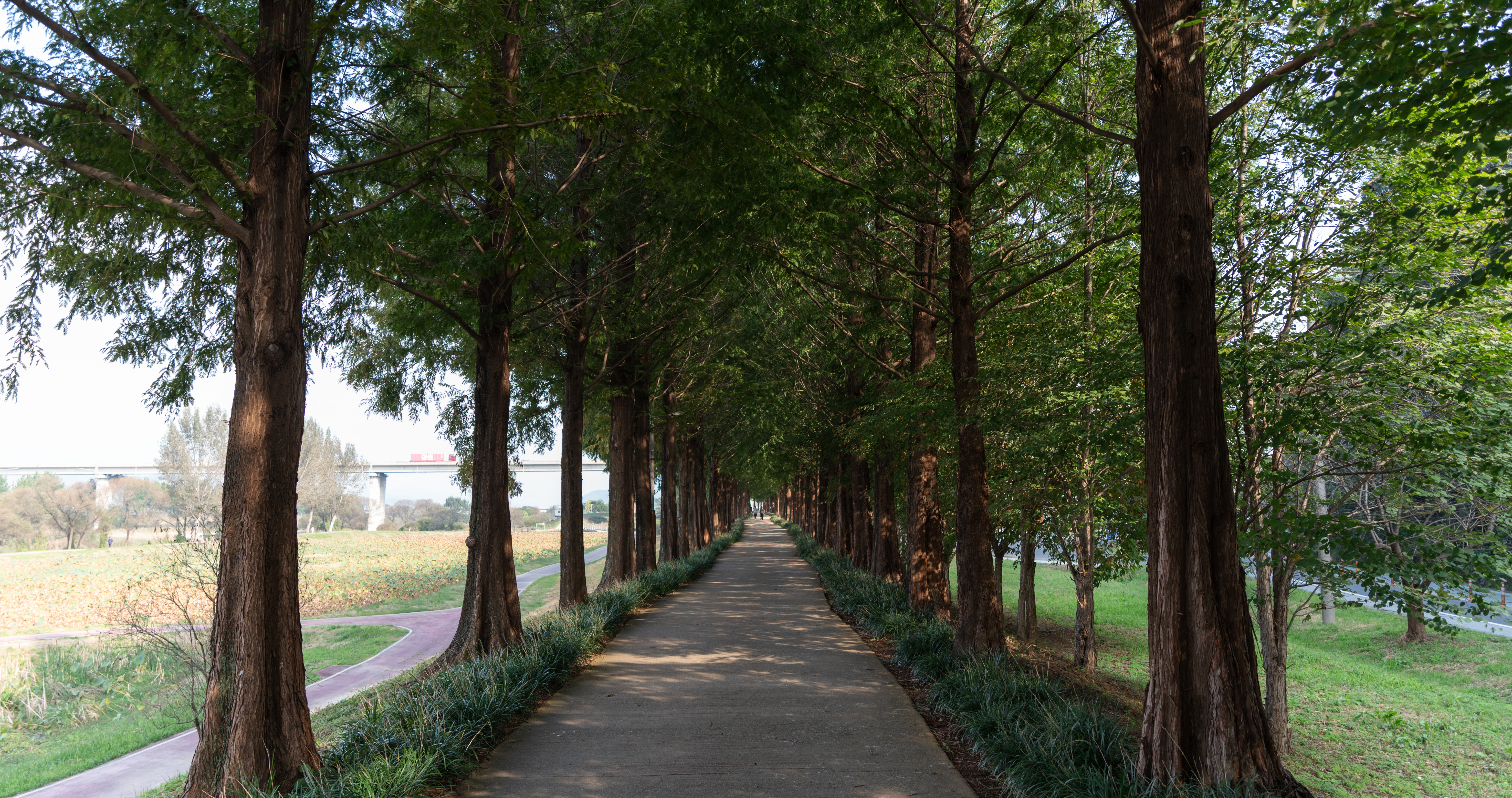 공주 정안천생태공원 내에 산책로가 몇몇 있었지만, 아무래도 메타세콰이어길이 가장 인기가 있는 것 같습니다. 이쪽으로 러닝 하시는 분들도 있고 사진을 촬영하시는 분들도 많이 계셨습니다. 물론, 나뭇잎 색이 붉게 물들어서 가을의 분위기를 느끼고 싶었으나, 아직 따뜻한 날씨 탓인지 푸르른 나뭇잎이 가을을 못 나타내주는 것에 아쉬움이 있었습니다.