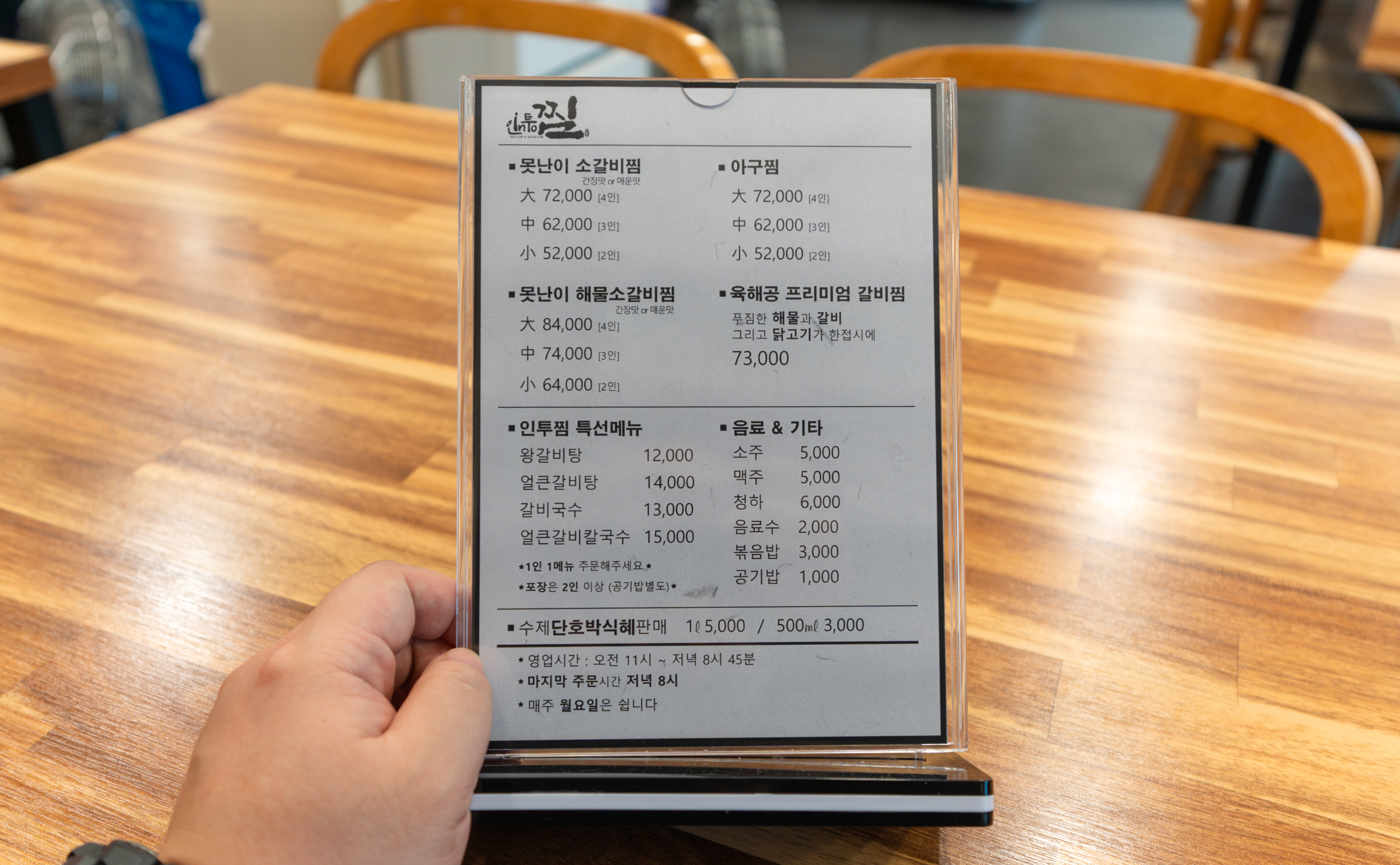 인천 인투찜의 메뉴는 못난이 소갈비찜, 아구찜, 못난이 해물 소갈비찜. 육해공 프리미엄 갈비찜, 왕갈비탕, 얼큰갈비탕, 갈비국수, 얼큰갈비국수가 있었습니다. 저는 이곳의 갈비국수를 주문해서 먹었습니다.