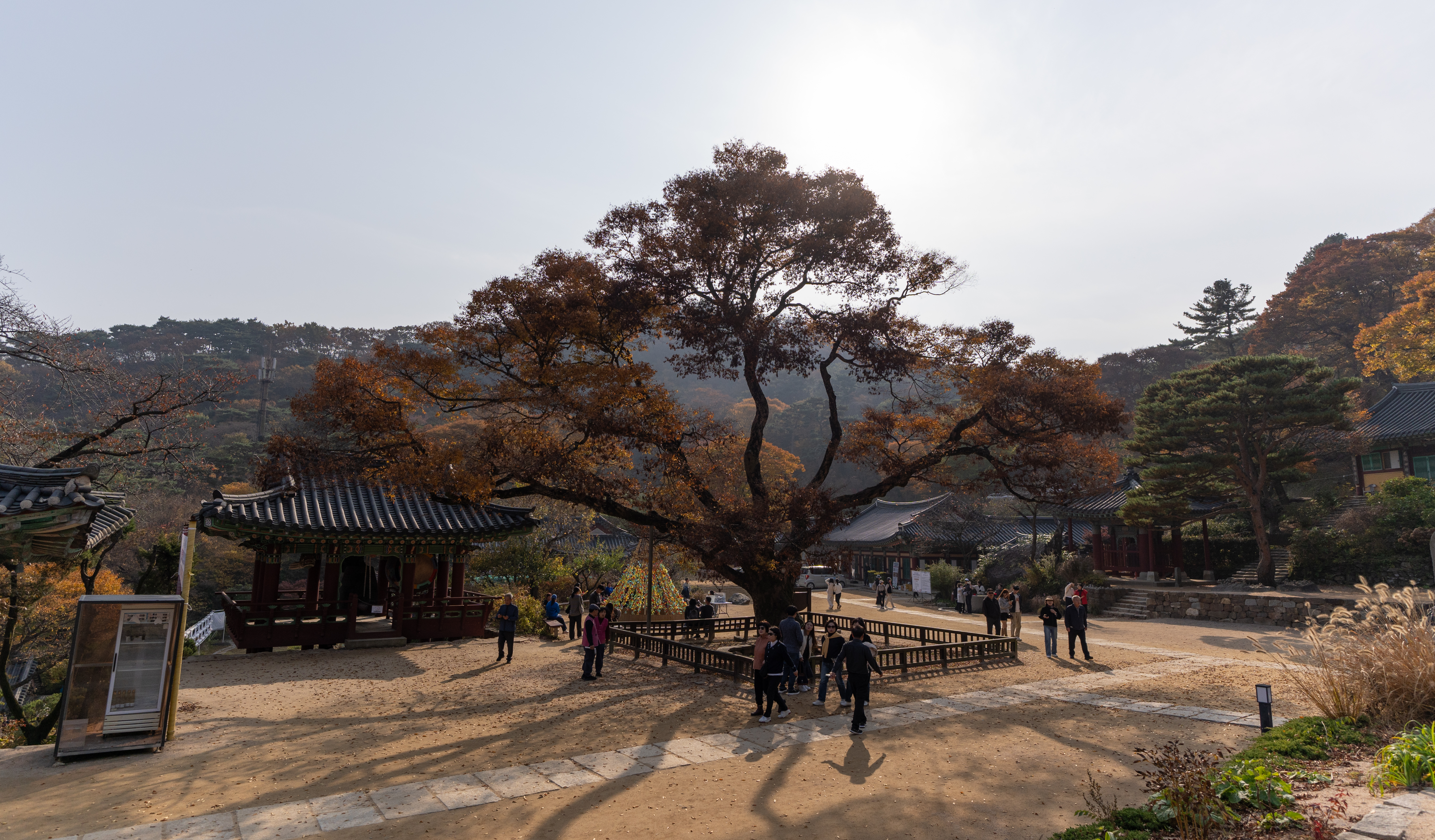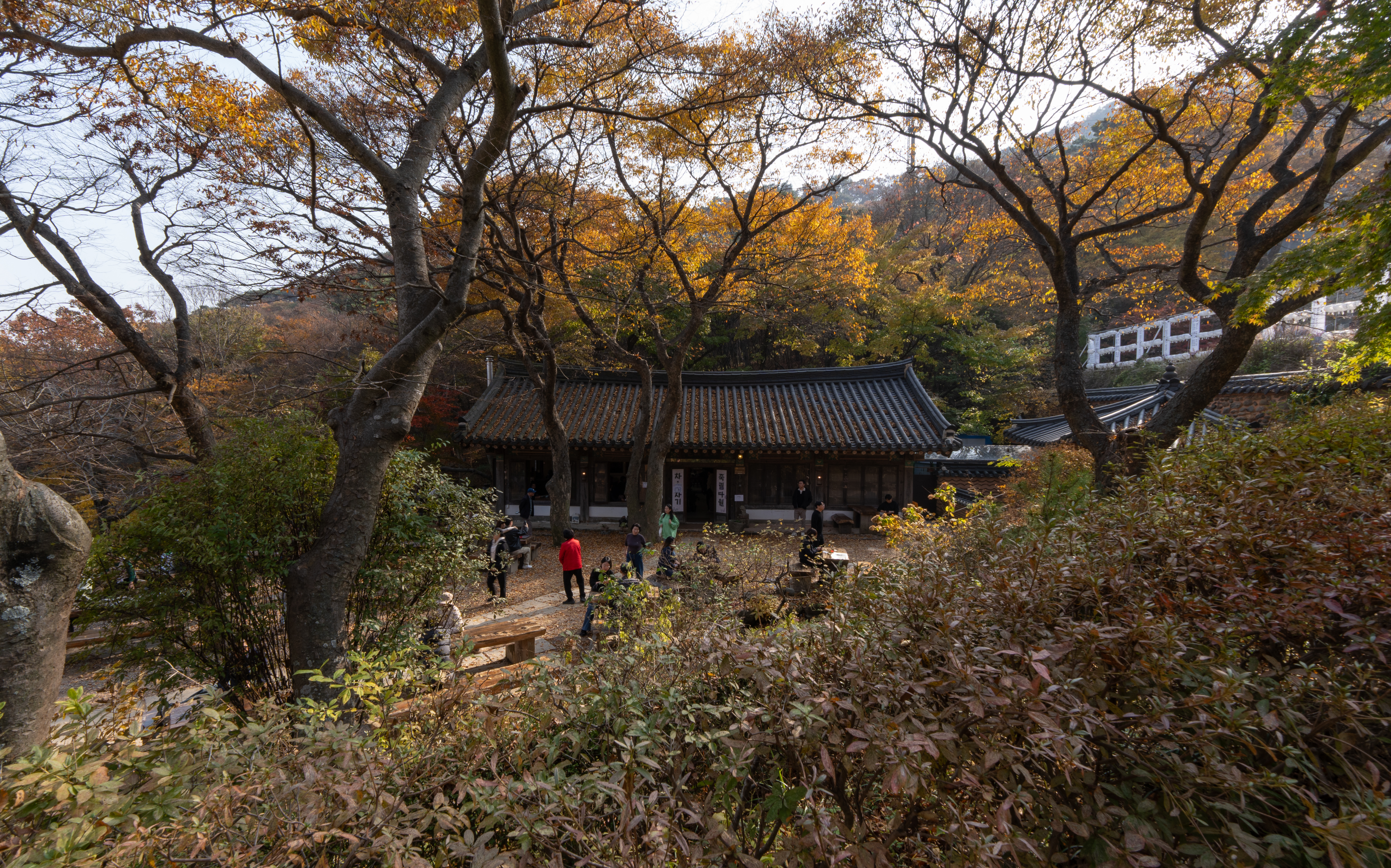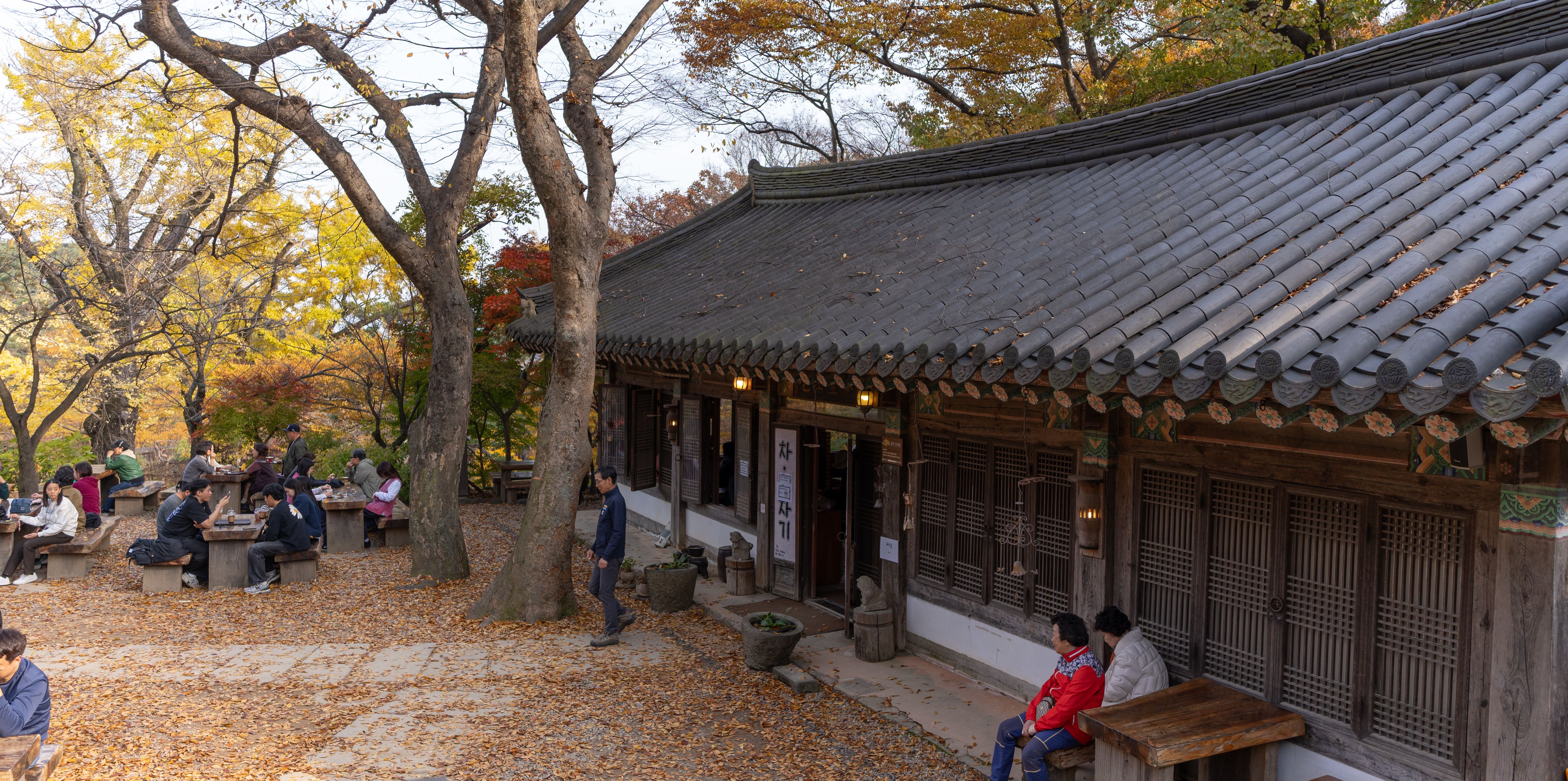 전등사에 올라가면 또 유명한 카페가 있는데요, 죽림다원이라고 전통 차와 음료 등을 판매하고 있습니다. 확실히 단풍이 지고 낙엽이 떨어지니까 분위기가 너무 멋진 것 같더라고요. 또 앉아서 쉴 수 있는 공간이 있다 보니, 전등사를 방문하는 관광객들 대부분이 이곳을 찾아서 휴식을 취하는 것 같았습니다.