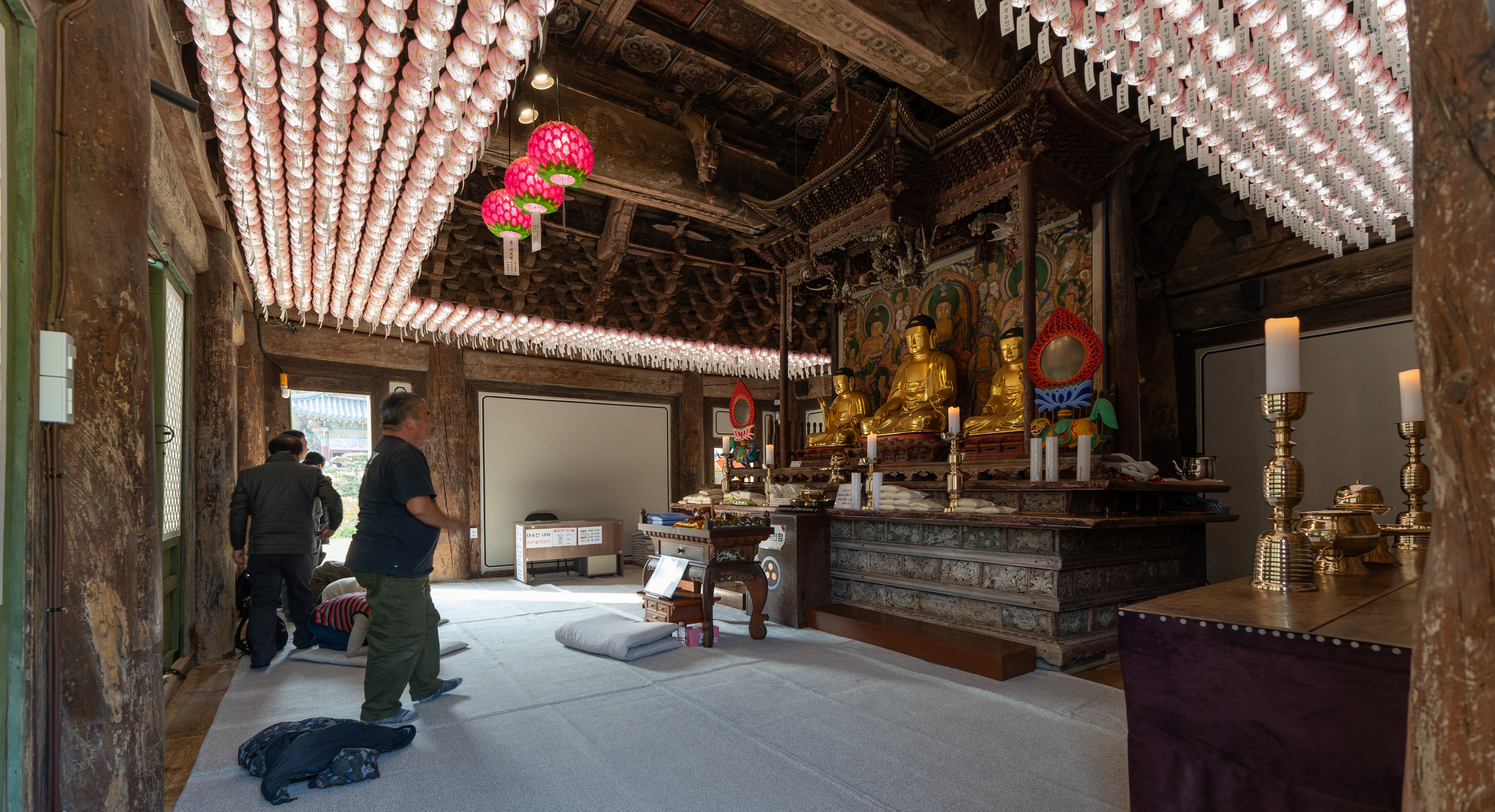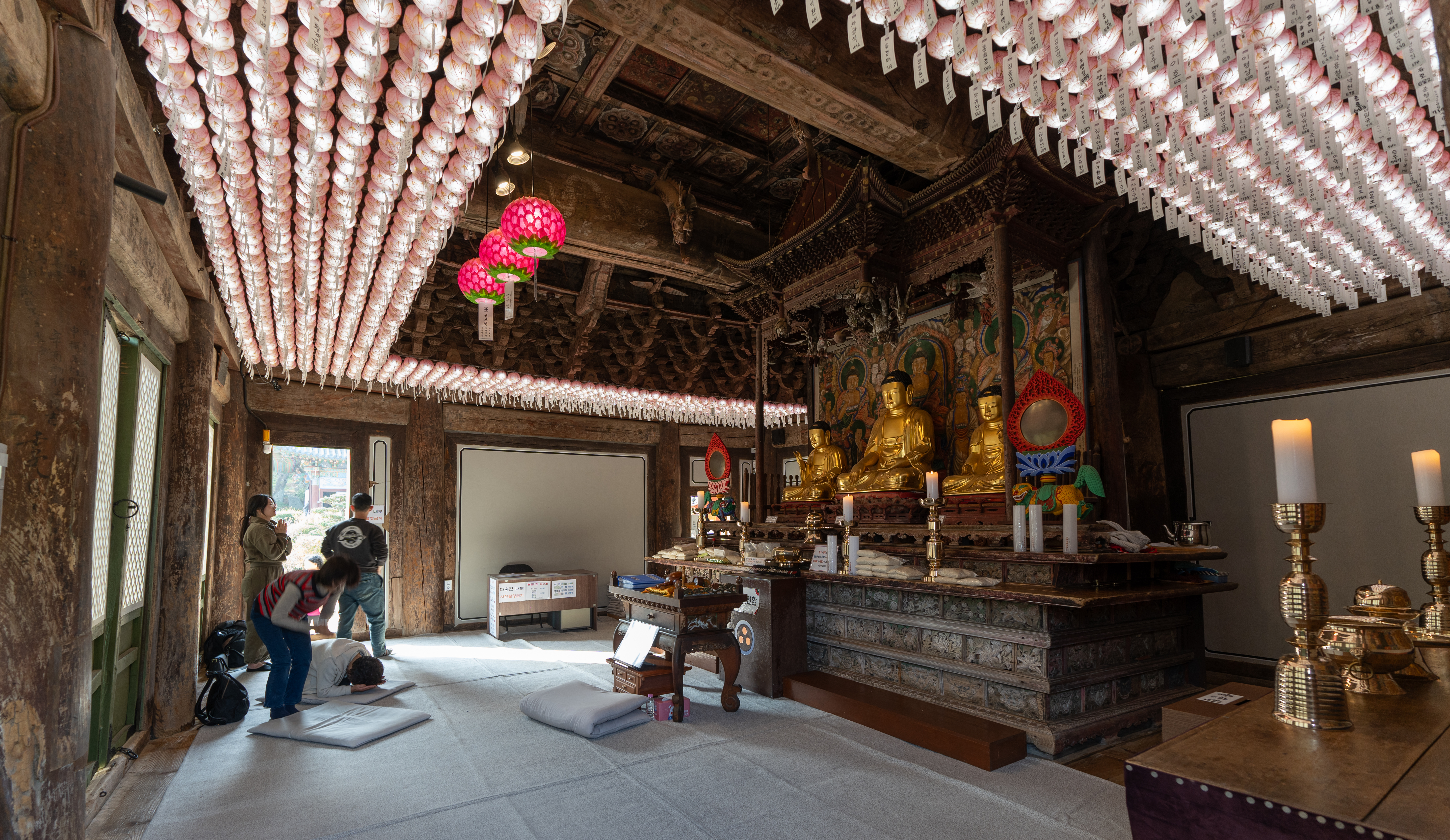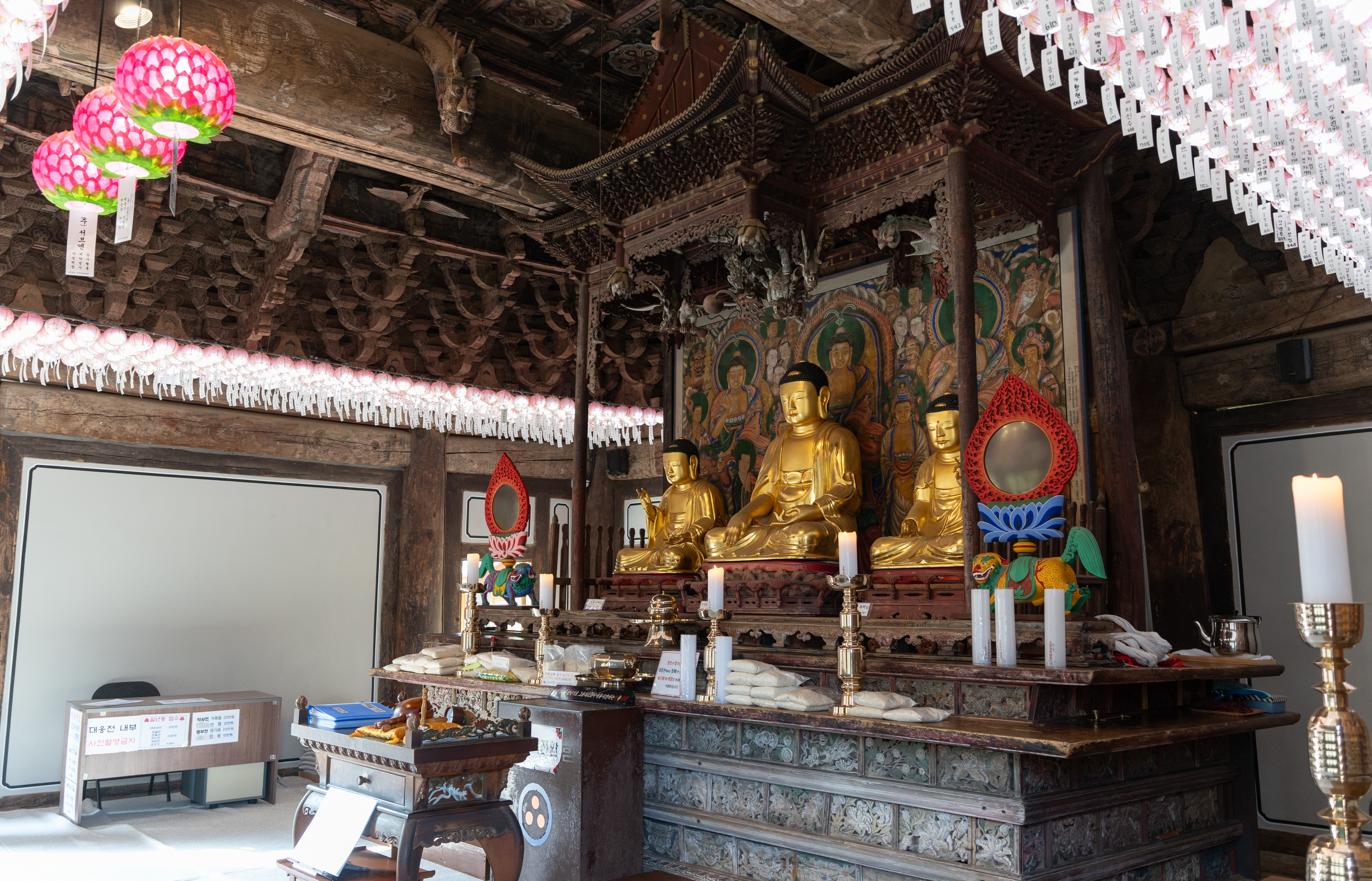 전등사 내부에 가장 중요한 이곳 천년이 넘은 대웅보전. 크기는 요즘 현대적인 사찰들에 비해 작지만 곳곳에 오랜 세월을 그대로 간직한 모습을 보여주었습니다. 내부에도 나무의 결을 보면 오래되어 낡은 모습이었습니다. 불교에 대해 잘은 모르지만, 일본이나 대만 등 오래된 사찰을 가보면 불상들의 모습은 살짝씩 다를지라도 제단의 모습은 이곳과 비슷한 느낌들이 있더라고요.