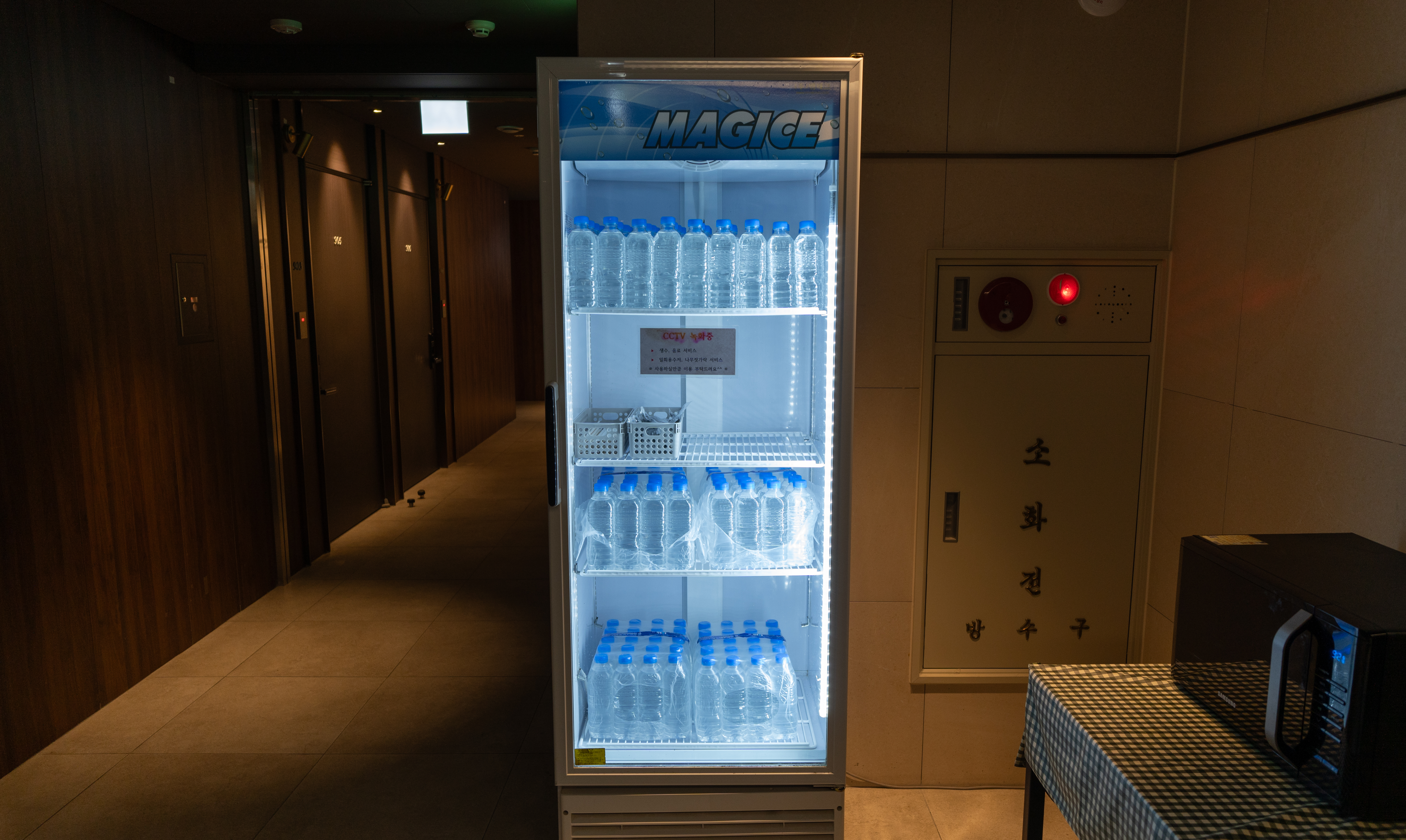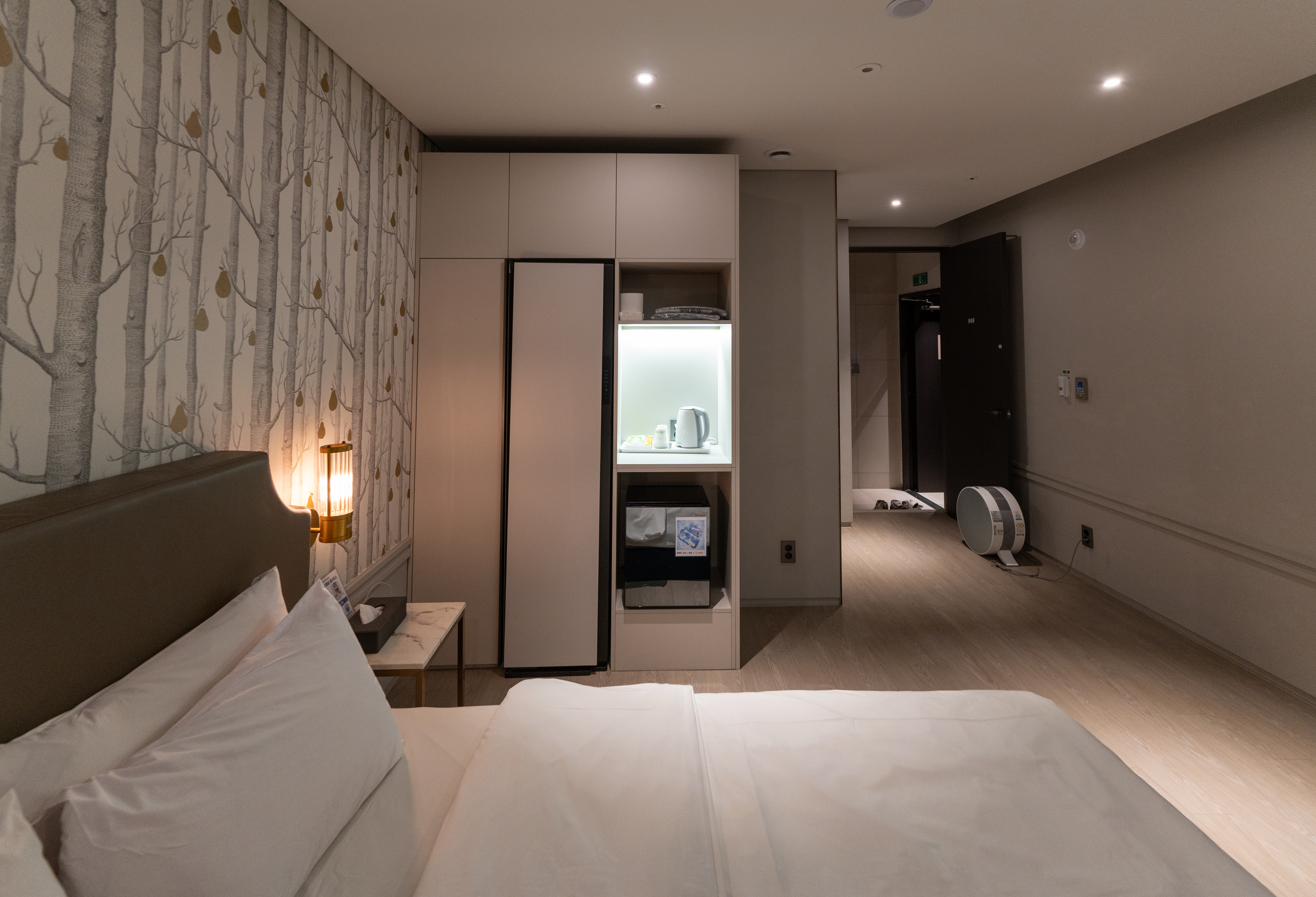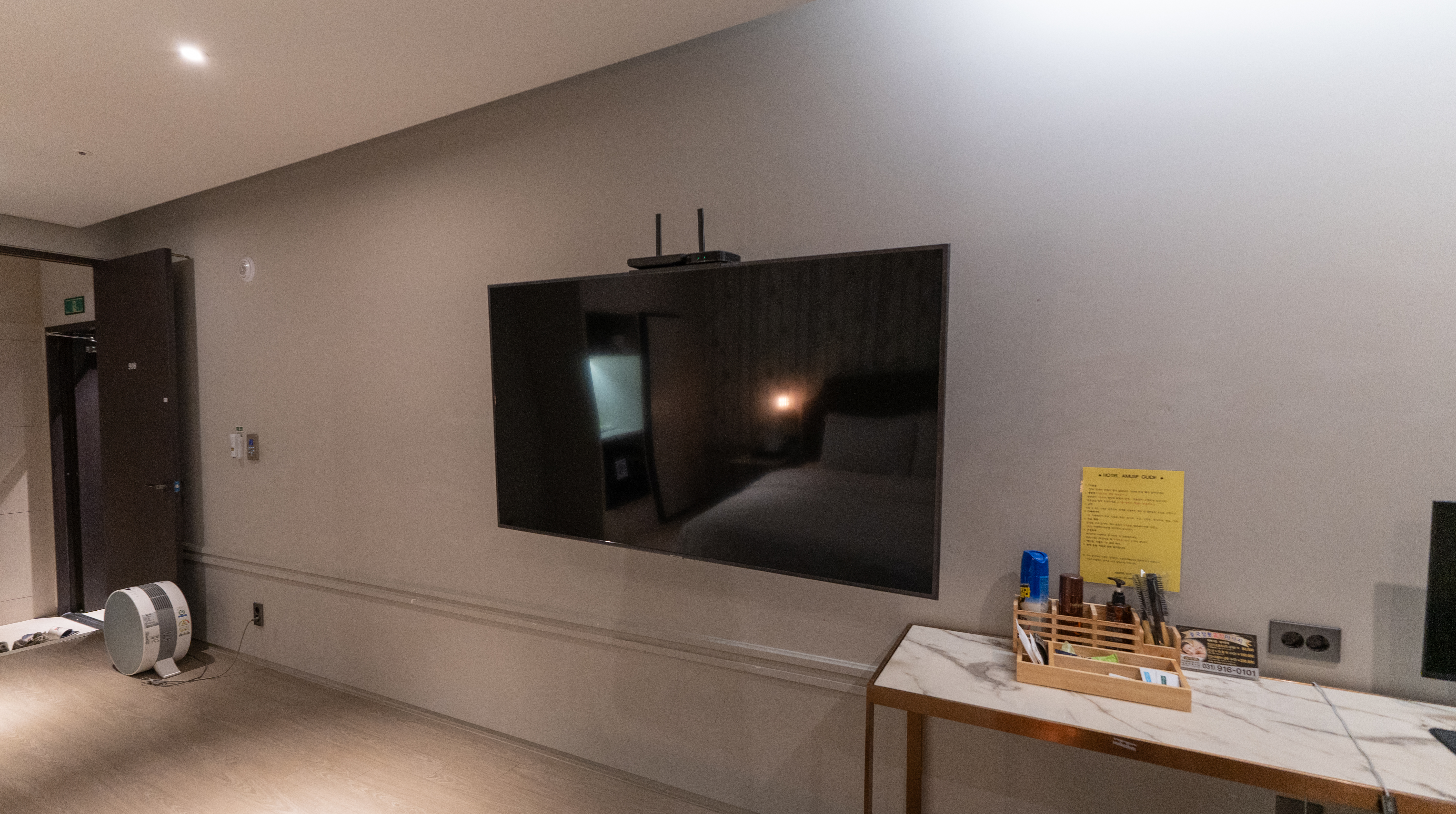 침실에는 65인치 대형 TV와 공기청정기, 스타일러, 커피포트, 냉장고, PC가 있었고, 스타일러와 공기청정기는 보통 잘 관리되는 호텔에만 있는 가전이라 이곳도 꽤 관리가 잘 되는 호텔이라고 할 수 있겠습니다.