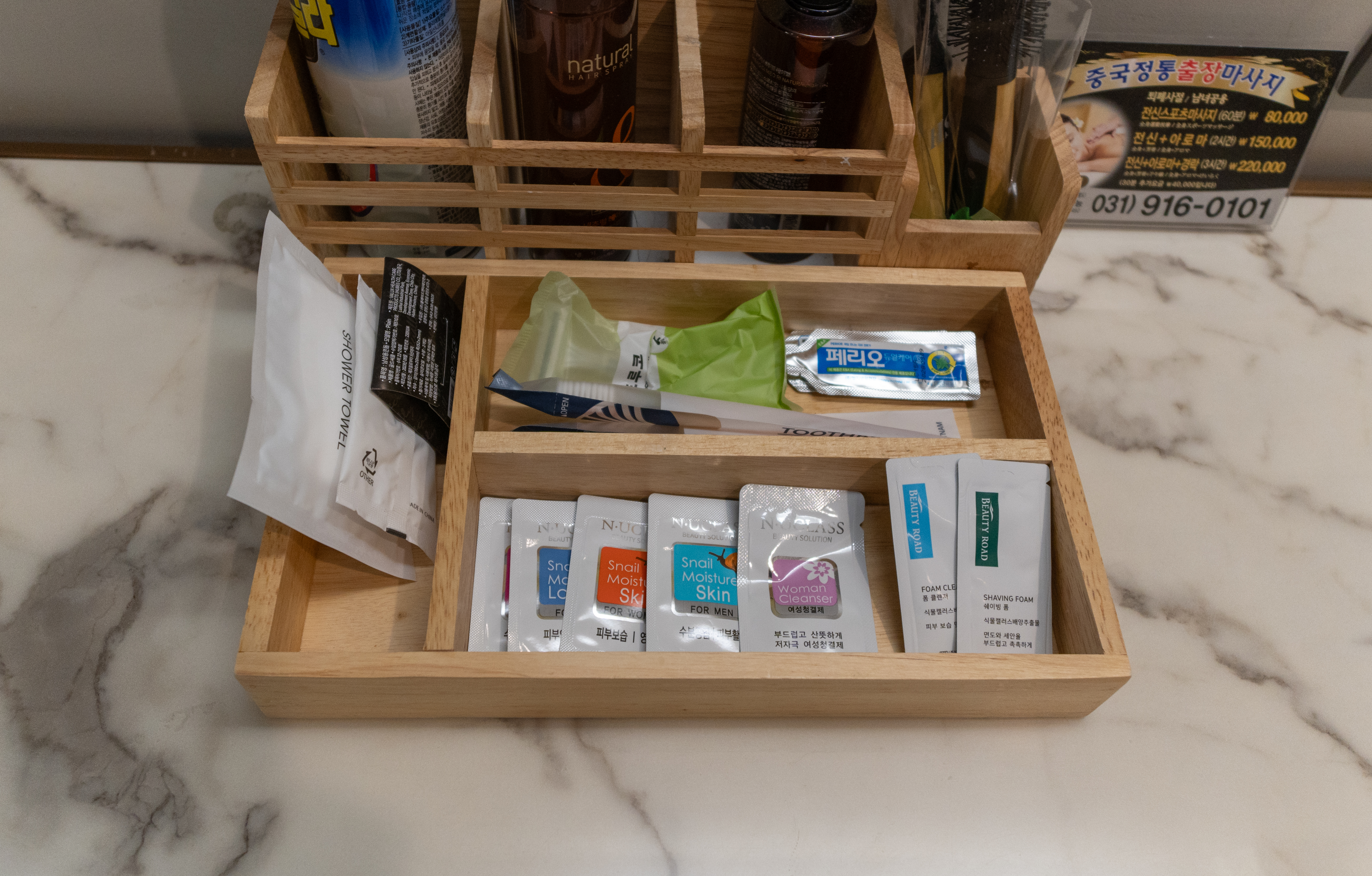그리고 개인 위생용품으로 칫솔, 치약과 샤워타월, 면봉, 폼클렌징, 스킨, 로션등이 있었습니다. 잘 사용할 일은 없지만, 칫솔과 치약을 별도로 가져가지 않아도 되어서 좋았습니다.