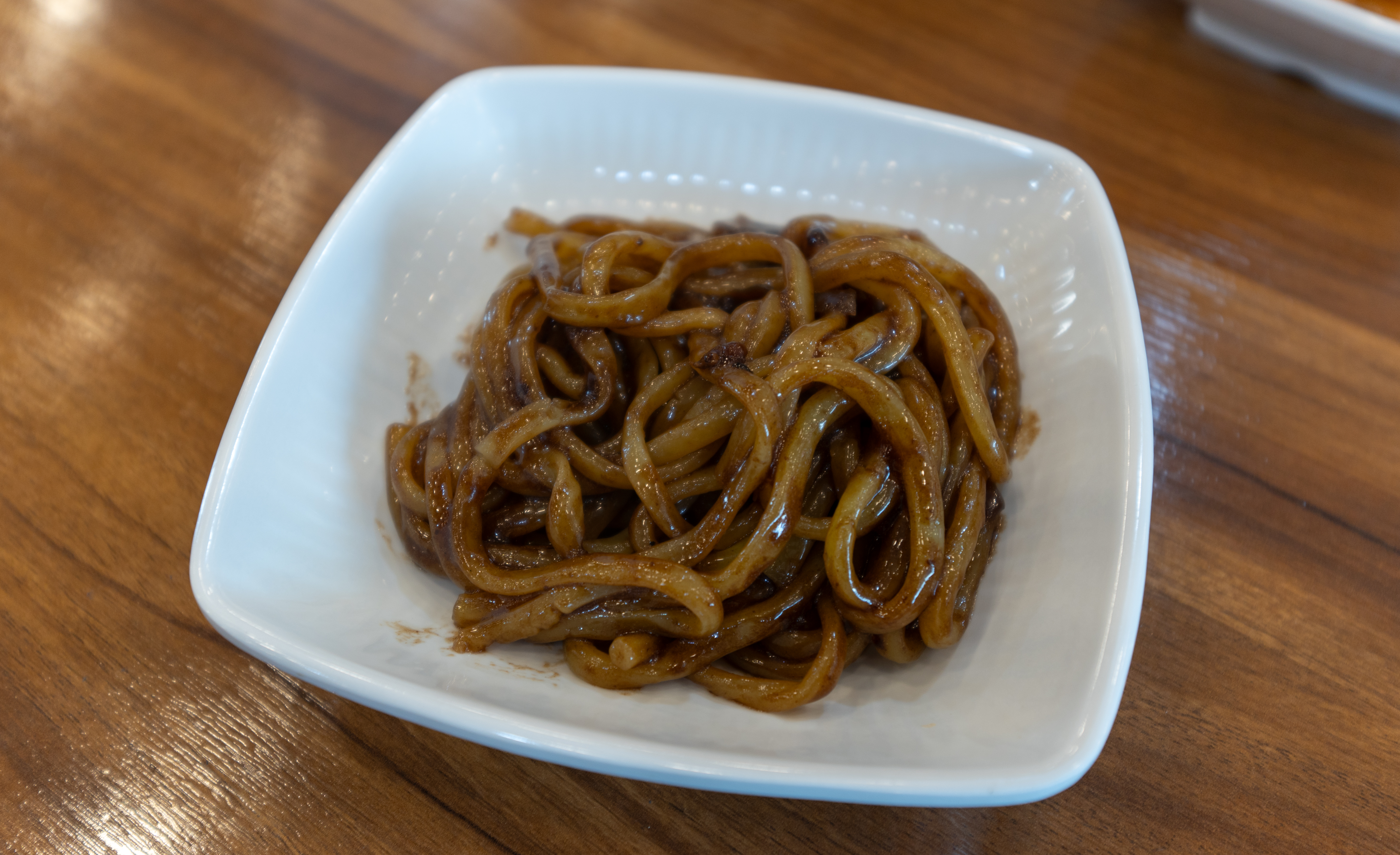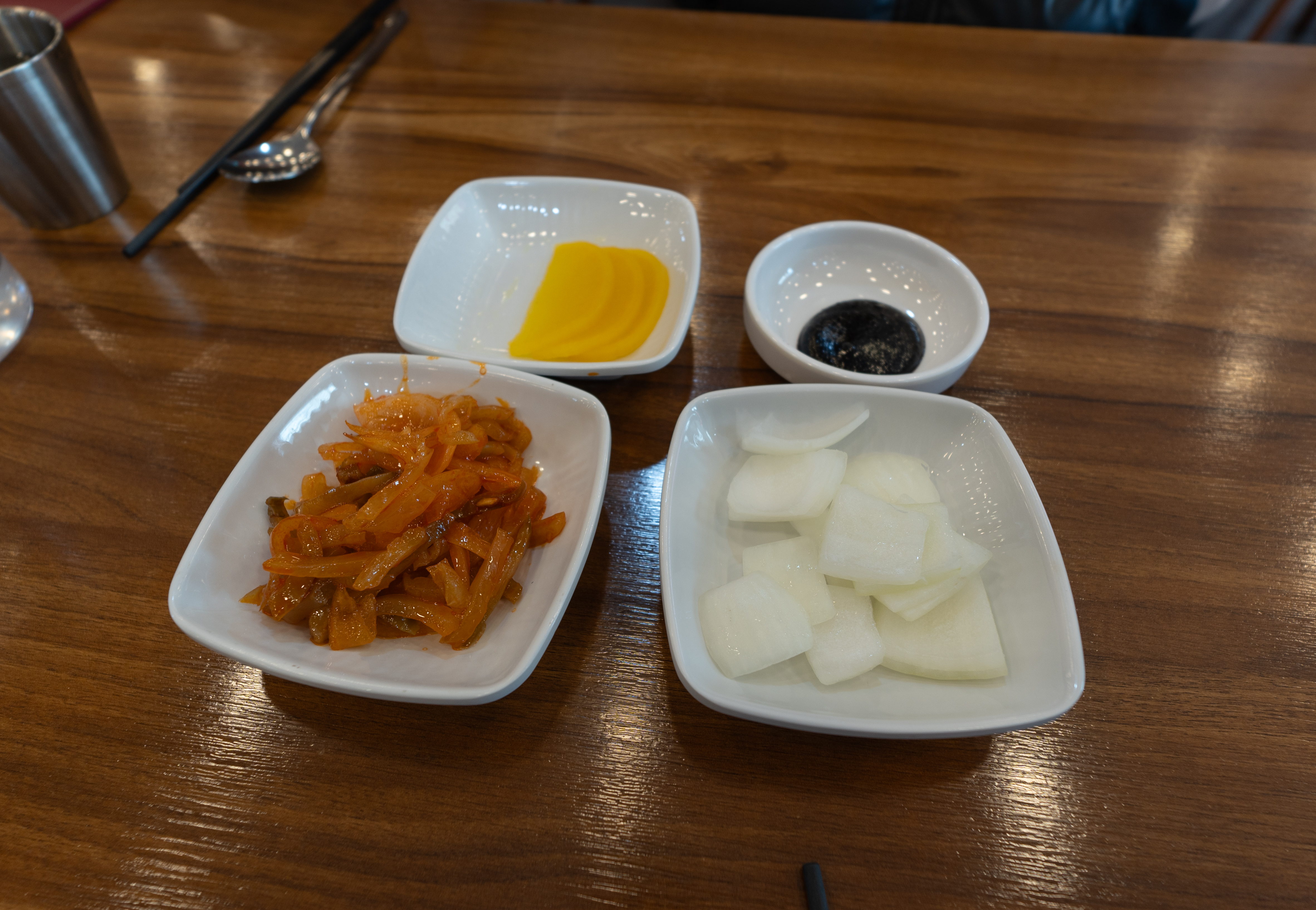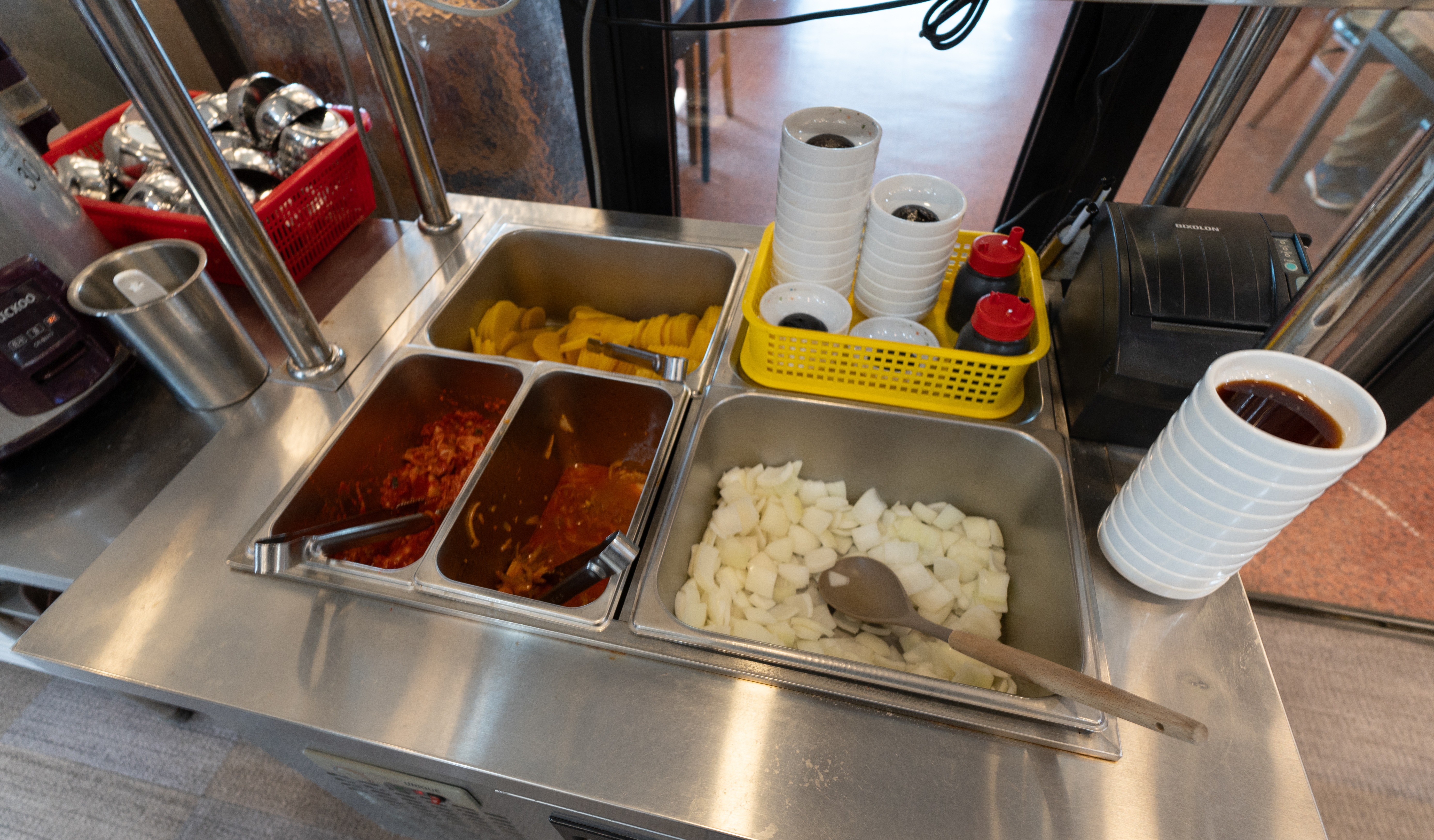 반찬이랑 식기류는 셀프코너에서 직접 가져오면 되었습니다. 저희는 양파, 자차이, 단무지, 춘장을 가져다 먹었고, 이곳에서는 원하는 만큼 밥도 가져다 먹을 수 있도록 되어있었습니다.